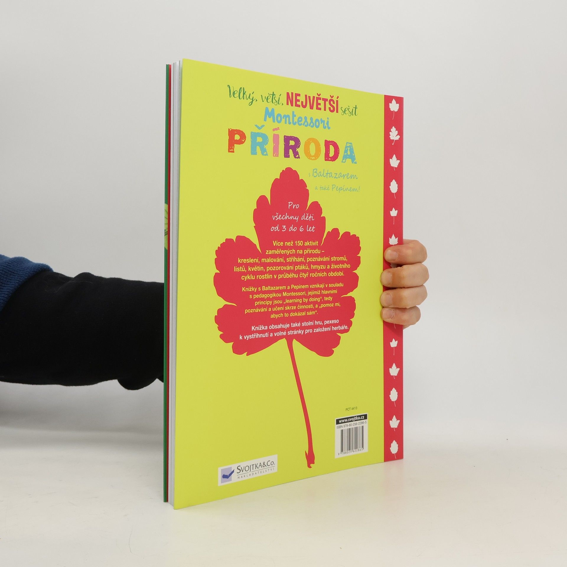 V tomto opravdu velkém sešitu na vás čeká více než 150 aktivit zaměřených na přírodu. Najdete zde kreslení, malování, stříhání, poznávání stromů, listů, květin, pozorování ptáků, hmyzu a životního cyklu rostlin v průběhu čtyř ročních období. Knížkou provázejí sympatické postavičky Baltazara a Pepína. Aktivity jsou vytvořené v souladu s pedagogikou Montessori, jejímiž hlavními principy jsou "learning by doing", tedy poznávání a učení skrze činnosti, a "pomoz mi, abych to dokázal sám" – citlivé vedení dětí k samostatnosti. Sešit obsahuje také stolní hru, pexeso k vystřihnutí a volné stránky pro založení herbáře. Pro všechny děti od tří do šesti let.