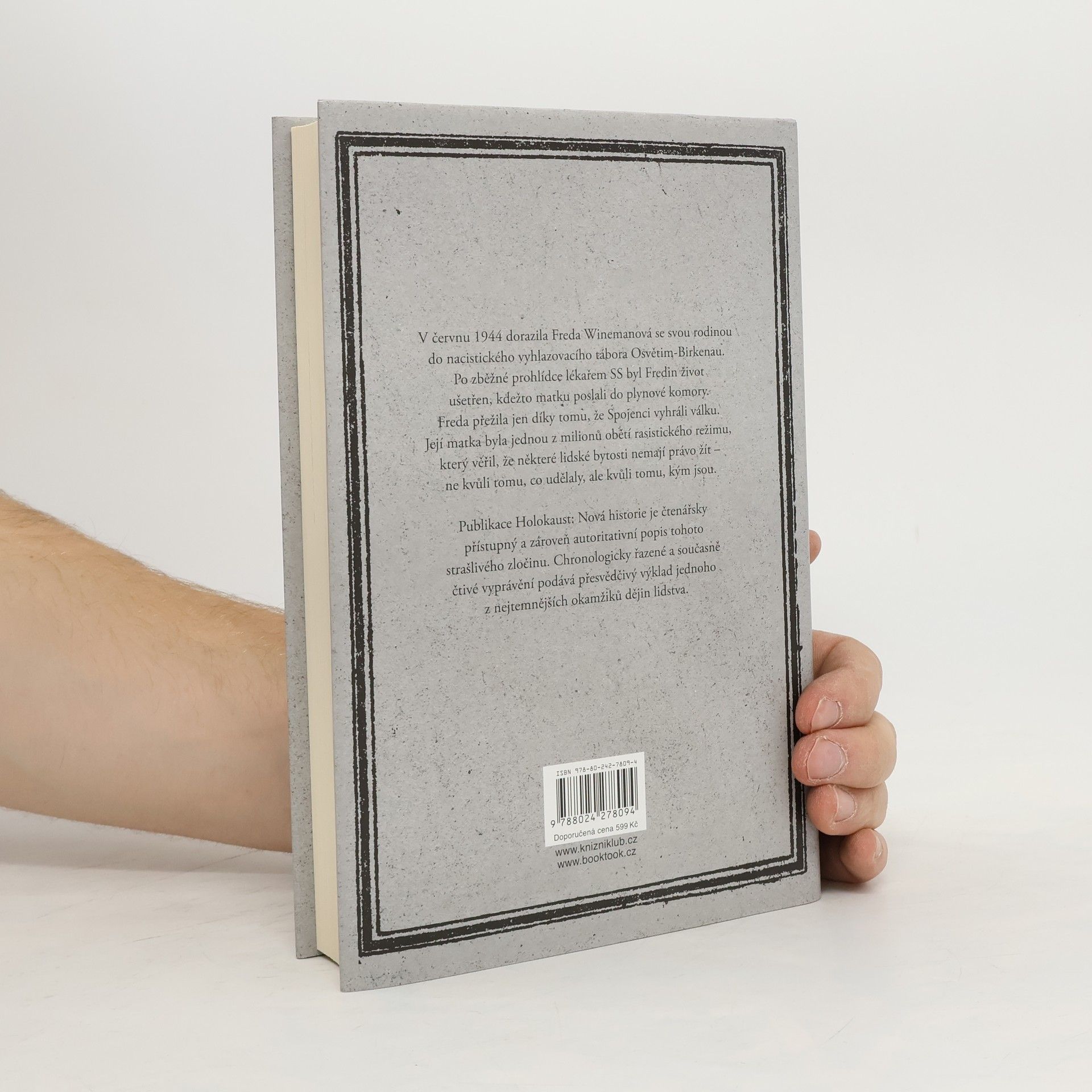 V červnu 1944 dorazila Freda Winemanová se svou rodinou do nacistického vyhlazovacího tábora Osvětim-Birkenau. Po zběžné prohlídce lékařem SS byl Fredin život ušetřen, kdežto matku poslali do plynové komory. Freda přežila jen díky tomu, že Spojenci vyhráli válku. Její matka byla jednou z milionů obětí rasistického režimu, který věřil, že některé lidské bytosti nemají právo žít – ne kvůli tomu, co udělaly, ale kvůli tomu, kým jsou. Publikace Holokaust: Nové historie je čtenářsky přístupný a zároveň autoritativní popis tohoto strašlivého zločinu. Chronologicky řazené a současně čtivé vyprávění podává přesvědčivý výklad jednoho z nejtemnějších okamžiků dějin lidstva.