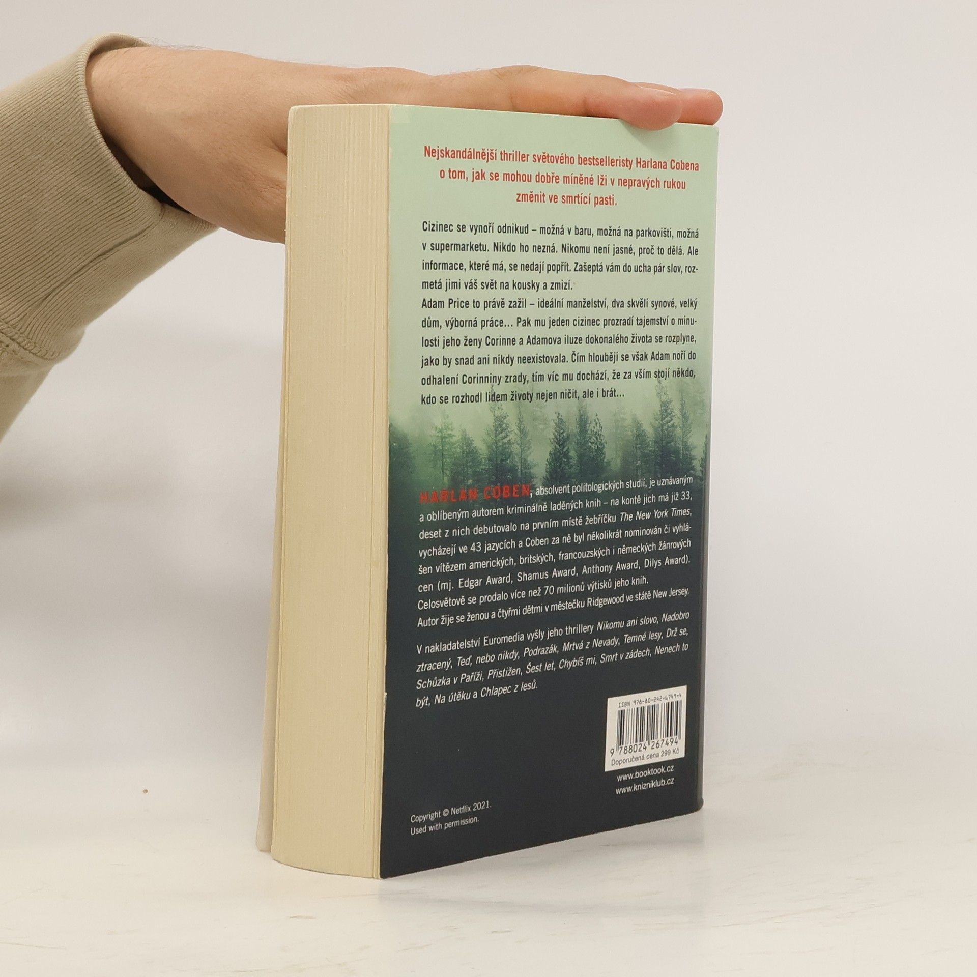 Nejskandálnější thriller světového bestselleristy Harlana Cobena o tom, jak se mohou dobře míněné lži v nepravých rukou změnit ve smrtící pasti. Cizinec se vynoří odnikud – možná v baru, možná na parkovišti, možná v supermarketu. Nikdo ho nezná. Nikomu není jasné, proč to dělá. Ale informace, které má, se nedají popřít. Zašeptá vám do ucha pár slov, rozmetá jimi váš svět na kousky a zmizí. Adam Price to právě zažil – ideální manželství, dva skvělí synové, velký dům, výborná práce… Pak mu jeden cizinec prozradí tajemství o minulosti jeho ženy Corinne a Adamova iluze dokonalého života se rozplyne, jako by snad ani nikdy neexistovala. Čím hlouběji se však Adam noří do odhalení Corinniny zrady, tím víc mu dochází, že za vším stojí někdo, kdo se rozhodl lidem životy nejen ničit, ale i brát…
