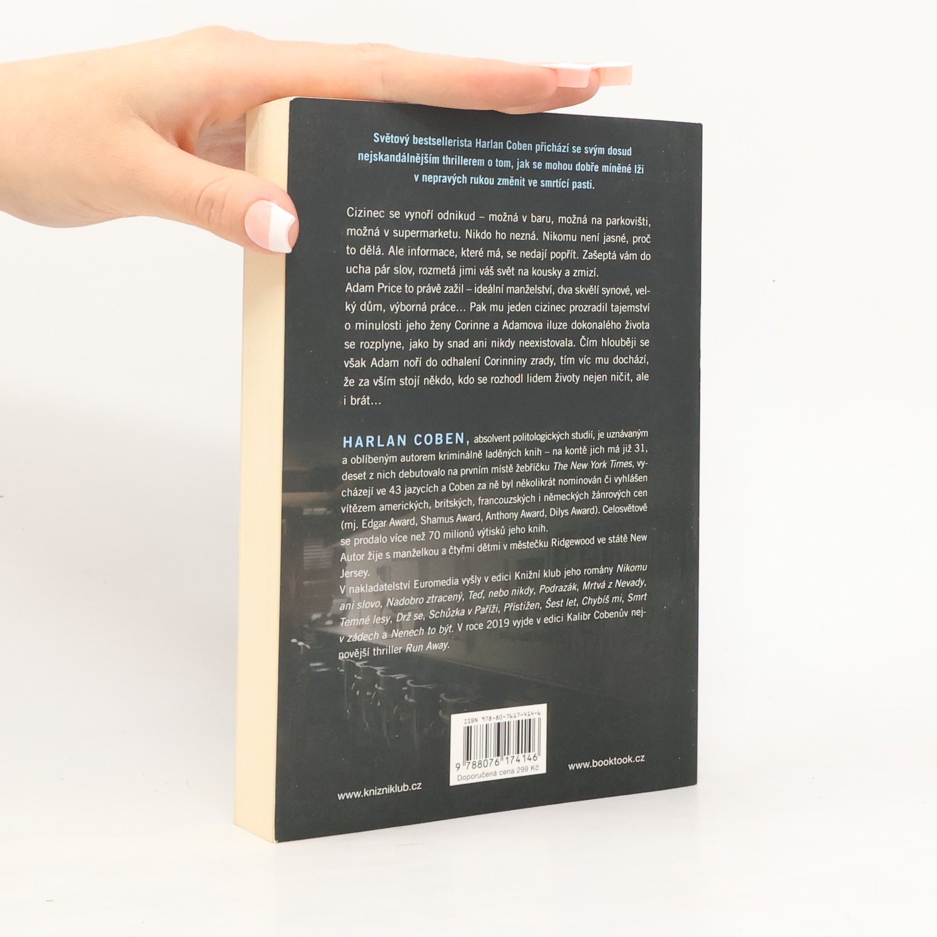 Světový bestsellerista Harlan Coben přichází se svým dosud nejskandálnějším thrillerem o tom, jak se mohou dobře míněné lži v cizích rukou změnit ve smrtící pasti. Cizinec se vynoří odnikud – možná v baru, možná na parkovišti, možná v supermarketu. Nikdo ho nezná. Nikomu není jasné, proč to dělá. Ale informace, které má, se nedají popřít. Zašeptá vám do ucha pár slov, rozmetá jimi váš svět na kousky a zmizí. Adam Price to právě zažil – ideální manželství, dva skvělí synové, velký dům, výborná práce…Pak mu jeden cizinec prozradil tajemství o minulosti jeho ženy Corinne a Adamova iluze dokonalého života se rozplyne, jako by snad ani nikdy neexistovala. Čím hlouběji se však Adam noří do odhalení Corinniny zrady, tím víc mu dochází, že za vším stojí někdo, kdo se rozhodl některým lidem životy nejen ničit, ale i brát…