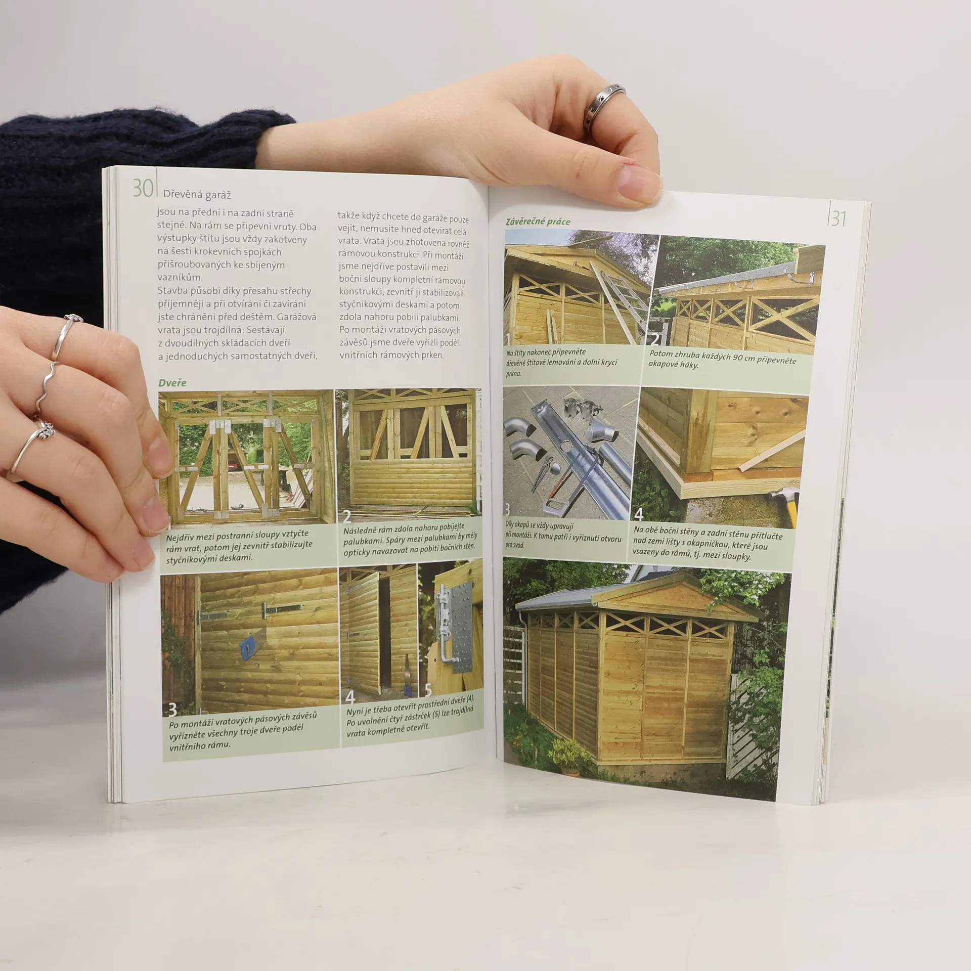 Pomocí názorných obrázků a fotografií je vysvětlena stavba garážového stání, sestavení zakoupené dřevěné kosntrukce, vytvoření kamenné plochy, zastřešení, postavení kůlny na nářadí a stání na kola, sestavení miniskleníku na terasu atd.