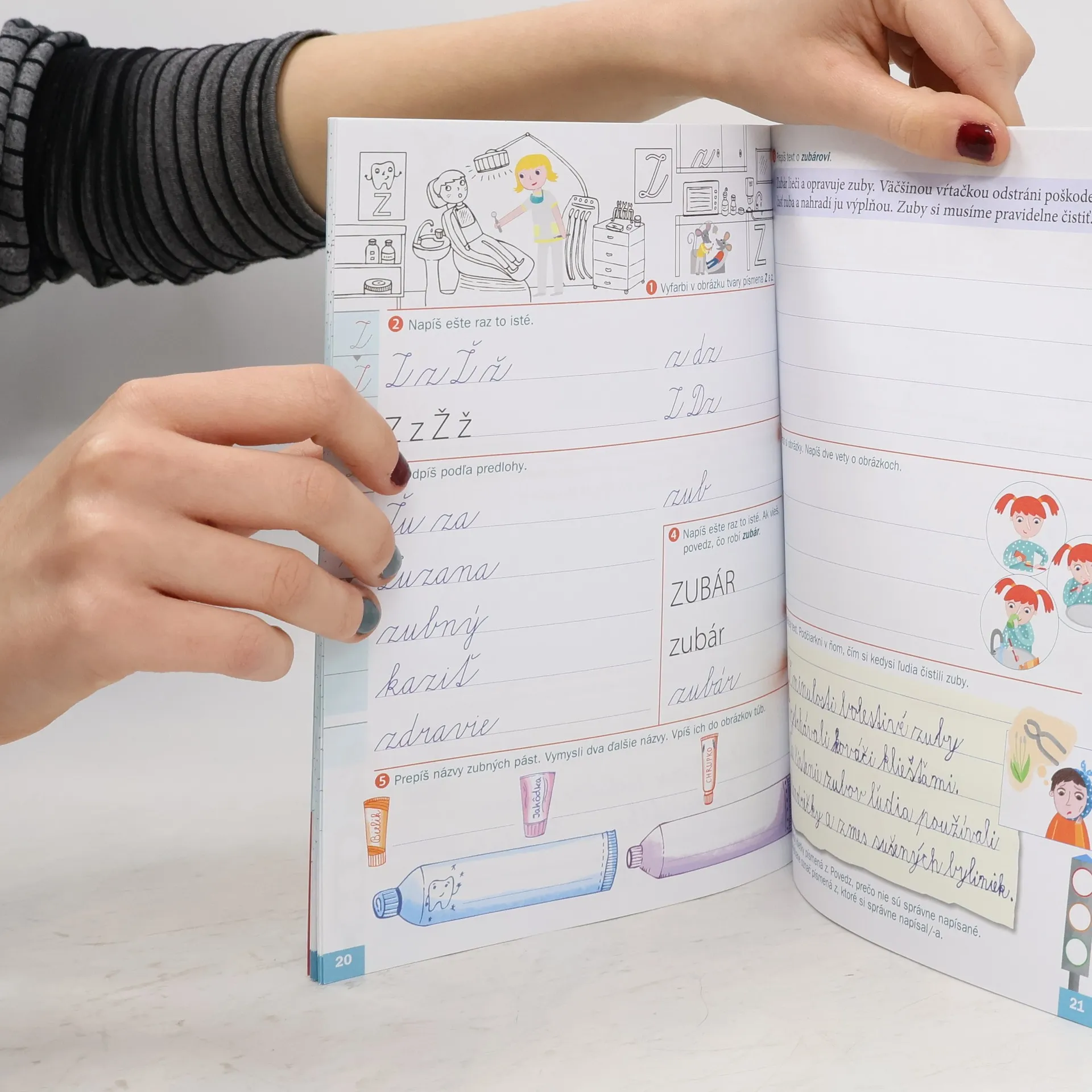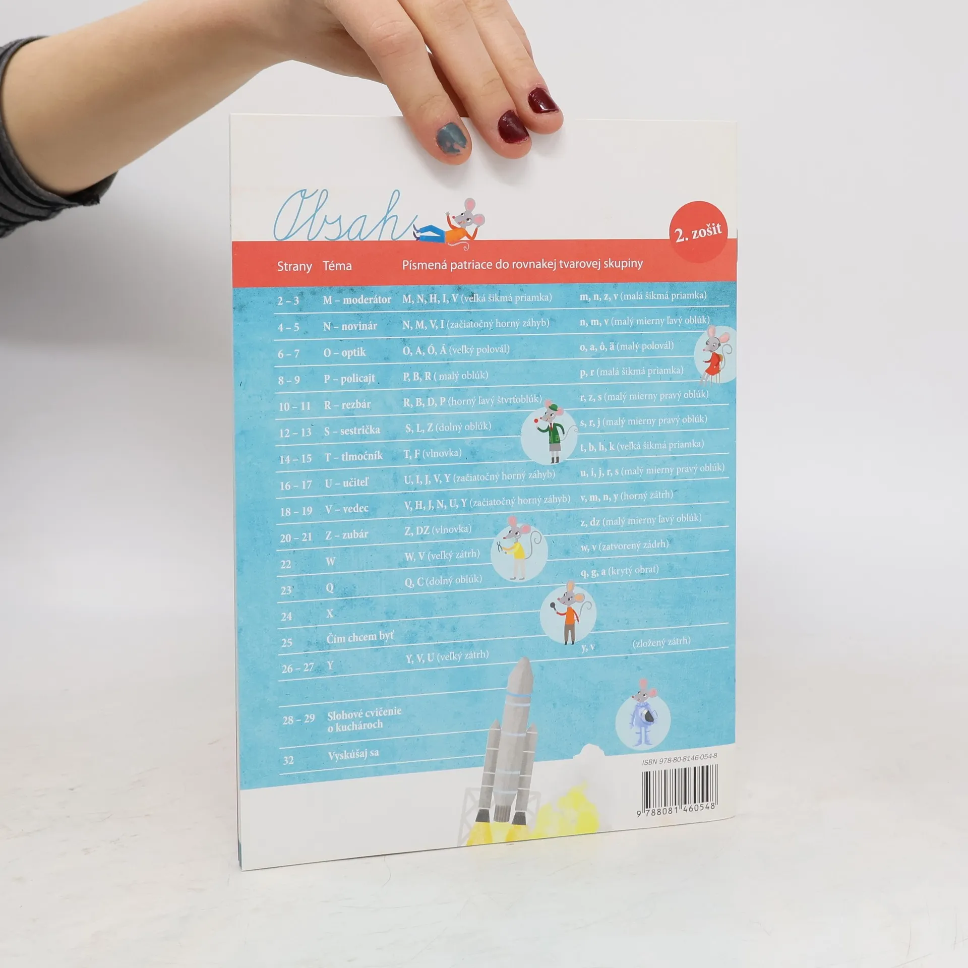 Dvojdielny pracovný zošit, ktorý reaguje na požiadavku učiteľov na precvičovanie pisateľských zručností žiakov a na zdokonaľovanie tvarov všetkých písmen a problémových spojov. Skladá sa zo samostatných dvojstrán, určených jednotlivým písmenám v abecednom poradí, kde si deti postupne precvičujú písané i tlačené tvary písmen a tvarové skupiny. Každé písmeno je podporené didakticky koncipovanou ilustráciou znázorňujúcou povolanie a súvisiacimi úlohami, pomocou ktorých sa zabezpečuje kontakt s realitou a spoznávanie sociálneho prostredia. Úlohy sú zamerané na primerané písanie, odpis a prepis textov, ale aj na čítanie textov a rozvoj spôsobilosti tvoriť vety. Zaujímavým prvkom je čítanie autentických detských rukopisov a pokus o autokorekciu.