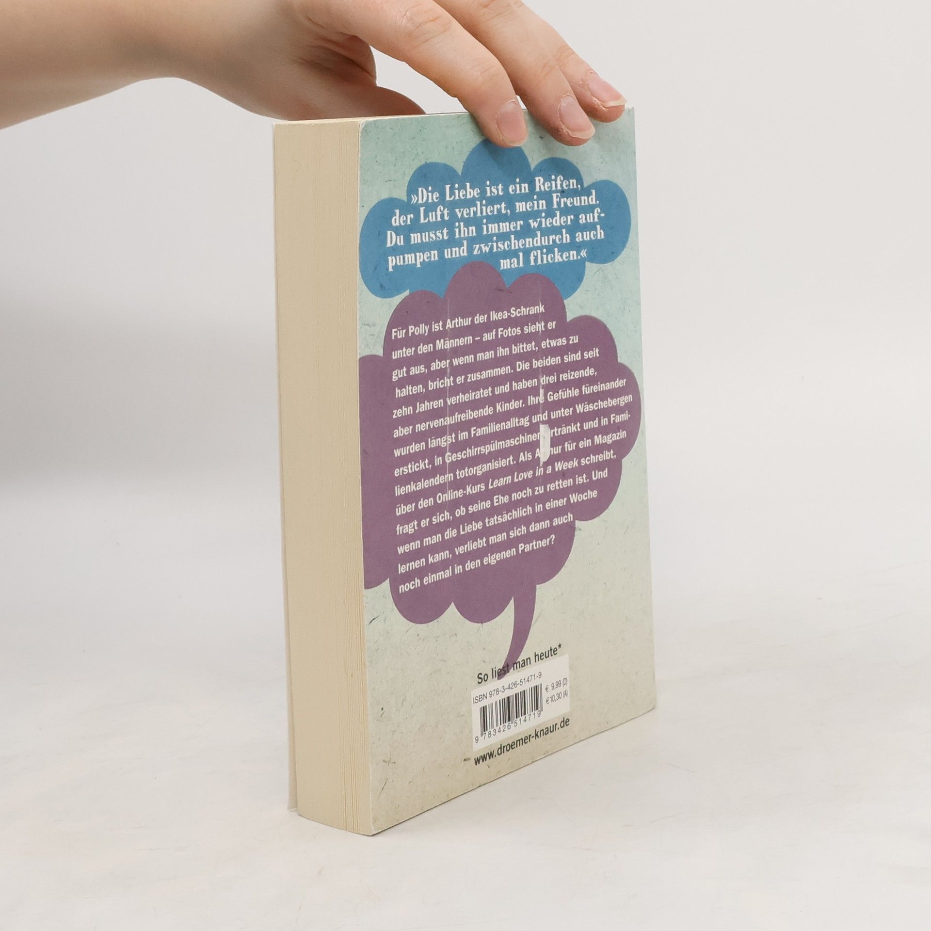 „Die Liebe ist ein Reifen, der Luft verliert, mein Freund. Du musst ihn immer wieder aufpumpen und zwischendurch auch mal flicken.“ Für Polly ist Arthur der Ikea-Schrank unter den Männern – auf Fotos sieht er gut aus, aber wenn man ihn bittet, etwas zu halten, bricht er zusammen. Die beiden sind seit zehn Jahren verheiratet und haben drei reizende, aber nervenaufreibende Kinder. Ihre Gefühle füreinander wurden längst im Alltag und unter Wäschebergen erstickt, in Geschirrspülmaschinen ertränkt und in Familienkalendern totorganisiert. Als Arthur für ein Magazin über den Online-Kurs „Learn Love In A Week“ schreibt, fragt er sich, ob seine Ehe noch eine Chance hat. Und wenn man die Liebe tatsächlich in einer Woche lernen kann, verliebt man sich dann auch noch einmal in den eigenen Partner?