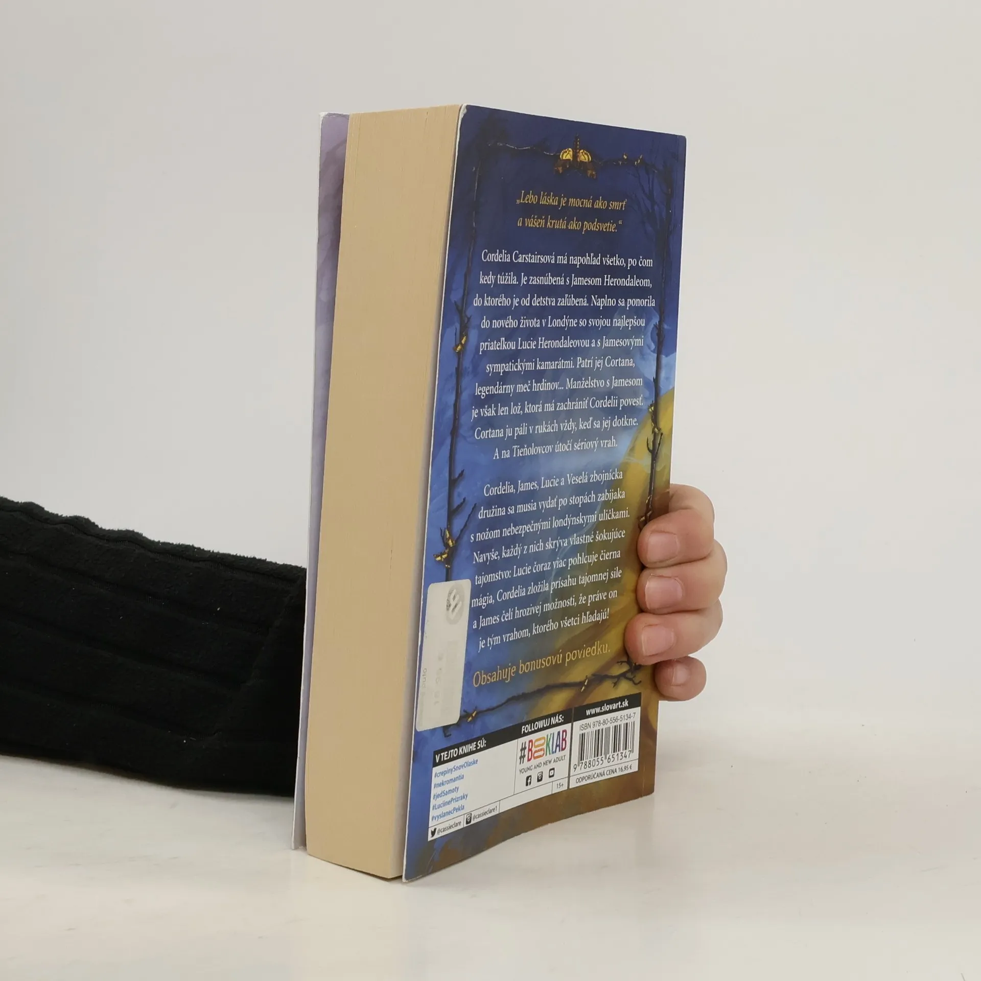 Druhý diel novej série zo sveta Tieňolovcov, ktorej výnimoční hrdinovia si získali srdcia čitateľov na celom svete! Na prvý pohľad sa zdá, že Cordelia Carstairsová má všetko, po čom kedy túžila. Je zasnúbená s Jamesom Herondaleom, do ktorého je od detstva zaľúbená. Naplno sa ponorila do nového života v Londýne so svojou najlepšou priateľkou Lucie Herondaleovou a s Jamesovými sympatickými kamarátmi z Veselej zbojníckej družiny. Čoskoro sa znova stretne s milovaným otcom. A patrí jej Cortana, legendárny meč hrdinov. Realita je však oveľa pochmúrnejšia. Jamesove a Cordeliino manželstvo je lož, ktorá má zachrániť Cordelii povesť. James je zaľúbený do záhadnej Grace Blackthornovej, ktorej brat Jesse zomrel pred mnohými rokmi pri hroznej nehode. Cortana Cordeliu páli v rukách vždy, keď sa jej dotkne. Cordeliin otec je zatrpknutý a nahnevaný. A na londýnskych Tieňolovcov útočí sériový vrah, ktorý vraždí pod rúškom tmy...