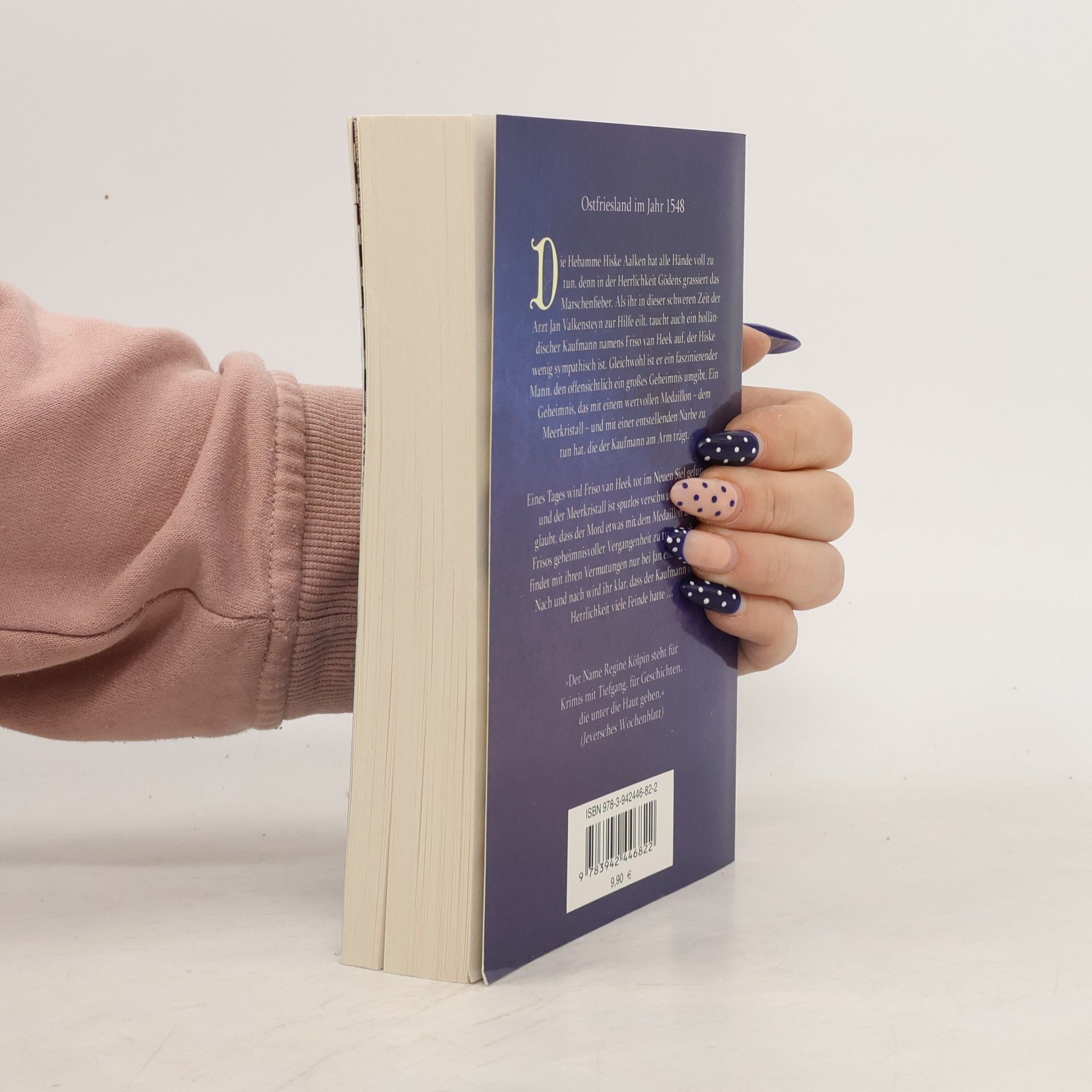 Ostfriesland 1548 - Die Hebamme Hiske Aalken hat alle Hände voll zu tun, denn in der Herrlichkeit Gödens grassiert das Marschenfieber.Als ihr in dieser schweren Zeit der Arzt Jan Valkensteyn zur Hilfe eilt, taucht auch ein holländischer Kaufmann namens Friso van Heek auf, der Hiske wenig sympathisch ist. Gleichwohl ist er ein faszinierender Mann, den offensichtlich ein großes Geheimnis umgibt. Ein Geheimnis, das mit einem wertvollen Medaillon dem Meerkristall und mit einer entstellenden Narbe zu tun hat, die der Kaufmann am Arm trägt.Eines Tages wird Friso van Heek tot im Neuen Siel gefunden, und der Meerkristall ist spurlos verschwunden. Hiske glaubt, dass der Mord etwas mit dem Medaillon und mit Frisos geheimnisvoller Vergangenheit zu tun hat, aber sie findet mit ihren Vermutungen nur bei Jan ein offenes Ohr. Nach und nach wird ihr klar, dass der Kaufmann in der Herrlichkeit viele Feinde hatte