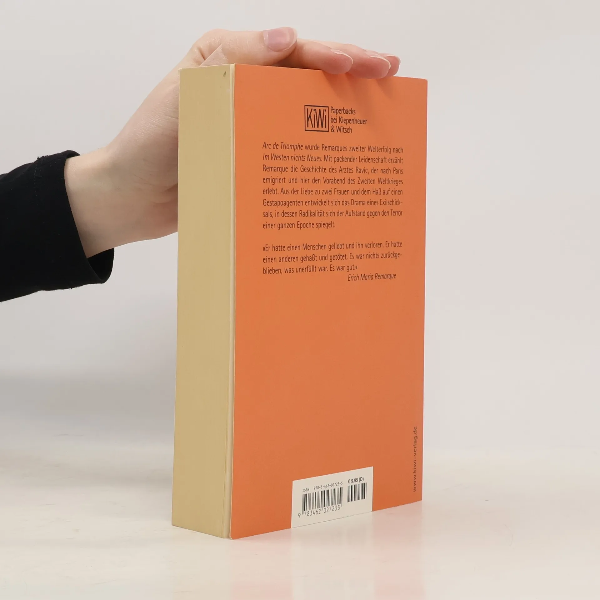 Arc de Triomphe wurde Remarques zweiter Welterfolg nach Im Westen nichts Neues: Mit packender Leidenschaft erzählt Remarque die Geschichte des Arztes Ravic, der nach Paris emigriert und hier den Vorabend des Zweiten Weltkrieges erlebt. Aus Liebe zu zwei Frauen und dem Hass auf einen Gestapoagenten entwickelt sich das Drama eines Exilschicksals, in dessen Realität sich der Aufstand gegen den Terror einer ganzen Poche spiegelt. Paris, am Vorabend des Zweiten Weltkrieges: Hier trifft der aus Deutschland geflohene Arzt Ravic den Gestapo-Agenten Haake wieder, der seine Frau zu Tode gefoltert hat. Ravic sinnt auf Rache und lockt Haake in eine tödliche Falle...