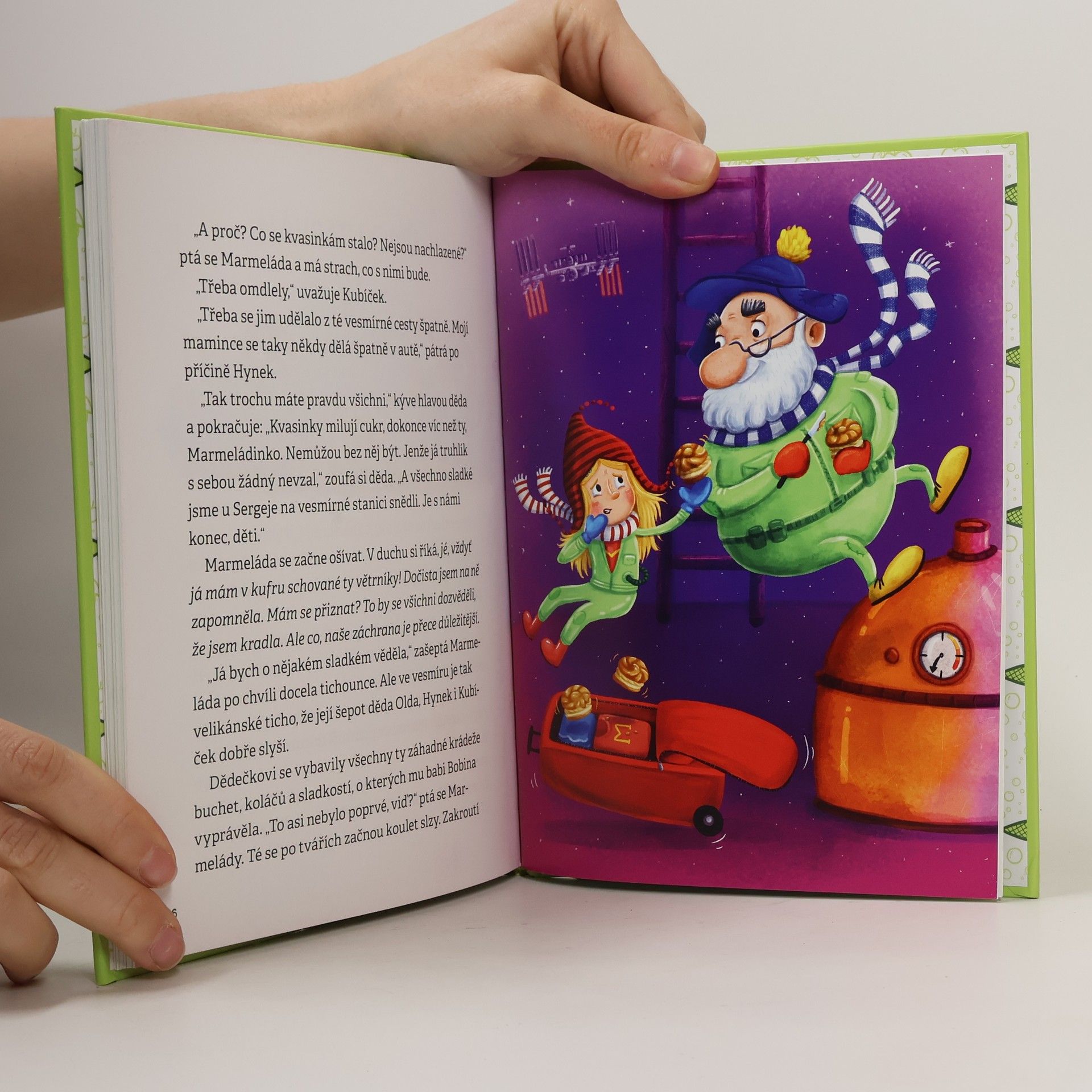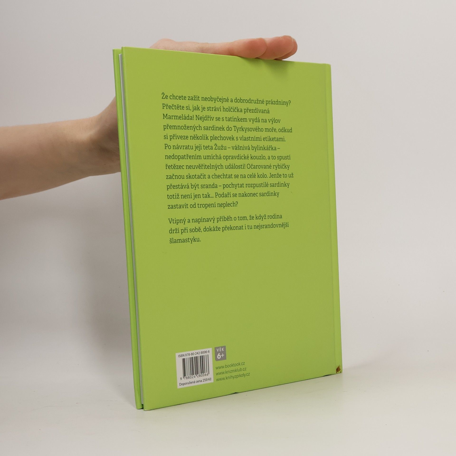 Ne každému se podaří prožít tak neobyčejné a dobrodružné prázdniny jako holčičce přezdívané Marmeláda! Nejprve se s tatínkem, majitelem konzervárny, vydá na výlov přemnožených sardinek do Tyrkysového moře, odkud si přiveze několik plechovek s vlastními etiketami. Po návratu její teta Žužu – vášnivá bylinkářka – nedopatřením umíchá opravdické kouzlo, čímž se spustí řetězec neuvěřitelných událostí! Kouzlo očaruje také sardinky v Marmeládiných plechovkách, a tak místo aby si je celá rodina dala v klidu k obědu, vyskáčou rybičky z plechovek, začnou zlobit a nedají se zastavit. Jenže to už přestává být sranda… Pochytat rozpustilé sardinky totiž není jen tak. Snaha vystřelit je do vesmíru, a nadobro se jich tím zbavit, selže, když je na mezinárodní vesmírné stanici uloví osamělý astronaut. Marmeládin děda – zapálený vědec a vynálezce – proto narychlo vymyslí raketu z želé a letí mu spolu s vnoučaty na pomoc. Podaří se jim sardinky zastavit od tropení neplech? Vtipný a napínavý příběh se sci-fi prvky vyprávějící o tom, že když rodina drží při sobě, dokáže překonat i tu nejsrandovnější šlamastyku. Vhodné pro děti od 6 let.