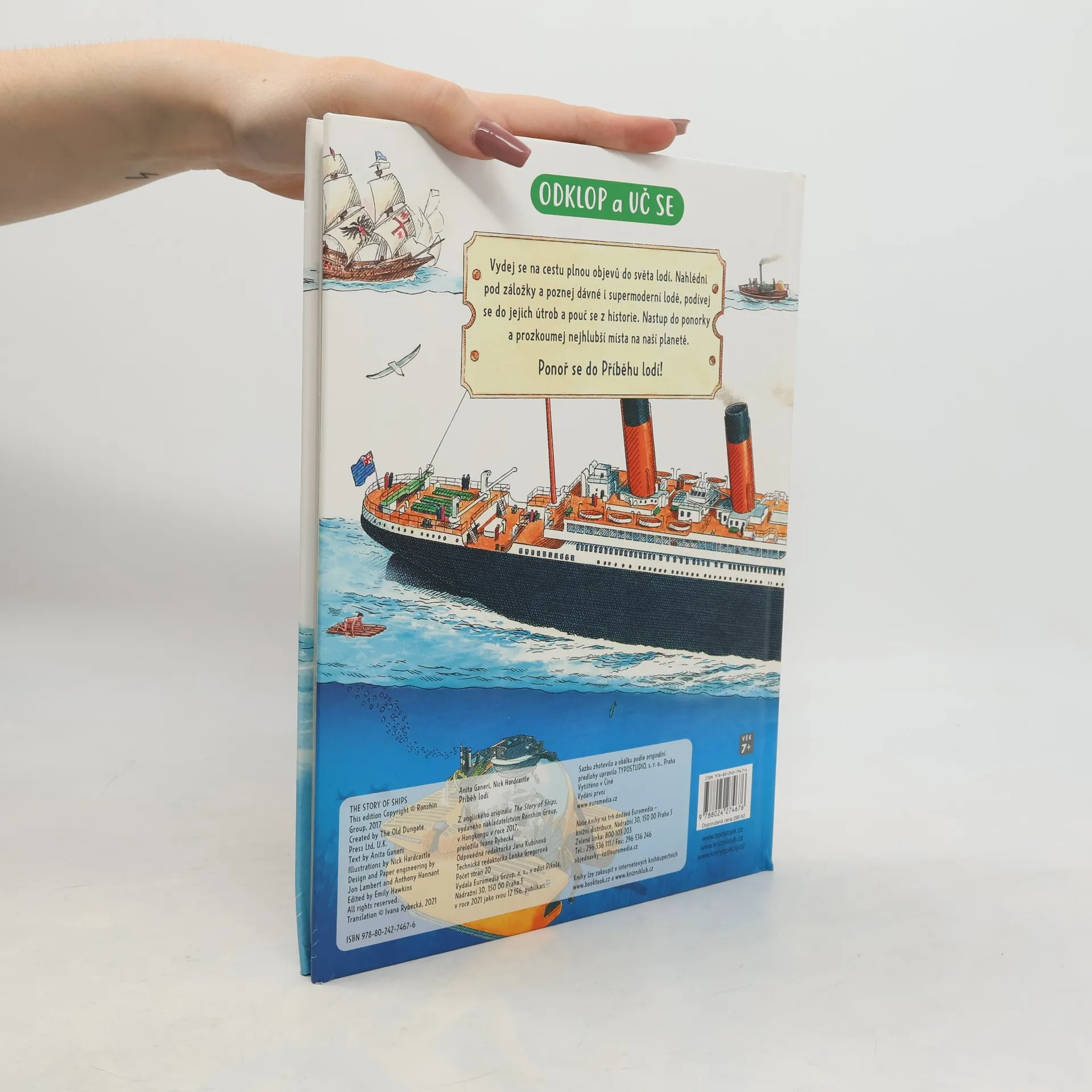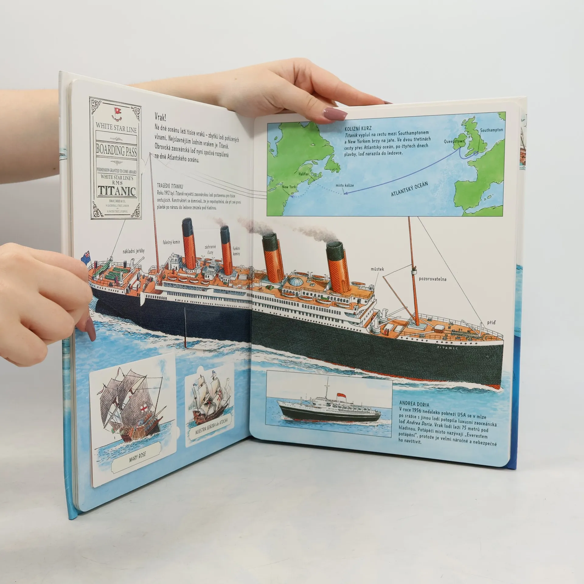 Již po staletí brázdí lidstvo moře a oceány - koráby, bárky, válečné a obchodní lodě, parníky a moderní letadlové lodě... Nahlédni pod více než 76 okének a zjisti, jaké lodě pokořily světová moře. Vydej se za objevy s nejznámějšími mořeplavci a poznej, jak to chodilo na zaoceánských parnících. Prozkoumej palubu i podpalubí Titaniku a odhal tajemství jeho zkázy. Možná se i nachomýtneš k pravé námořní bitvě. Pro děti od 7 let.