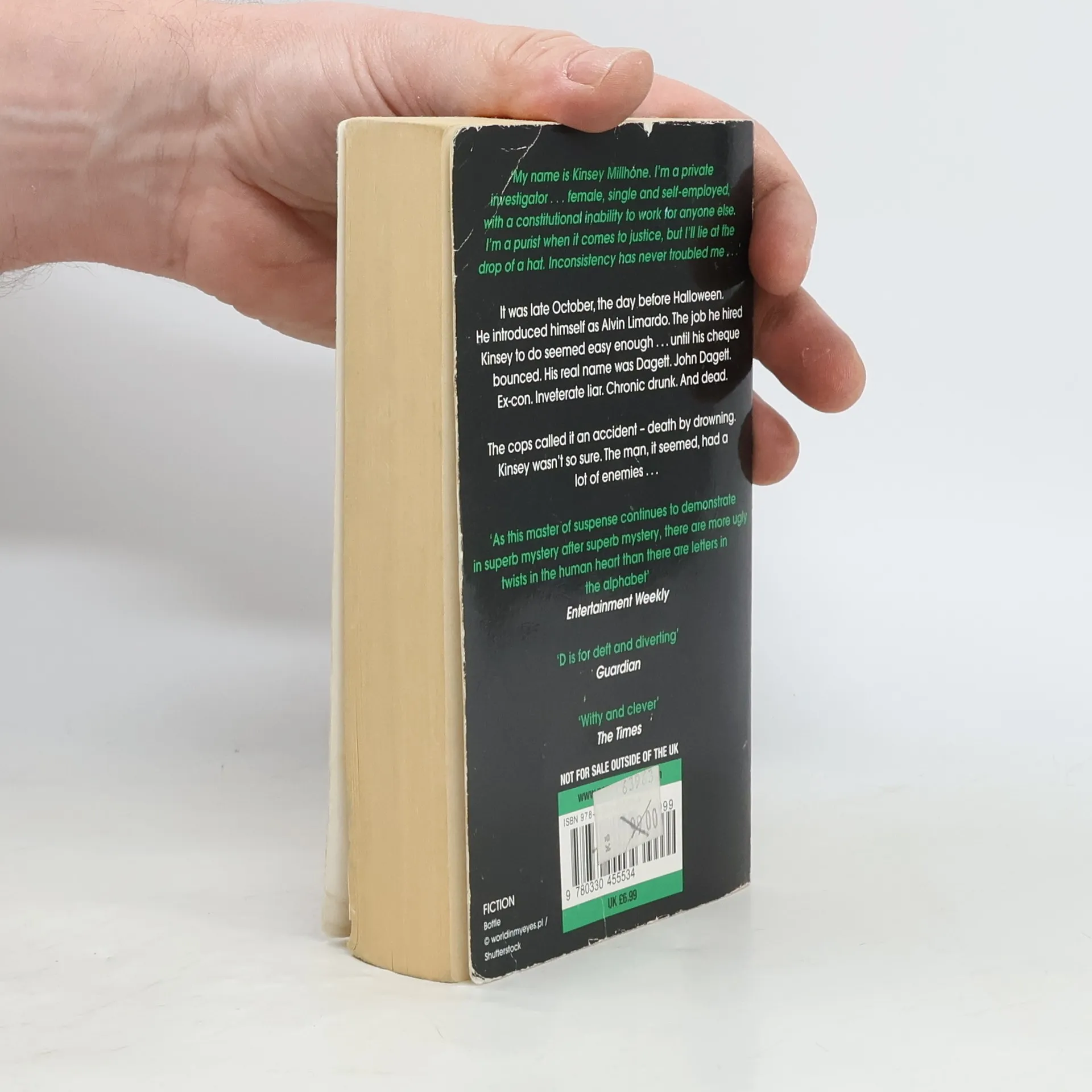 When Alvin Limardo walks into P.I. Kinsey Millhone's office, she smells bad news. He wants Kinsey to deliver $25,000. The recipient: A fifteen-year-old boy. It's a simple matter. So simple that Kinsey wonders why he doesn't deliver the money himself. She's almost certain something is off. But with rent due, Kinsey accepts Limardo's retainer against her better judgment… When Limardo's check bounces, Kinsey discovers she's been had big time. Alvin Limardo is really John Daggett—an ex-con with a drinking problem, two wives to boot, and a slew of people who would like to see him dead. Now Kinsey is out four hundred dollars and in hot pursuit of Daggett. When Daggett's corpse shows up floating in the Santa Teresa surf, the cops rule the death an accident. Kinsey thinks it's murder. But seeking justice for a man who everyone seemed to despise is going to be a lot tougher than she bargained for—and what awaits her at the end of the road is much more disturbing than she could've ever imagined…