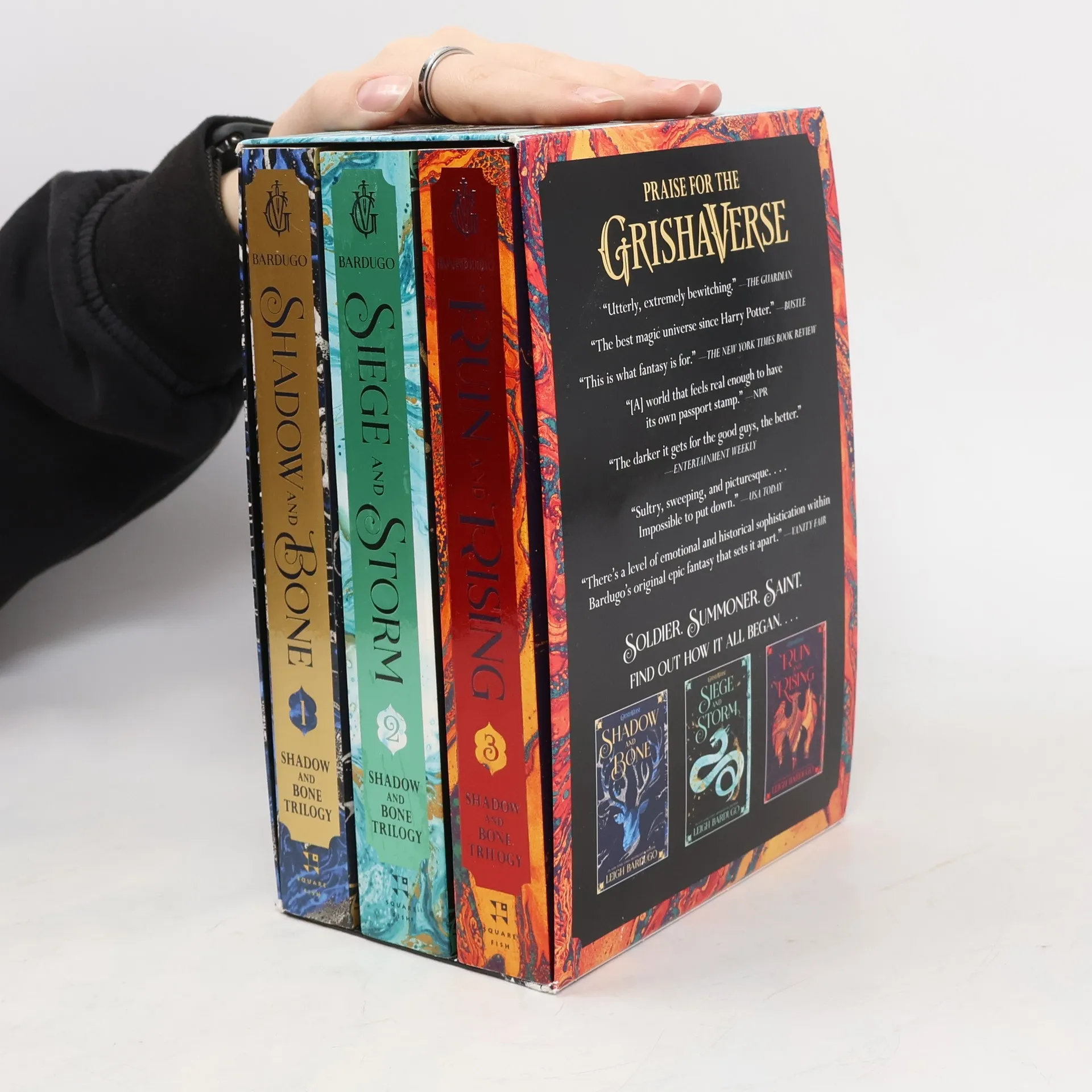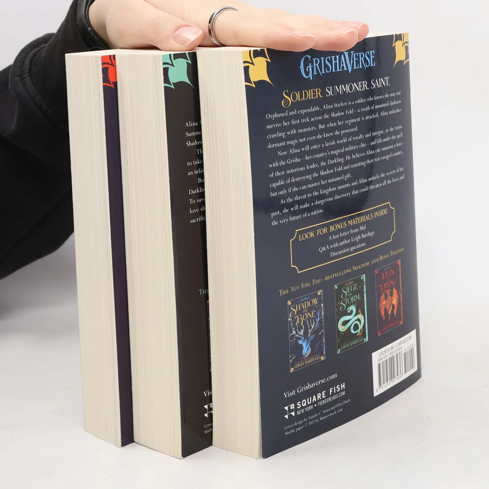 Soldier. Summoner. Saint. Follow Alina Starkov through Shadow and Bone, Siege and Storm, and Ruin and Rising as she discovers her dormant powers and is swept up in a world of luxury and illusion. As Alina struggles to fit into her new life, a threat to the kingdom of Ravka grows--one that will test old alliances and challenge the very limits of magic, one that will forge a leader from a frightened girl