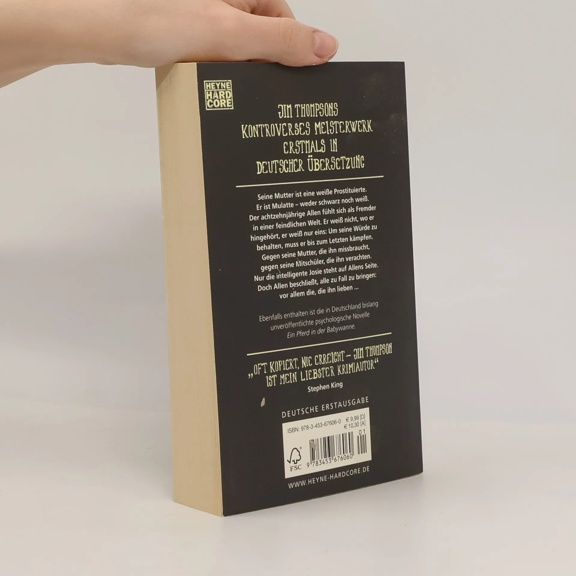 Ich liebe euren Hass! Seine Mutter ist eine weisse Prostituierte. Er ist Mulatte - weder schwarz noch weiss. Der achtzehnjährige Allen fühlt sich als Fremder in einer feindlichen Welt. Er weiss nicht, wo er hingehört, er weiss nur eins: Um seine Würde zu behalten, muss er bis zum Letzten kämpfen. Gegen seine Mutter, die ihn missbraucht, gegen seine Mitschüler, die ihn verachten. Nur die intelligente Josie steht auf Allens Seite. Doch Allen beschliesst, alle zu Fall zu bringen: vor allem die, die ihn lieben ... Jim Thompson wurde 1906 in Anadarko, Oklahoma, als James Myers Thompson geboren. Er begann früh zu trinken und schlug sich als Glücksspieler, Sprengstoffexperte, Ölarbeiter und Alkoholschmuggler durch. Obwohl er mit bereits 15 Jahren seine erste Kriminalgeschichte verkauft hatte, konnte er erst seit Beginn der fünfziger Jahre vom Schreiben leben. Für Hollywood verfasste er zahlreiche Drehbücher, u.a. für so namhafte Regisseure wie Stanley Kubrick. Thompson gilt als zentraler Vertreter des Noir-Genres. Er starb 1977 in Los Angeles, seine Asche wurde im Pazifischen Ozean verstreut.