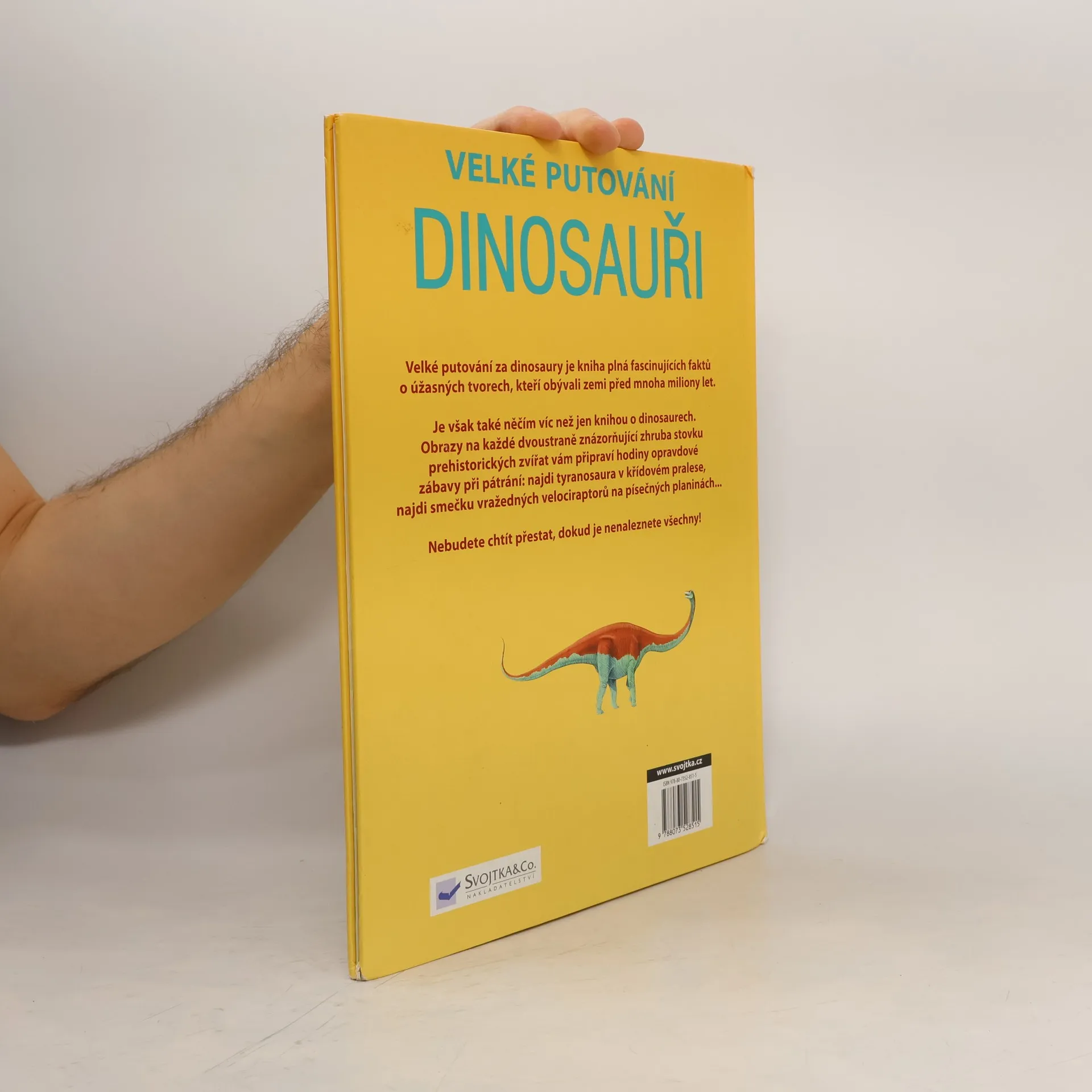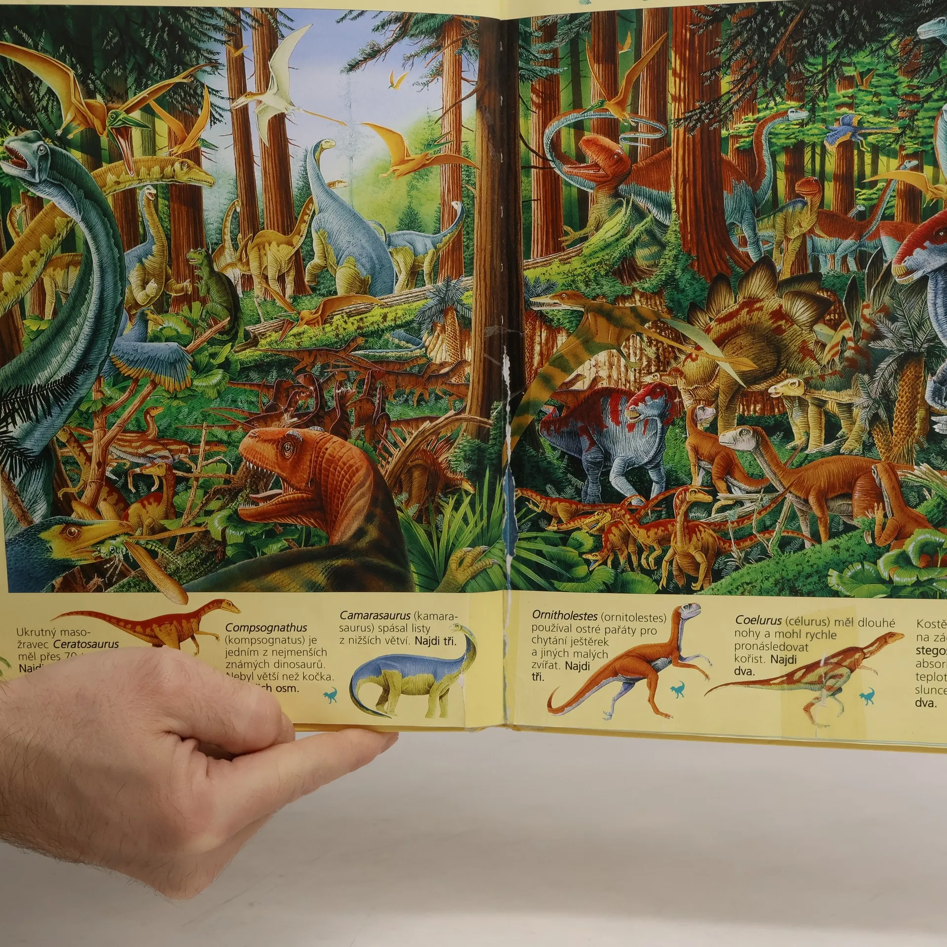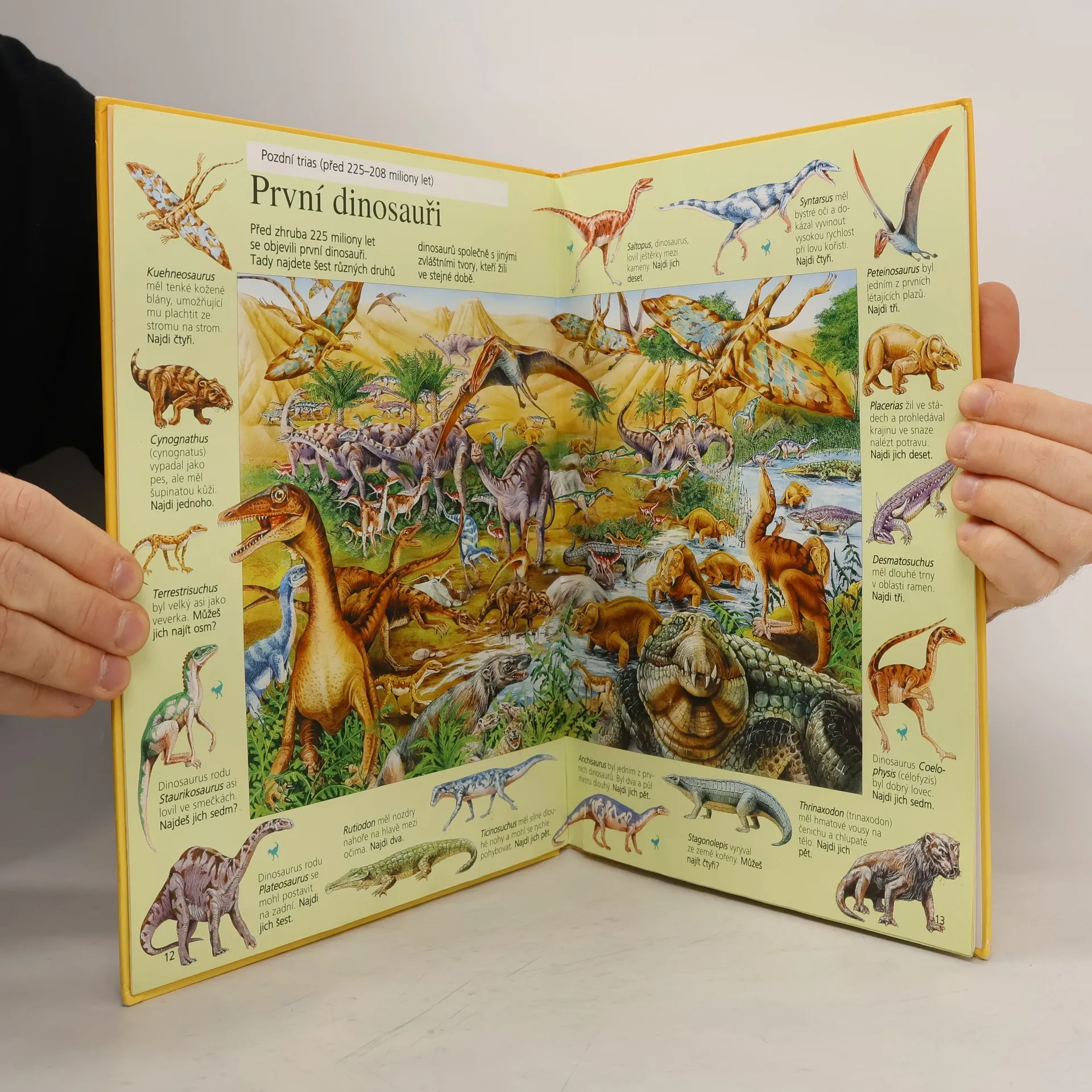 Tato kniha je celá o dinosaurech a světě, ve kterém žili. Je to ale také vzrušující knížka hádanek. Když se na obrázky pozorně podíváš, najdeš stovky dinosaurů a tvorů, kteří v té době žili. Na každém velkém obrázku lze nalézt až 100 zvířat. Pokud neznáš odpověď, najdeš ji v klíči na posledních stranách knihy. S touto knížkou se nejen něco naučíš, ale užiješ si i mnoho zábavy!