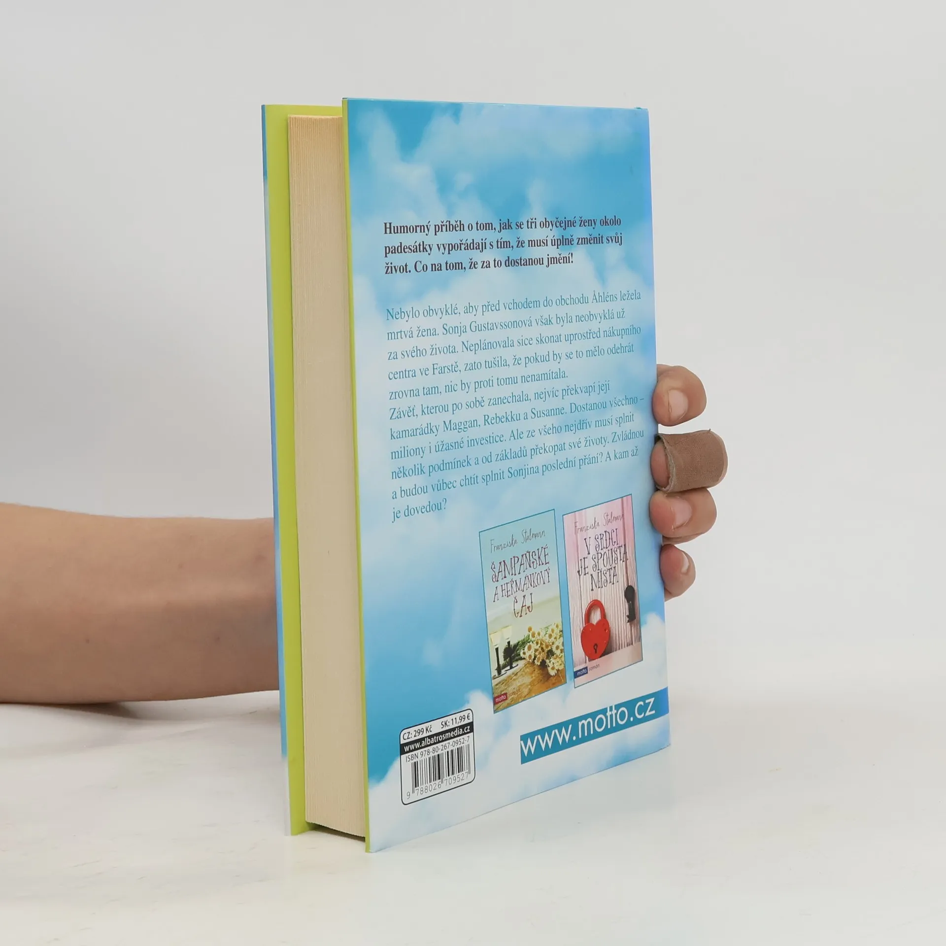 Nebylo obvyklé, aby před vchodem do obchodu Ahléns ležela mrtvá žena. Sonja Gustavssonová však byla neobvyklá už za svého života. Neplánovala sice skonat uprostřed nákupního centra ve Farstě, zato tušila, že pokud by se to mělo odehrát zrovna tam, nic by proti tomu nenamítala. Závěť, kterou po sobě zanechala, nejvíc překvapí její kamarádky Maggan, Rebekku a Susanne. Dostanou všechno – miliony i úžasné investice. Ale ze všeho nejdřív musí splnit několik podmínek a od základů překopat své životy. Zvládnou a budou vůbec chtít splnit Sonjina poslední přání? A kam až je dovedou?
