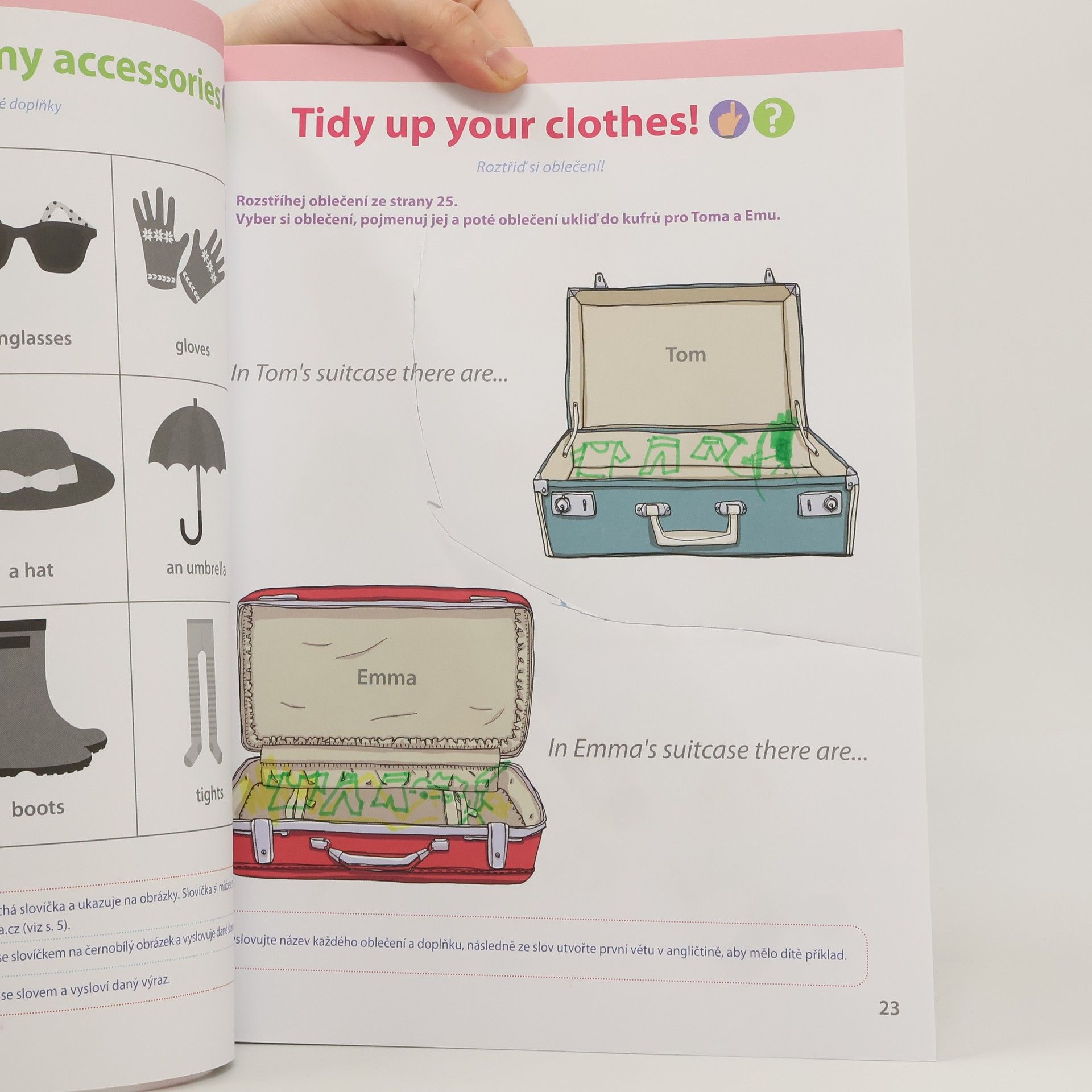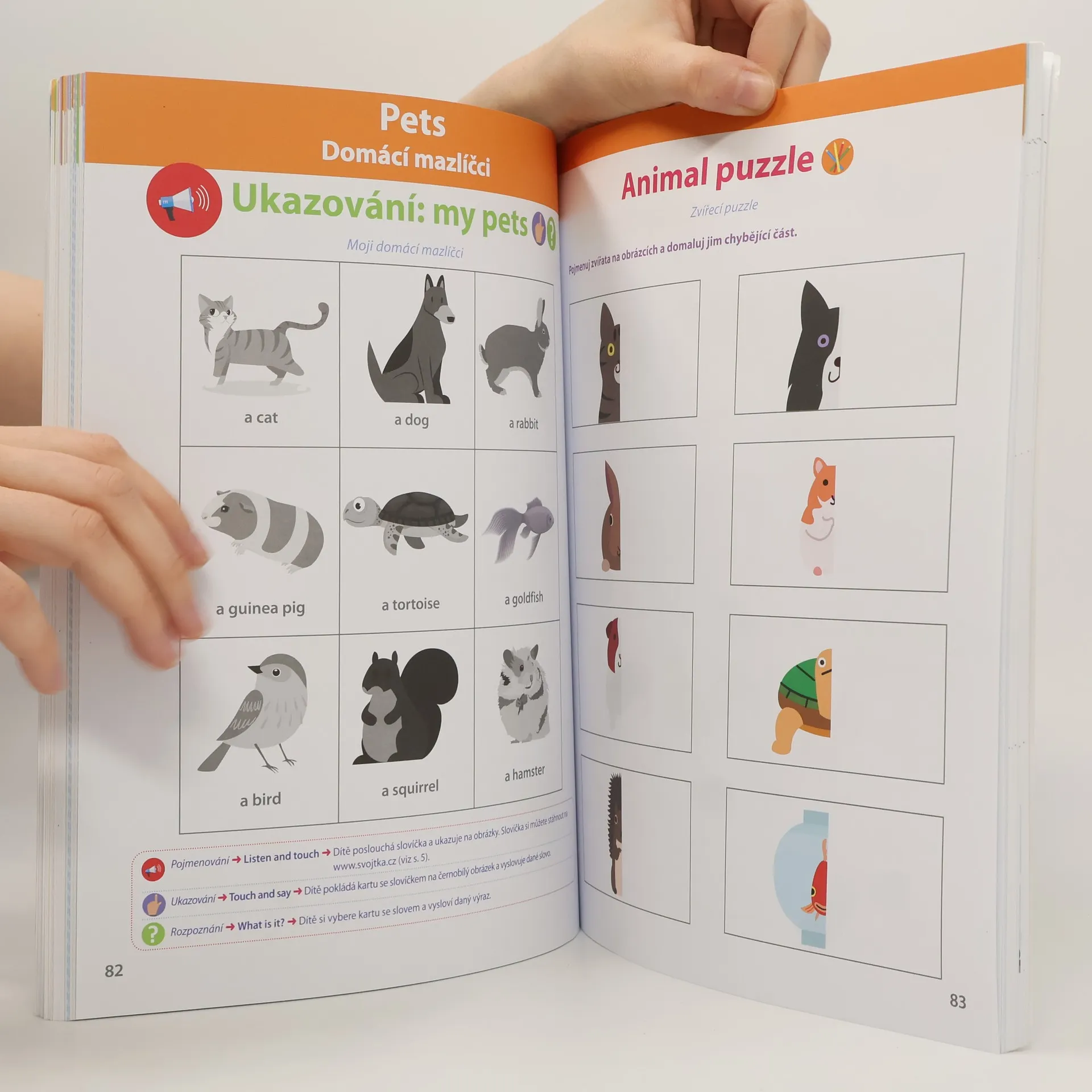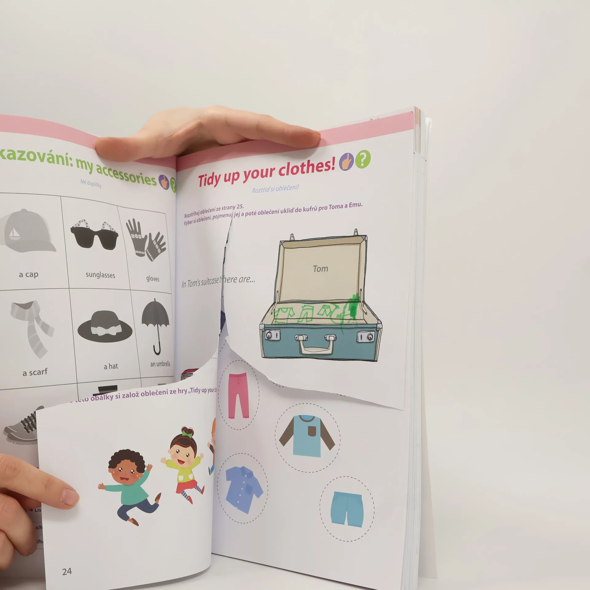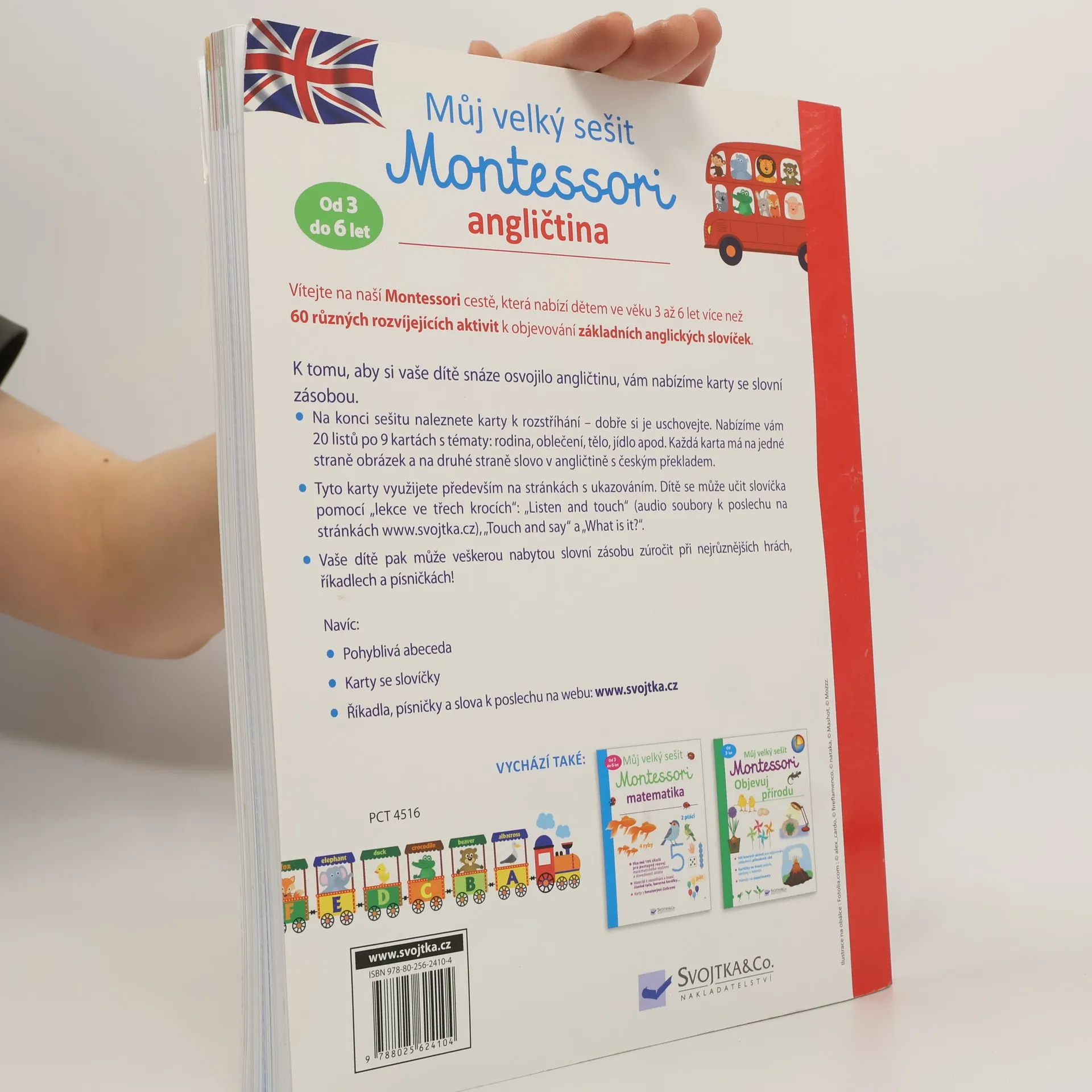 K tomu, aby si vaše dítě snáze osvojilo angličtinu, vám v tomto pracovním sešitu nabízíme karty se slovní zásobou. Aktivity a karty jsou s těmito tématy: rodina, oblečení, tělo, jídlo apod. Každá karta má na jedné straně obrázek a na druhé straně slovo v angličtině s českým překladem. Tyto karty využijete především na stránkách s ukazováním. Dítě se bude učit slovíčka pomocí "lekce ve třech krocích": "Listen and touch", "Touch and say" a "What is it?". Vaše dítě pak veškerou nabytou slovní zásobu zúročí při nejrůznějších hrách, říkadlech a písničkách. Ke knize patří též audio soubory ke stažení.