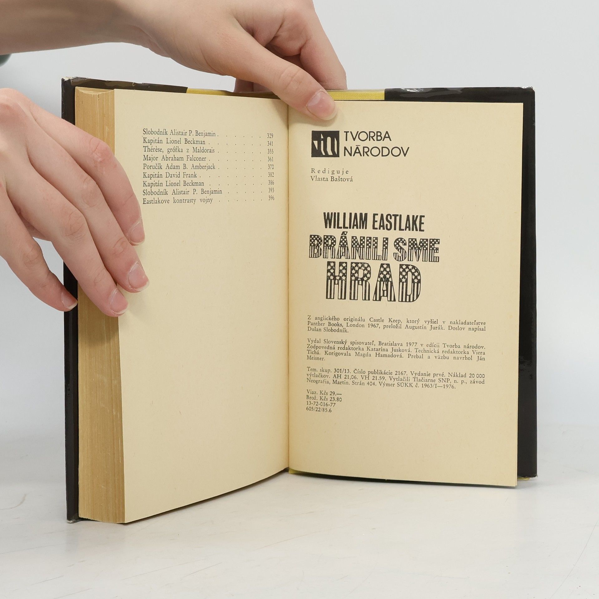 Anotácia: Po relatívne pokojnom úvode, kde vystupuje do popredia tá „veselá“ stránka vojny, dostáva román nový rozmer, keď sa v rýchlom dramatickom spáde odohrávajú udalosti odhaľujúce pravú tvár vojnovej realiy a keď si človek v tragickom finále uvedomí hierarchiu hodnôt zosobnenú symbolom hradu tvoriaceho spolu so svojimi majiteľmi grófom a grófkou z Maldorais exotický rámec, do ktorého je príbeh vsadený. Drsný štýl, založený na viacerých subjektívnych pohľadoch prelínajúci sa s retrospektívou, je majstrovsky skĺbený s poetickým nábojom a hlbokým zintenzívnením ľudských tónov, ktoré sa rozozvučali naplno v tomto diele charakterizovanom osobitým umeleckým poňatím.Autor: William Eastlake, úspešný americký prozaik (nar. r. 1917) sa svojím vrcholným, svojrázne ladeným dielom Bránili sme hrad zaraďuje k tým významným americkým autorom, čo podali najpôsobivejší obraz vojny predstavujúci syntézu tragédie s fraškou, ako napr. J. Heller, N. Mailer, J. Jones, I. Shaw, kde prevláda etická rovina stvárnenia historickej reality.Ústredné postavy príbehu vykreslené s originálnym prístupom humorisického sfarbenia - kapitán L. Beckam, bývalý kňaz A. B. Amberjack, seržant Rossi, Juan de Vaca, kapitán Frank, major Falconer a hlavný rozprávač černošský slobodník - „spisovateľ“ Alistair P. Benjamin - sú spojené pobytom na starobylom ardenskom hrade, ktorý bránia pred nemeckou ofenzívou.