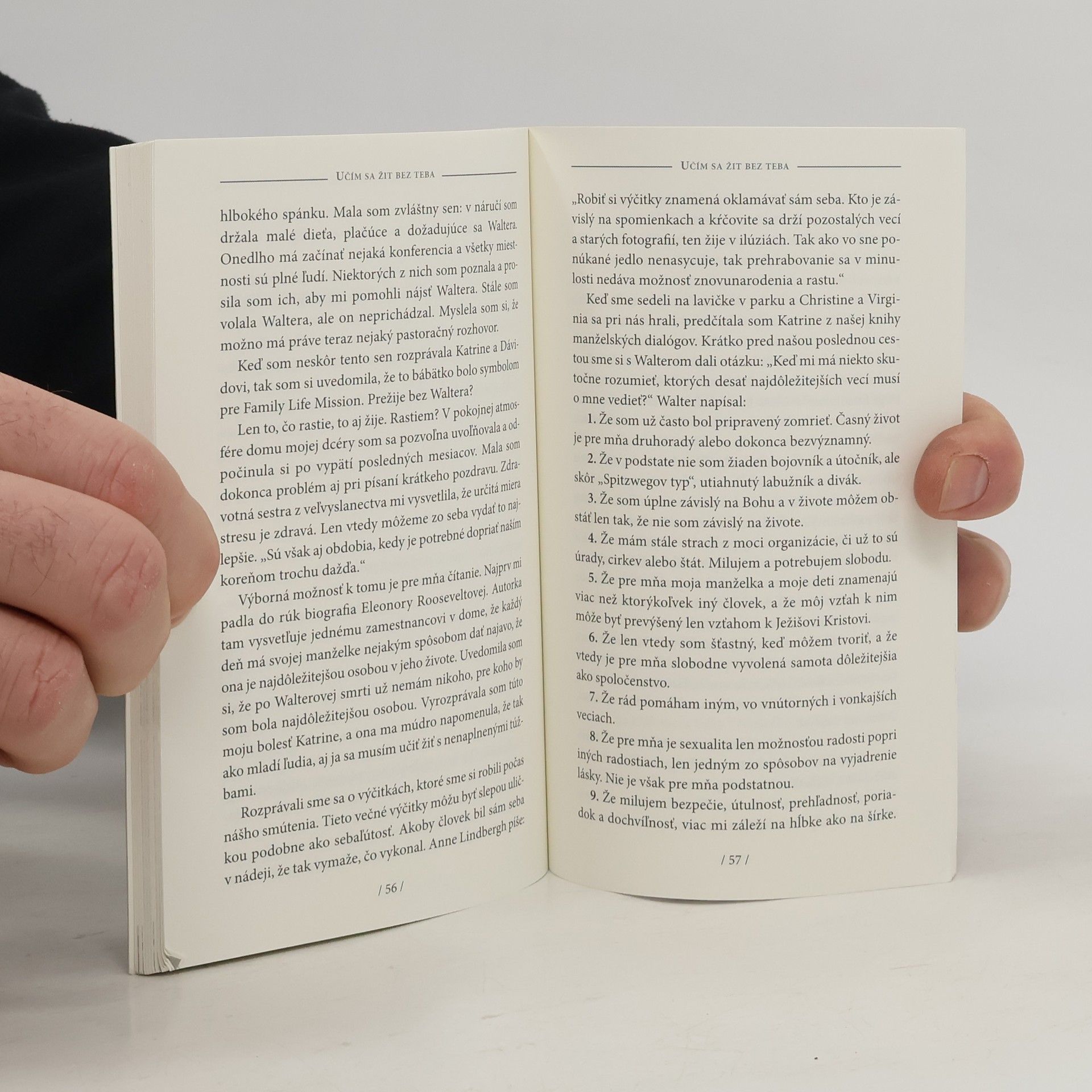 Walter a Ingrid Trobischovci ako poradenský tandem v otázkach manželstva a rodiny vyžarovali zvláštnym spôsobom vždy, keď sa spoločne zhovárali o jednote a rozdieloch medzi mužom a ženou v manželstve. Šťastie tejto jednoty im nepadlo do lona samo od seba, práve preto vedeli iných povzbudzovať, aby sa vzdali ilúzií a navzájom sa prijímali. Keď Walter Trobish ako päťdesiatpäťročný náhle umrel na zlyhanie srdca, zrazu sa všetko zrútilo. Ingrid zostala sama. V týchto denníkových zápiskoch sa delí so svojím čitateľom o vlastné skúsenosti a zážitky. Jej cesta so všetkými spomienkami, bolesťou a prvým zábleskom novej nádeje, až po zakorenenie sa na novom mieste ponúka príbeh s novým poverením: žiť ďalej, v nanovo prežívanom spoločenstve s Bohom milovať tento život a k tomu povzbudzovať aj iných.