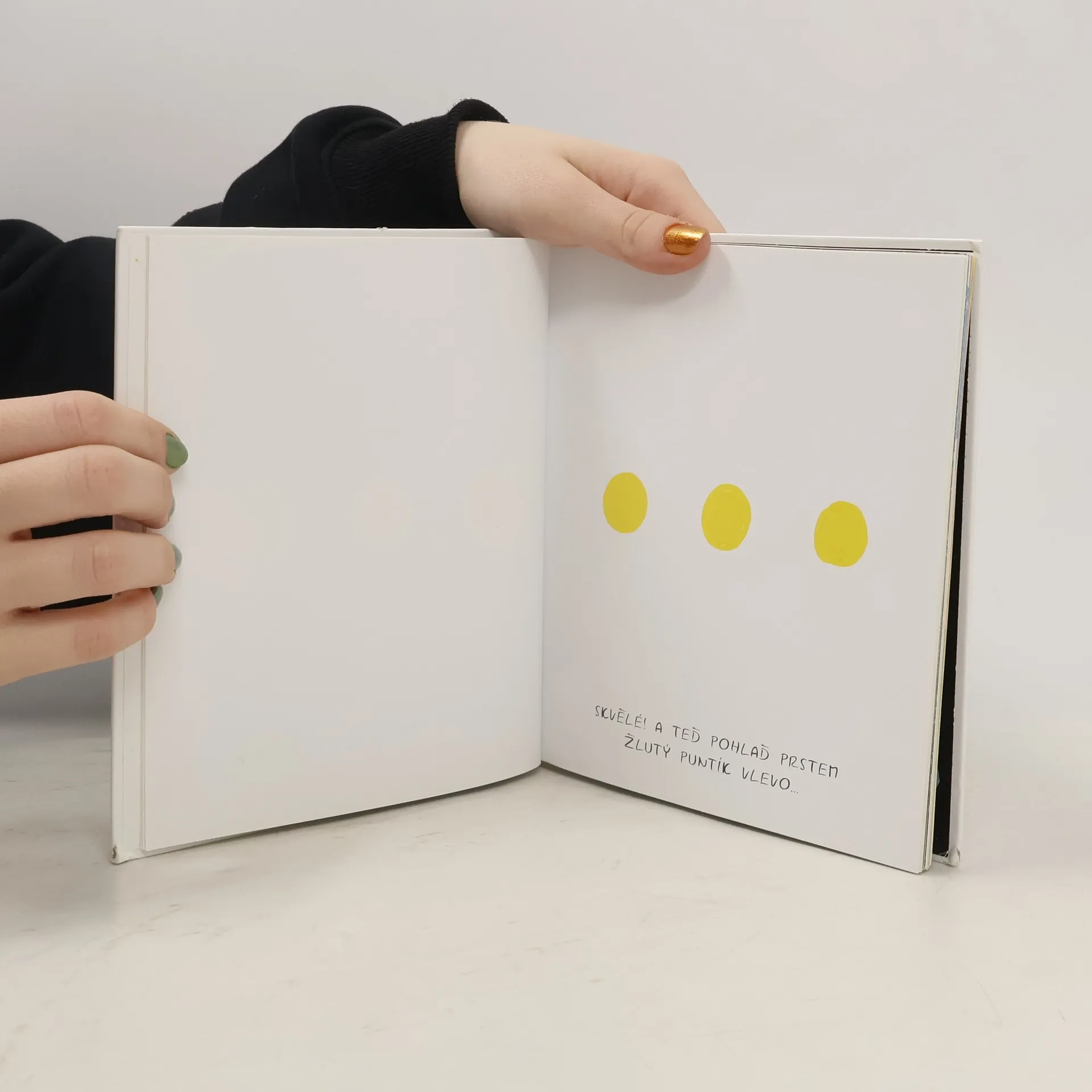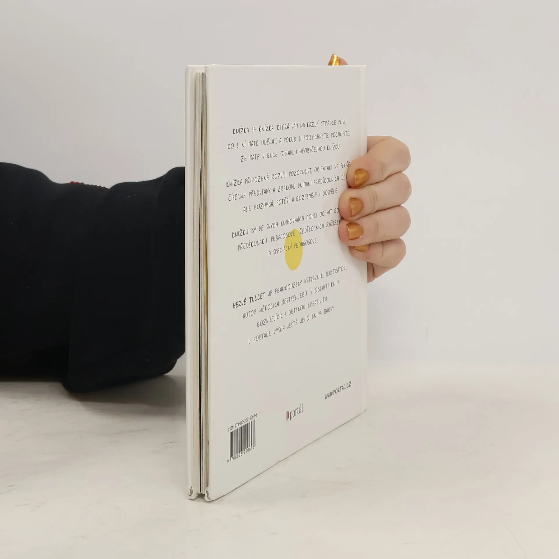Knížka je knížka, která vám na každé stránce poví, co s ní máte udělat. A pokud ji poslechnete, pochopíte, že máte v ruce opravdu neobyčejnou knížku. Stačí jí zatřást, někde poklepat, jinde fouknout do barevných puntíků a začnou se dít překvapivé věci… Knížka přirozeně rozvíjí pozornost, orientaci na ploše, číselné představy a zrakové vnímání předškolních dětí, připravuje pro čtení a psaní, ale rozhýbá, potěší a rozesměje i dospělé. Knížku ve svých knihovnách ocení rodiče předškoláků, pedagogové předškolních zařízení a speciální pedagogové. Druhé vydání.