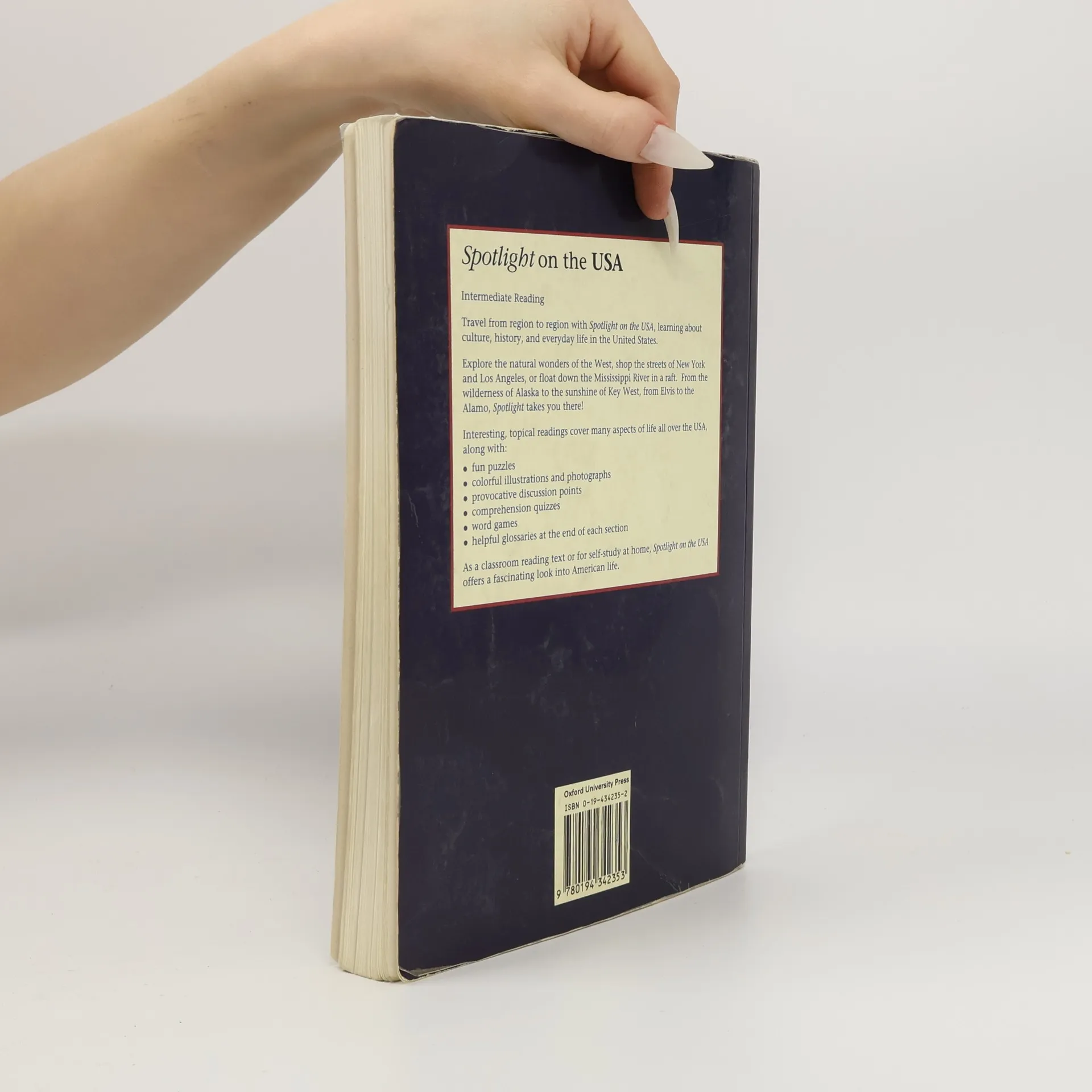 The book consists of high-interest reading passages on prominent regions across the United States. Each unit is divided into separate readings focusing on topics such as the history, geography, famous personalities, economics and culture of the particular region. Illustrations and photographs in each passage heighten students' interest. Puzzles and games at the end of each passage reinforce the topics and vocabulary. Regular discussion points encourage cross-cultural comparisons. Glossaries at the end of every unit provide students with concise, easy-to-understand definitions. Maps featured throughout the text help students locate the areas highlighted in the readings.