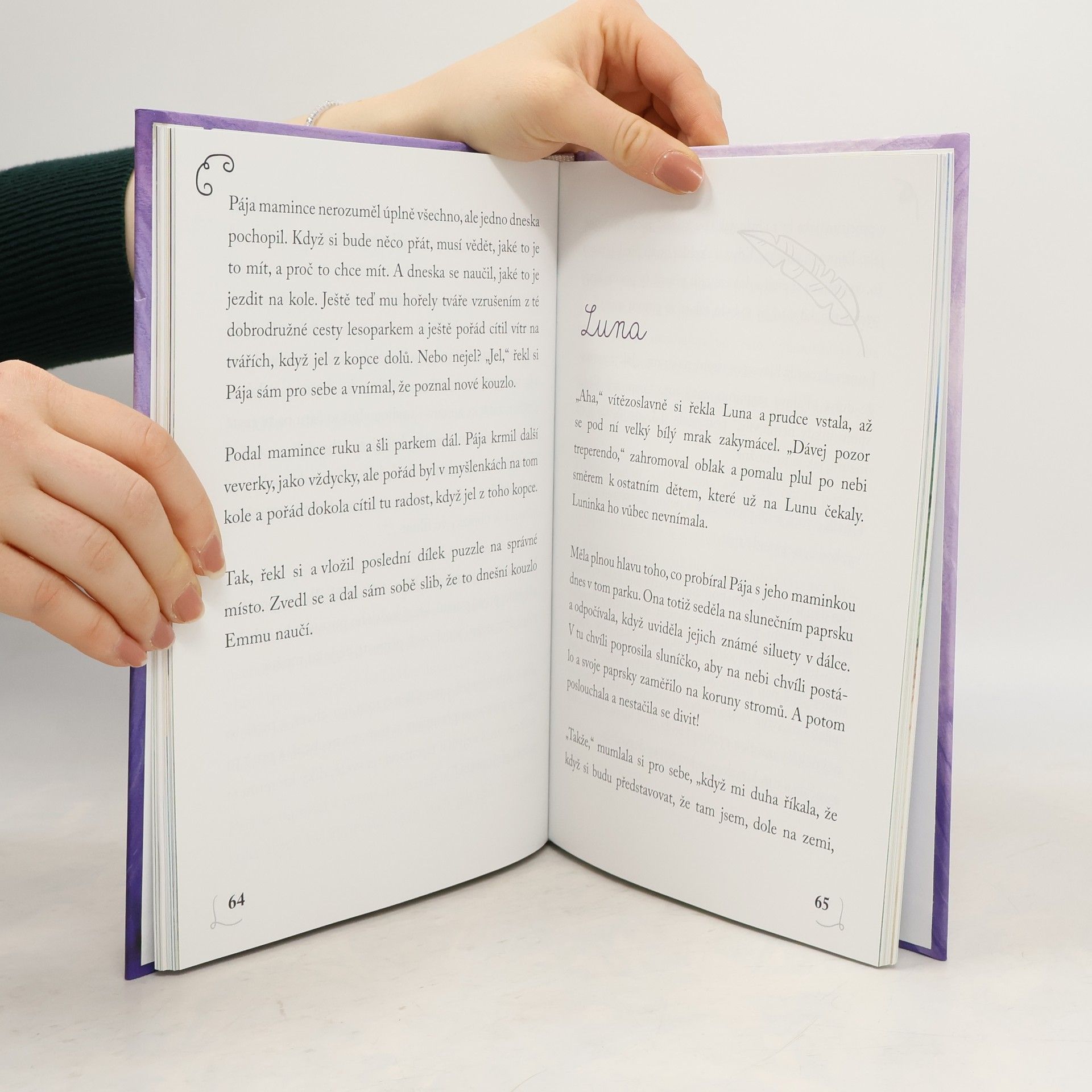 Luna je zvláštní holčička. Mluví s hvězdami, duhu má jako klouzačku a mraky bere jako přátele, Jenže poslední dobou často pozoruje pozemský život a i když vnímá, že se tam dějí i složité věci, jedno jí nedá spát. Chtěla by poznat dotek. A aby toho nebylo málo, tak na hřiště, kam dobře vidí, chodí jeden kluk a touží po sestře. Kouzelný příběh pro děti i jejich rodiče, který otevírá jiné možnosti vnímání běžných starostí.