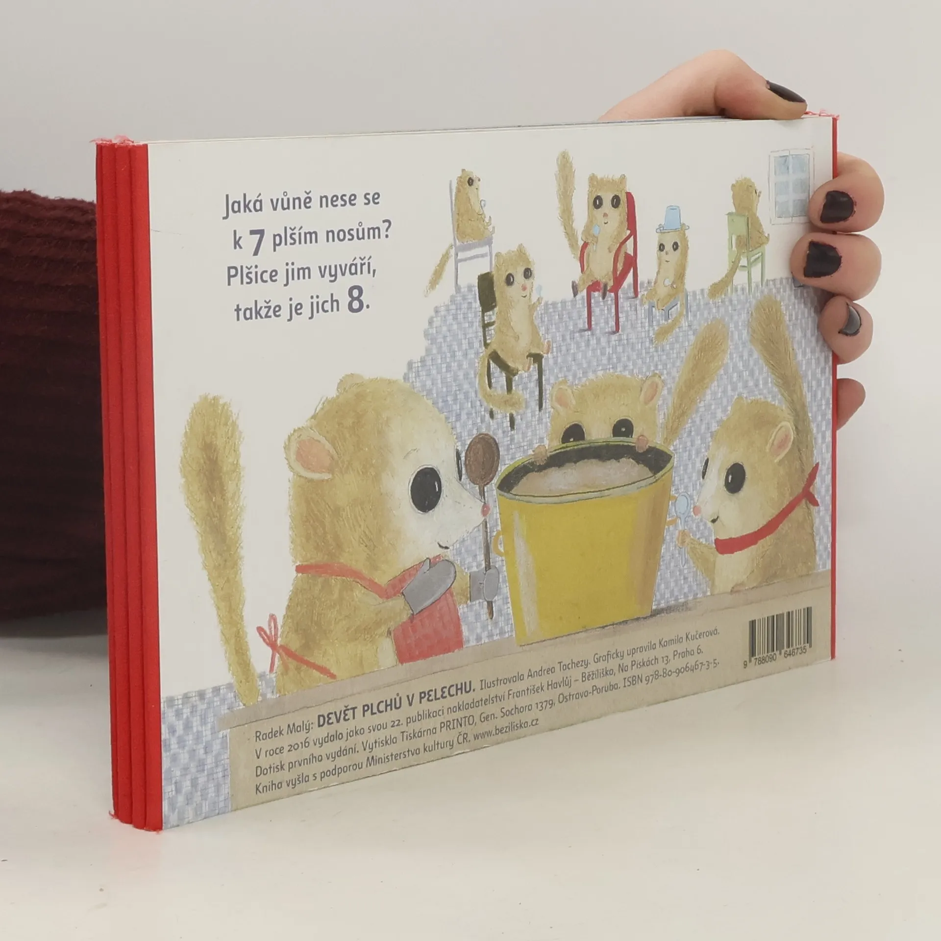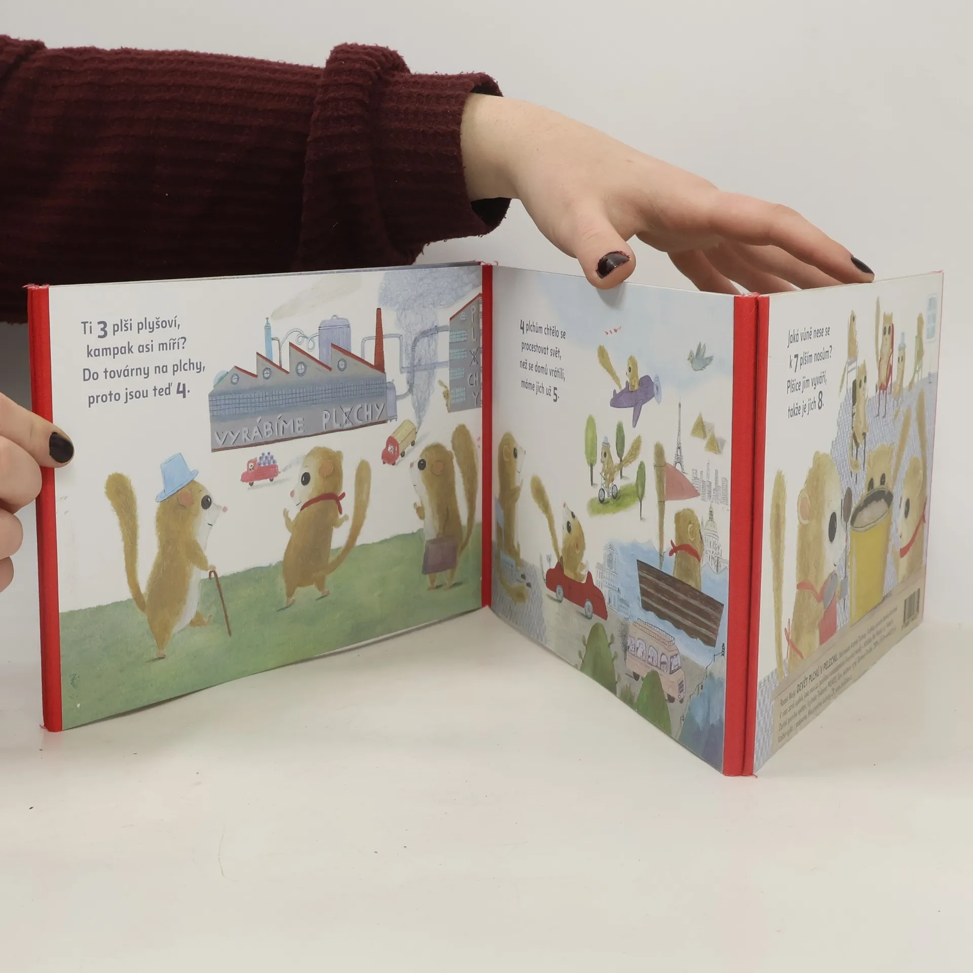Harmonikové leporelo vázané v červeném plátně ladícím s drobnými detaily ilustrací. Zatímco v klasické básničce ubývají černoušci, v tomto leporelu přibývají zvířátka: První malý plachý plch si toho druhého vytáhne ze zrcadla, další se objeví u továrny na pl(e)chy. Na přibývajících plších si procvičíte nejen počty, ale i skloňování číslovek. Třeba při hlasitém čtení veršů „4 plchům chtělo se procestovat svět“ se nejedno dítě napoprvé zakoktá. Radek Malý připravil pro ilustrátorku Andreu Tachezy hravý text a ta ho doplnila kresbami plšíků lískových, kteří tak trochu připomínají její pověstné plyšové výtvory.