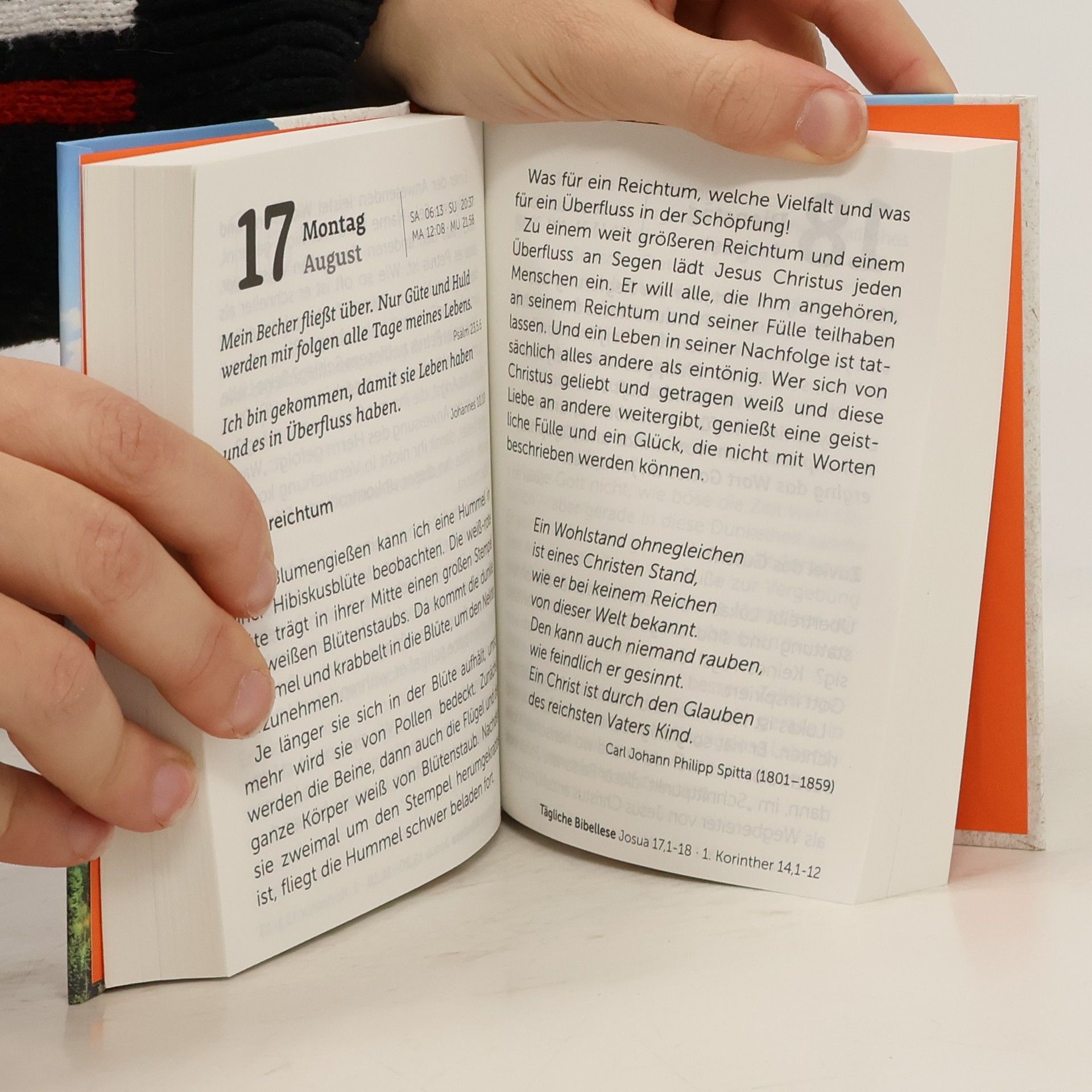Dieser Kalender wendet sich an alle, die bereit sind, in dieser lautstarken Zeit einen Augenblick hinzuhören, wenn Gott durch sein Wort, die Bibel, zu uns redet. Als Tageskalender trägt er dazu bei, dass sich solche Augenblicke möglichst regelmäßig finden. Hauptanliegen dieses Kalenders ist es, die Leser mit der guten Botschaft von Jesus Christus vertraut zu machen. Aber auch solche, die Christus bereits als ihren Herrn und Retter kennen, werden durch das tägliche Nachdenken über die Aussage der Bibel einen Gewinn haben. - Der ideale, sehr preisgünstige Verteil-Kalender mit stabilem Hardcover-Einband und Premiumpapier.