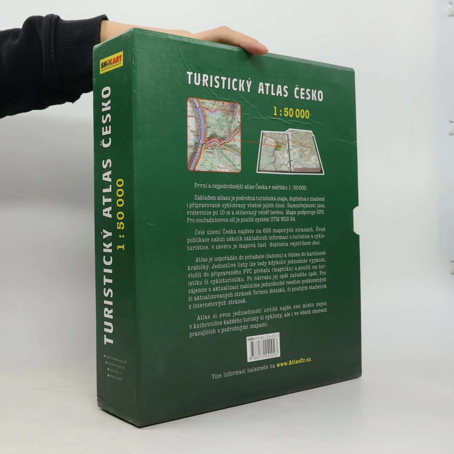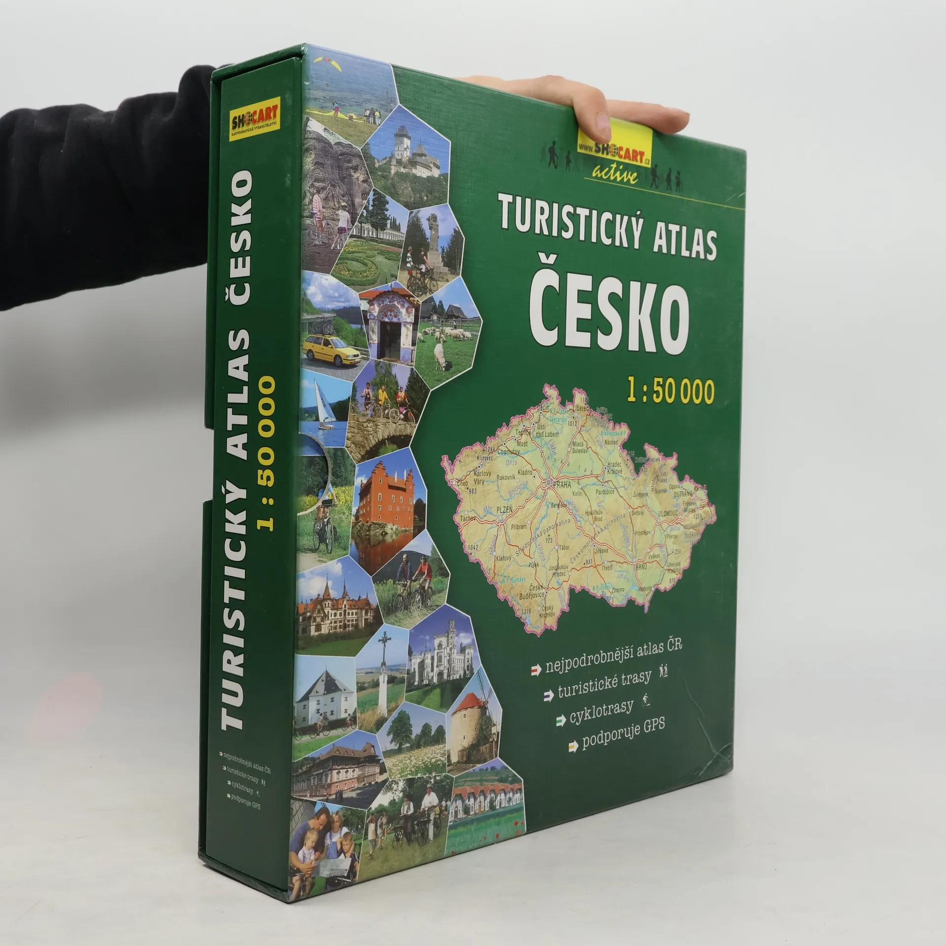 Nejpodrobnější atlas Česka v měřítku 1:50 000. Kompletní řada 72 turistických map v jednom atlase! Navíc se všemi značenými i doporučenými cyklotrasami! Základem atlasu je podrobná turistická mapa, doplněná o značené cyklotrasy včetně jejich čísel. Samozřejmostí jsou vrstevnice po 10 m a stínovaný reliéf terénu. Mapa podporuje GPS. Pro souřadnicovou síť je použit systém WGS84. Celé území Česka najdete na 626 mapových stranách. Úvod publikace nabízí několik základních informací o turistice a cykloturistice, v závěru je mapová část doplněna rejstříkem obcí. Atlas je uspořádán do pořadače (šanonu) a vložen do kartónové krabičky. Jednotlivé listy lze tedy kdykoliv jednoduše vyjmout, vložit do připraveného euroobalu (mapníku) a použít na turistiku či cykloturistiku. Po návratu jej opět zařadíte zpět. Pro zájemce o aktualizaci jsou připraveny reedice poškozených či aktualizovaných stránek formou dotisků, či pouhým stažením z internetových stránek.