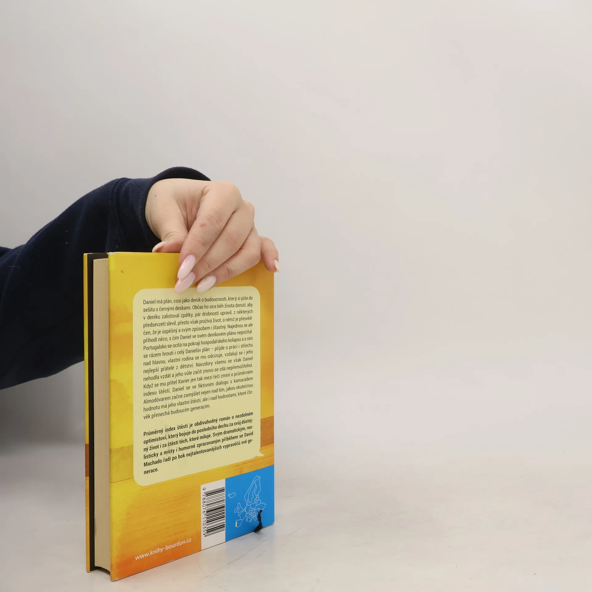Daniel má plán, cosi jako deník o budoucnosti, který si píše do sešitu s černými deskami. Občas ho sice běh života donutí, aby v deníku zalistoval zpátky, pár drobností upravil, z některých předsevzetí slevil, presto však prožívá život, o němž je přesvědčen, že je úspěšný a svým způsobem i šťastný. Najednou se ale přihodí něco, s čím Daniel ve svém deníkovém plánu nepočítal. Portugalsko se ocitá na pokraji hospodářského kolapsu a s ním se rázem hroutí i celý Danielův plán – přijde o práci i střechu nad hlavou, vlastní rodina se mu odcizuje, vzdalují se i jeho nejlepší přátelé z dětství. Navzdory všemu se však Daniel nehodlá vzdát a jeho vůle začít znovu se zdá nepřemožitelná. Když se mu přítel Xavier jen tak mezi řečí zmíní o průměrném indexu štěstí, Daniel se ve fiktivním dialogu s kamarádem Almodôvarem začne zamýšlet nejen nad tím, jakou skutečnou hodnotu má jeho vlastní štěstí, ale i nad hodnotami, které člověk přenechá budoucím generacím. Průměrný index štěstí je obdivuhodný román o nezdolném optimistovi, který bojuje do posledního dechu za svůj důstojný život i za štěstí těch, které miluje. Svým dramatickým, realisticky a místy i humorně zpracovaným příběhem se David Machado řadí po bok nejtalentovanějších vypravěčů své generace.