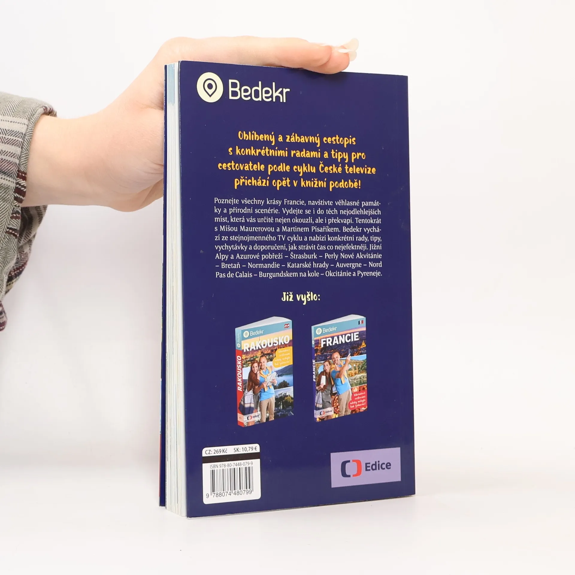 Poznejte všechny krásy Francie, navštivte věhlasné památky a přírodní scenérie. Vydejte se i do těch nejodlehlejších míst, která vás určitě nejen okouzlí, ale i překvapí.Tentokrát s Míšou Maurerovou a Martinem Písaříkem. Bedekr vychází ze stejnojmenného TV cyklu. Nabízí konkrétní rady, tipy, vychytávky a doporučení, jak strávit čas co nejefektněji. Jižní Alpy a Azurové pobřeží – Štrasburk – Nová Akvitánie – Bretaň – Normandie – Katarské hrady – Auvergne – Nord Pas de Calais – Burgundskem na kole – Pyreneje.