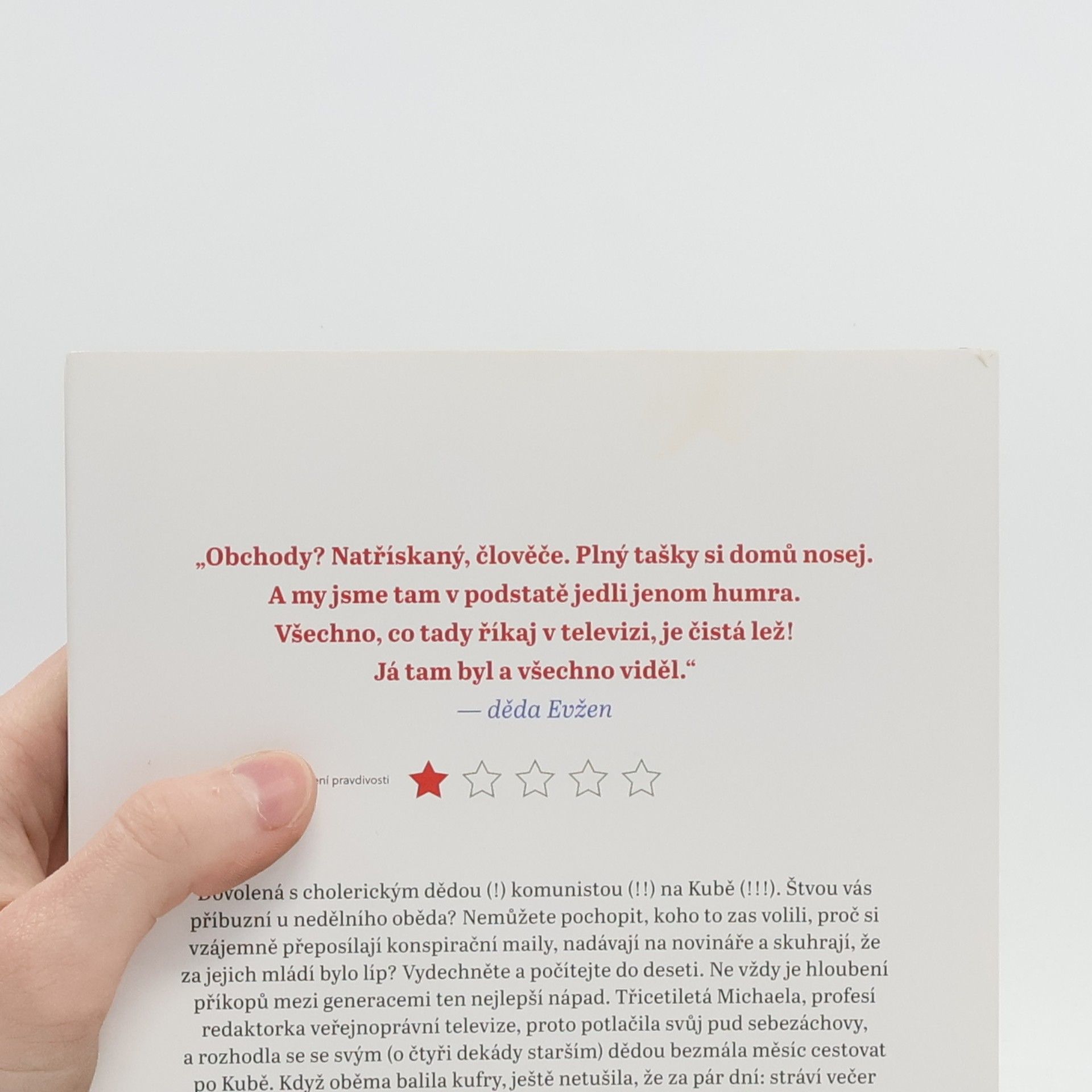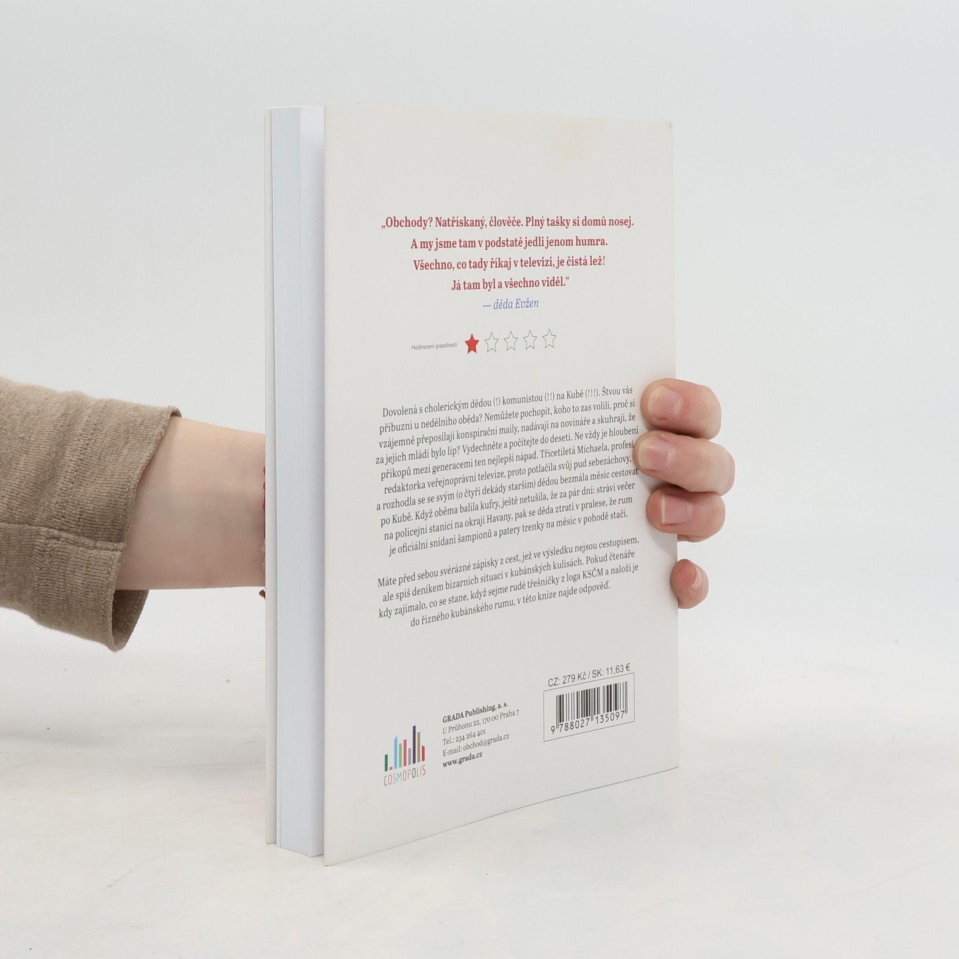 Dovolená s cholerickým dědou (!) komunistou (!!) na Kubě (!!!). Štvou vás příbuzní u nedělního oběda? Nemůžete pochopit, koho to zas volili, proč si vzájemně přeposílají konspirační maily, nadávají na novináře a skuhrají, že za jejich mládí bylo líp? Vydechněte a počítejte do deseti. Ne vždy je hloubení příkopů mezi generacemi ten nejlepší nápad. Třicetiletá Michaela, profesí redaktorka veřejnoprávní televize, proto potlačila svůj pud sebezáchovy, a rozhodla se se svým (o čtyři dekády starším dědou) bezmála měsíc cestovat po Kubě. Když oběma balila kufry, ještě netušila, že za pár dní: stráví večer na policejní stanici na okraji Havany, pak se děda ztratí v pralese, že rum je oficiální snídaní šampionů a patery trenky na měsíc v pohodě stačí. Máte před sebou svérázné zápisky z cest, jež ve výsledku nejsou cestopisem, ale spíš deníkem bizarních situací v kubánských kulisách. Pokud čtenáře kdy zajímalo, co se stane, když sejme rudé třešničky z loga KSČM a naloží je do řízného kubánského rumu, v této knize najde odpověď.