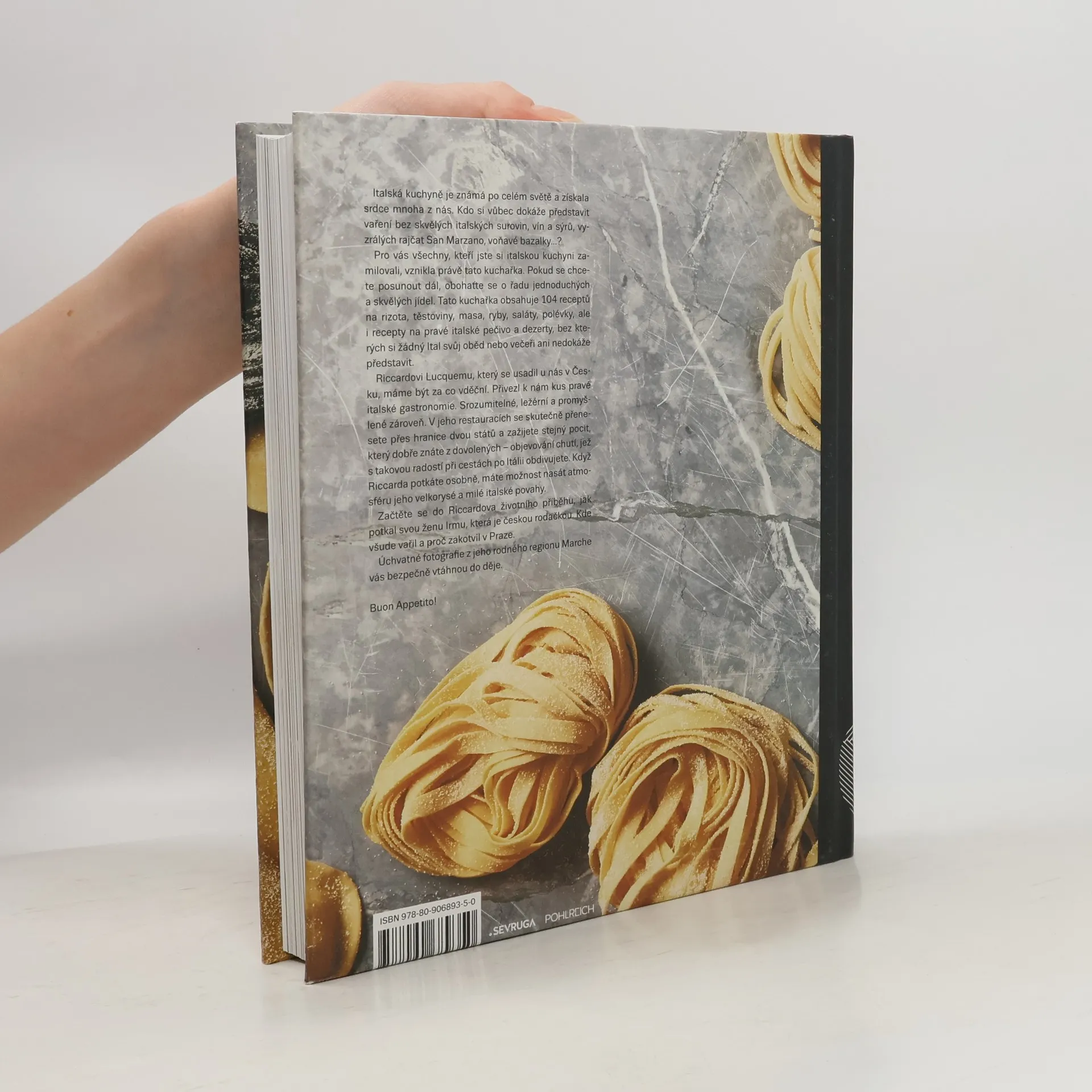 Italská kuchyně je známá po celém světě a získala srdce mnoha z nás. Kdo si vůbec dokáže představit vaření bez skvělých italských surovin, vín a sýrů, vyzrálých rajčat San Marzano, voňavé bazalky...? Pro vás všechny, kteří jste si italskou kuchyni zamilovali, vznikla právě tato kuchařka. Pokud se chcete posunout dál, obohaťte se o řadu jednoduchých a skvělých jídel. Tato kuchařka obsahuje 104 receptů na rizota, těstoviny, masa, ryby, saláty, polévky, ale i recepty na pravé italské pečivo a dezerty, bez kterých si žádný Ital svůj oběd nebo večeři ani nedokáže představit. Riccardovi Lucquemu, který se usadil u nás v Česku, máme být za co vděční. Přivezl k nám kus pravé italské gastronomie. Srozumitelné, ležérní a promyšlené zároveň. V jeho restauracích se skutečně přenesete přes hranice dvou států a zažijete stejný pocit, který dobře znáte z dovolených - objevování chutí, jež s takovou radostí při cestách po Itálii obdivujete. Když Riccarda potkáte osobně, máte možnost nasát atmosféru jeho velkorysé a milé italské povahy. Začtěte se do Riccardova životního příběhu, jak potkal svou ženu Irmu, která je českou rodačkou. Kde všude vařil a proč zakotvil v Praze. Úchvatné fotografie z jeho rodného regionu Marche vás bezpečně vtáhnou do děje. Buon Appetito!