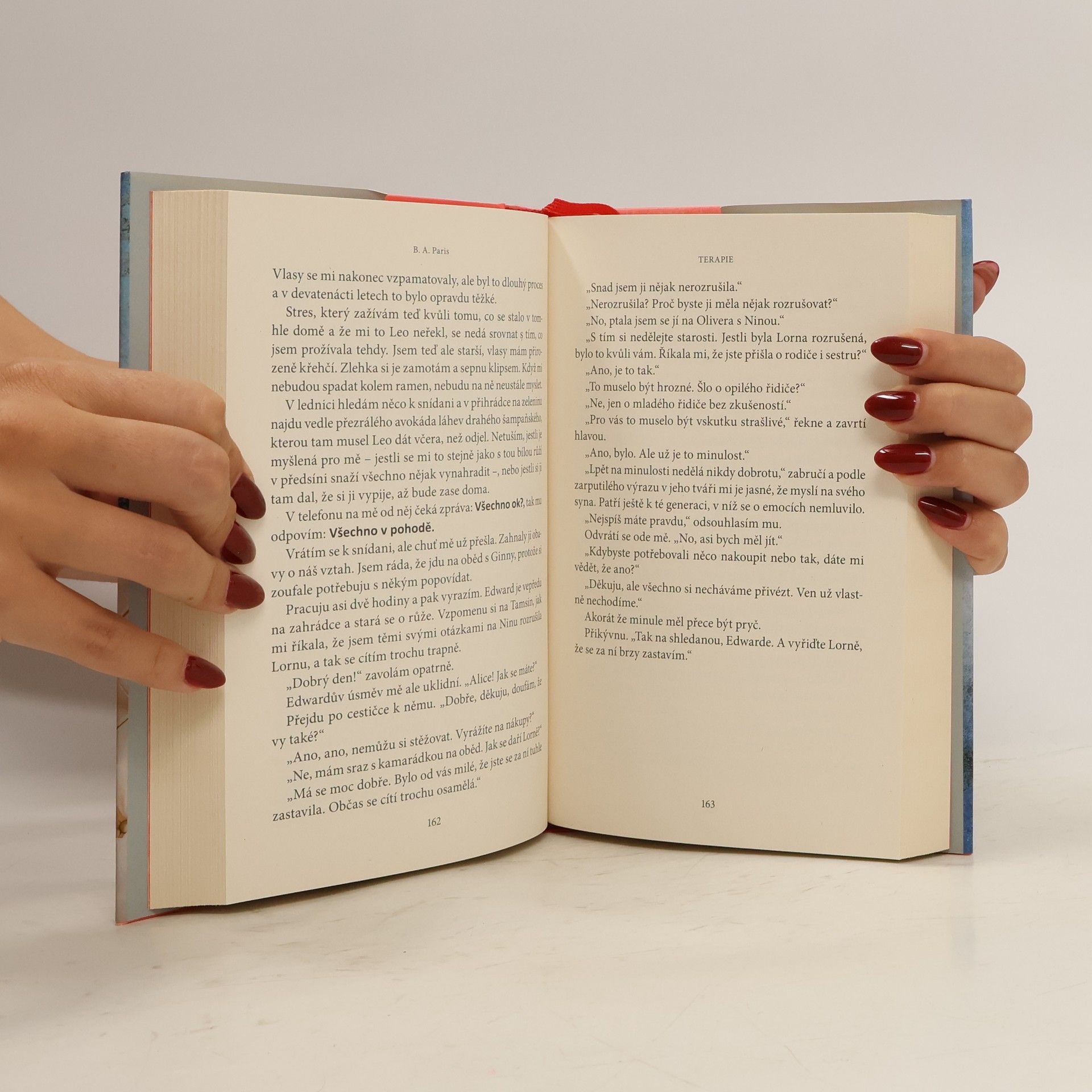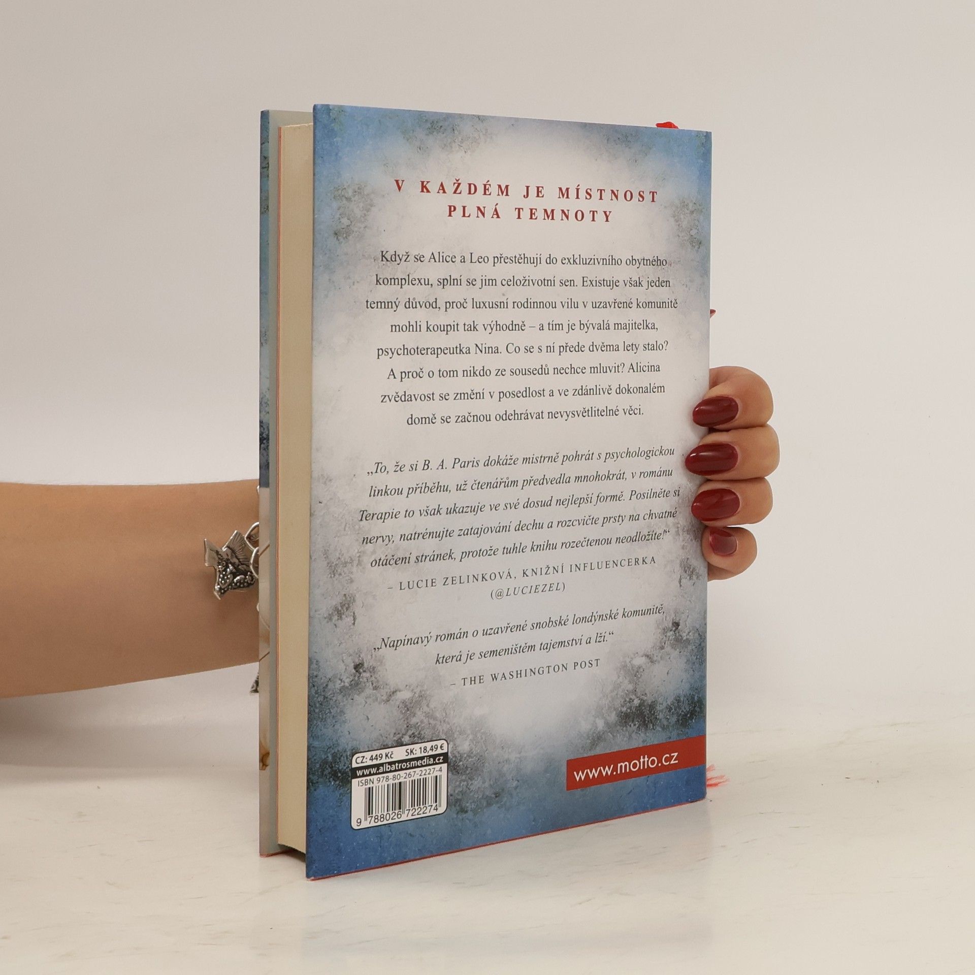 V každé duši je místnost, do které je nebezpečné vstoupit. Když se Alice a Leo přestěhují do exkluzivního obytného komplexu, splní se jim celoživotní sen. Existuje však jeden temný důvod, proč luxusní rodinnou vilu v uzavřené komunitě mohli koupit tak výhodně – a tím je bývalá majitelka, psychoterapeutka Nina. Co se s ní přede dvěma lety stalo? A proč o tom nikdo ze sousedů nechce mluvit? Alicina zvědavost se změní v posedlost a ve zdánlivě dokonalém domě se začnou odehrávat nevysvětlitelné věci. B. A. Paris, autorka bestsellerů Za zavřenými dveřmi a V pasti lží, se v Terapii vrací k tomu, v čem je nejlepší - k napínavému psychologickému thrilleru.