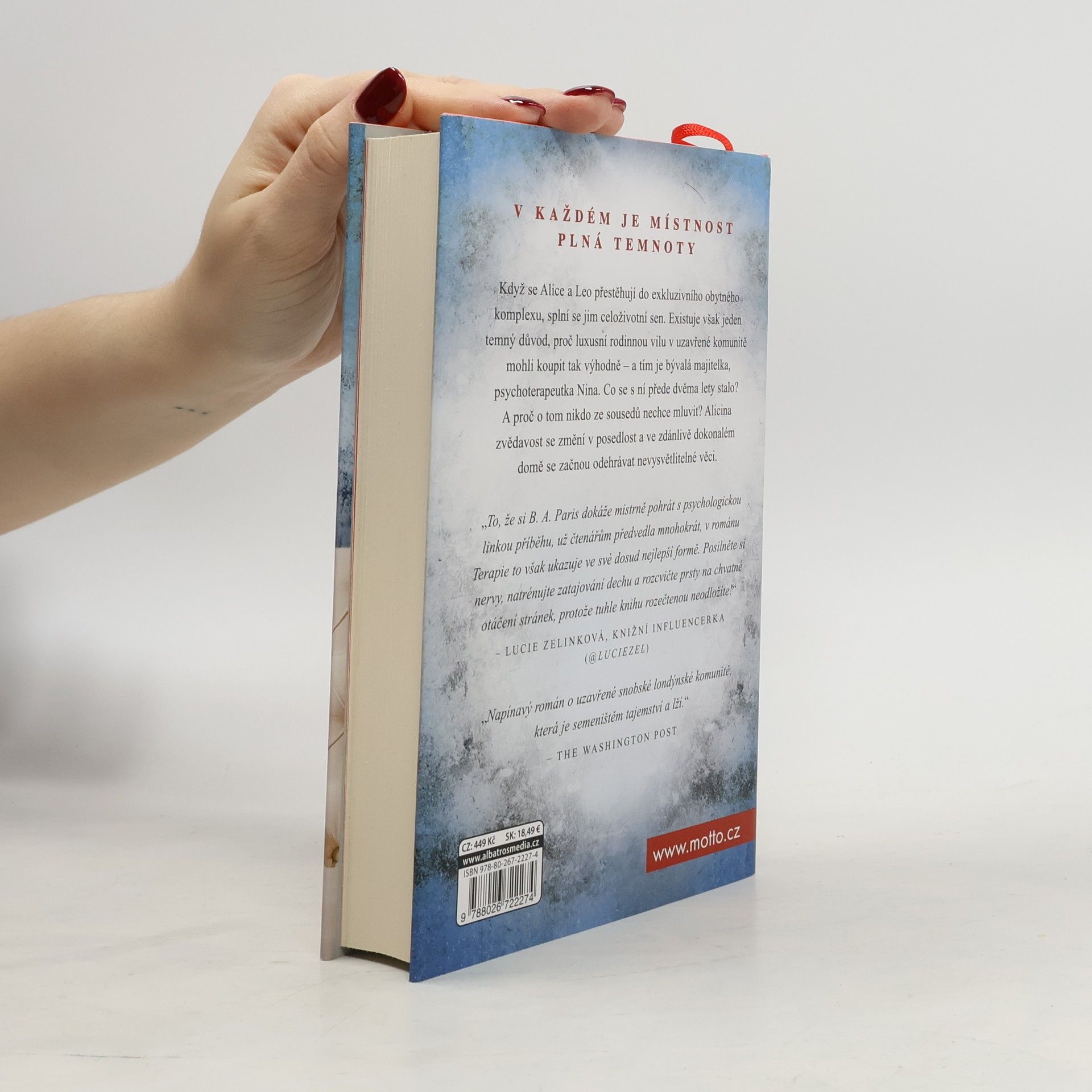 V každé duši je místnost, do které je nebezpečné vstoupit. Když se Alice a Leo přestěhují do exkluzivního obytného komplexu, splní se jim celoživotní sen. Existuje však jeden temný důvod, proč luxusní rodinnou vilu v uzavřené komunitě mohli koupit tak výhodně – a tím je bývalá majitelka, psychoterapeutka Nina. Co se s ní přede dvěma lety stalo? A proč o tom nikdo ze sousedů nechce mluvit? Alicina zvědavost se změní v posedlost a ve zdánlivě dokonalém domě se začnou odehrávat nevysvětlitelné věci. B. A. Paris, autorka bestsellerů Za zavřenými dveřmi a V pasti lží, se v Terapii vrací k tomu, v čem je nejlepší - k napínavému psychologickému thrilleru.