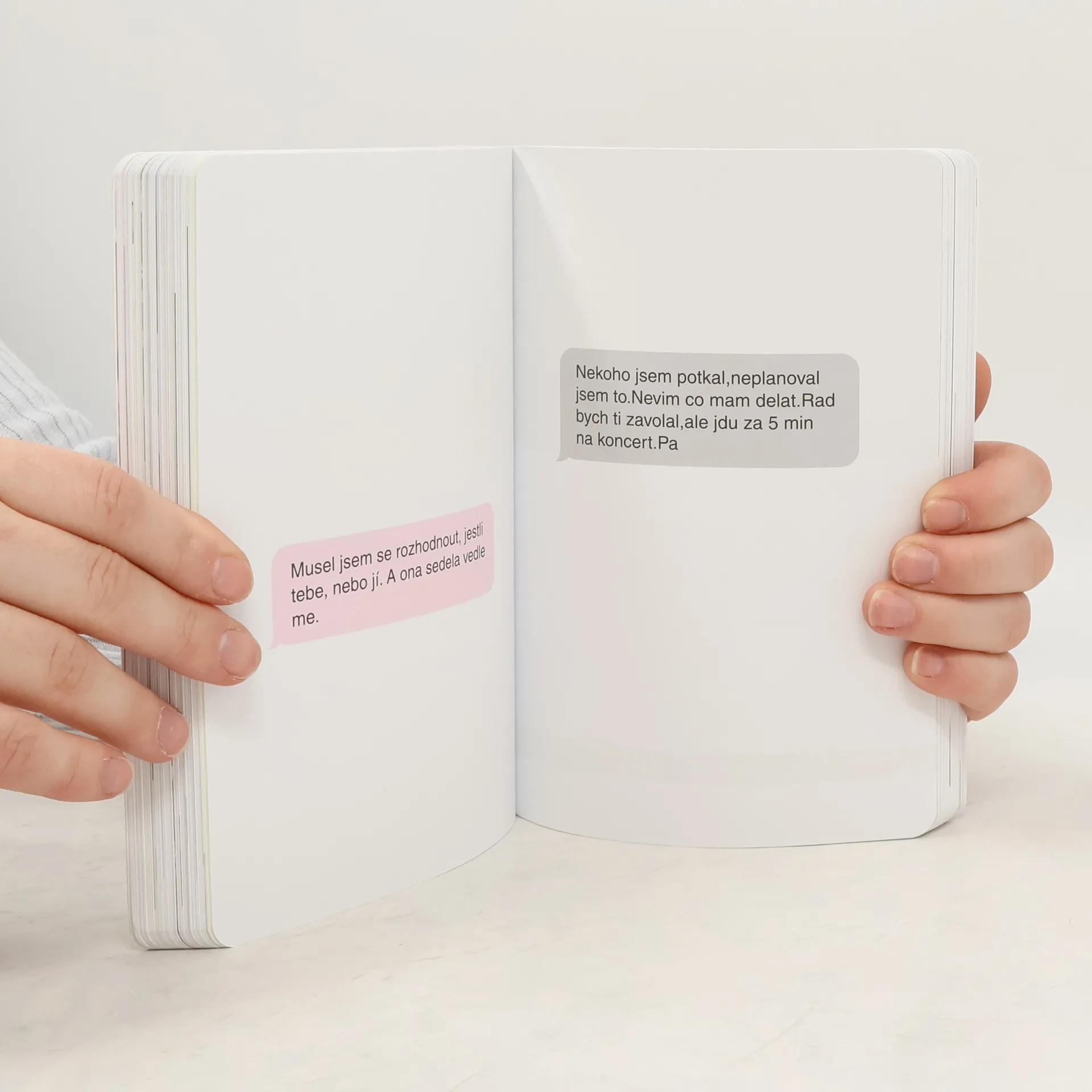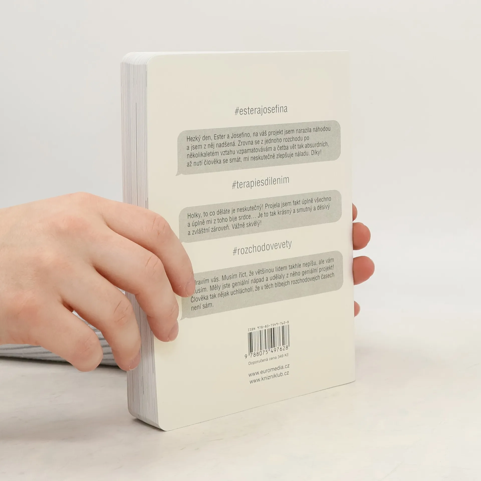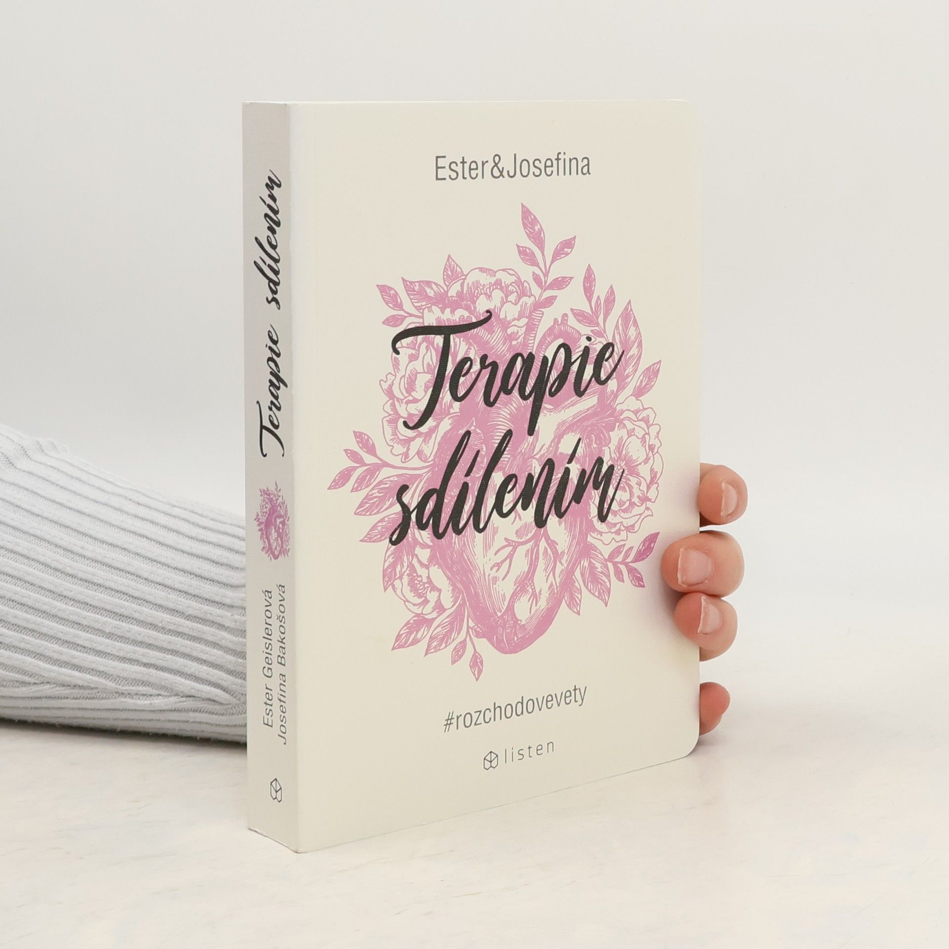 Za projektem Terapie sdílením, aktuální internetovou senzací, stojí kreativní dvojice Ester Geislerová a Josefina Bakošová. Před několika měsíci vystavily na svých sociálních sítích několik mrazivých, a zároveň cynický úsměv vzbuzujících vět, kterými se jistý muž rozešel s jejich kamarádkou. Toto malé gesto spustilo lavinu; během následujících týdnů jim čtenáři začali posílat své rozchodové věty a hashtag „terapie sdilenim“ se stal doslova kultovním. Kniha je věrným obrazem autentického prostředí internetových chatů a messengerů, kde se dnes tak často odehrávají trpké konce vztahů. Sebrané věty fungují opravdu jako svébytná terapie; při četbě a úlevném smíchu si člověk rád připomene, že tak zle na tom přece jen ještě není. Kniha je doplněna texty obou autorek, esejí mediálního teoretika Tomáše Dvořáka, osobními fotkami, vzkazy a dalšími materiály Ester a Josefiny.