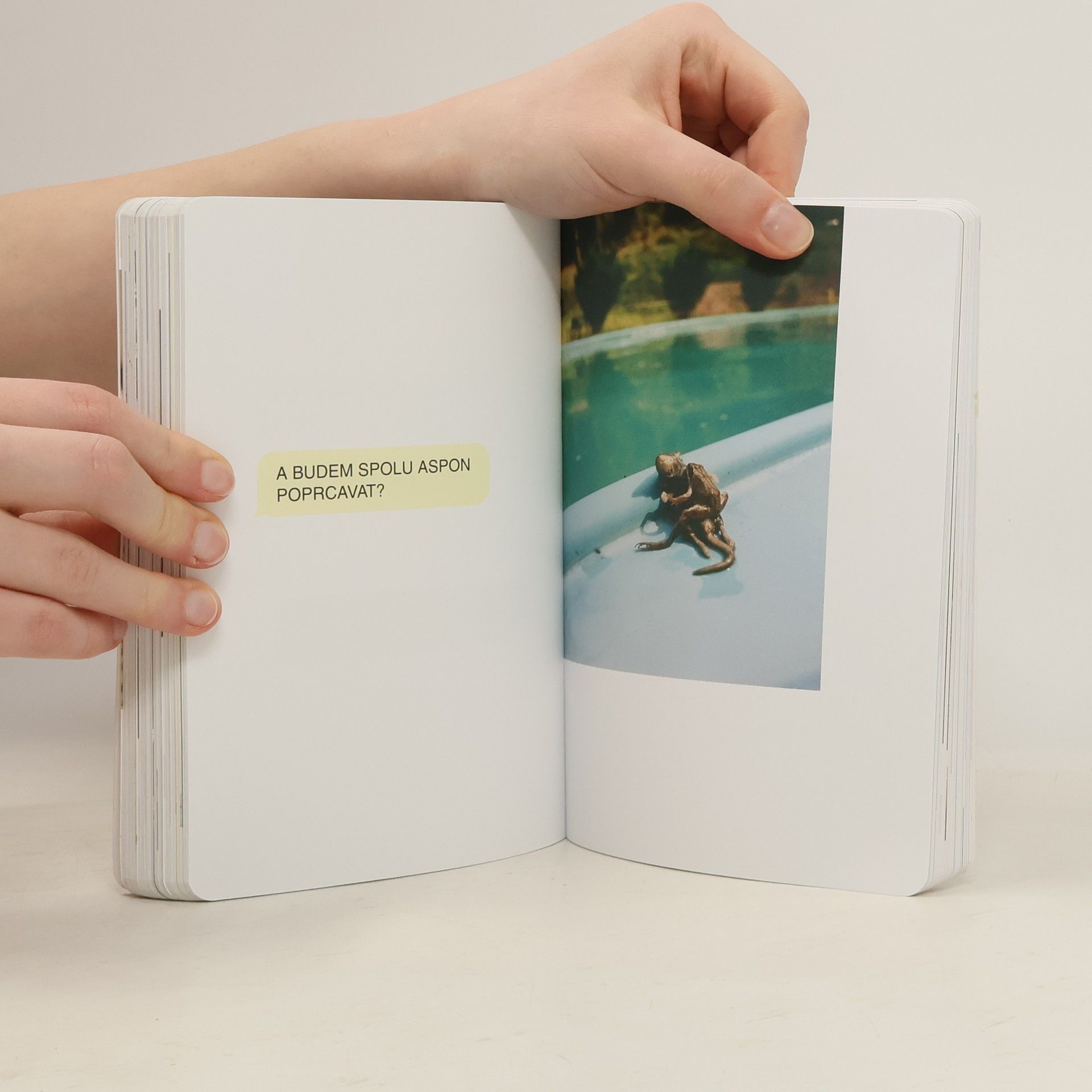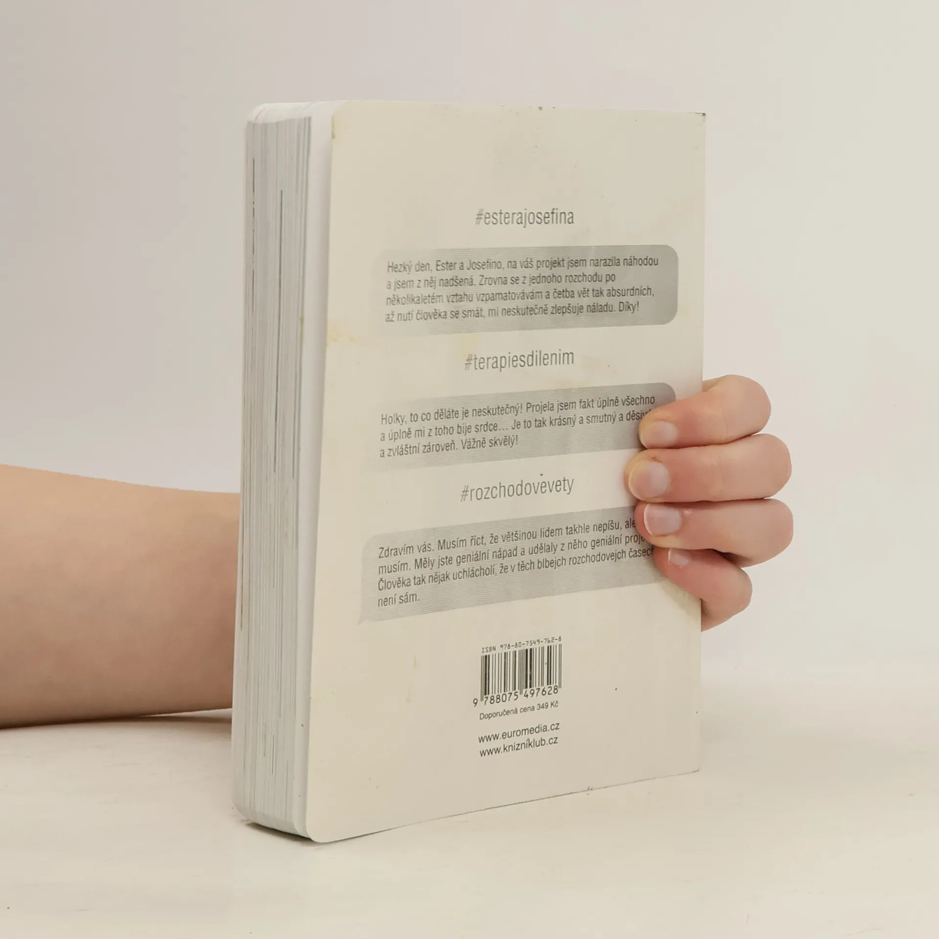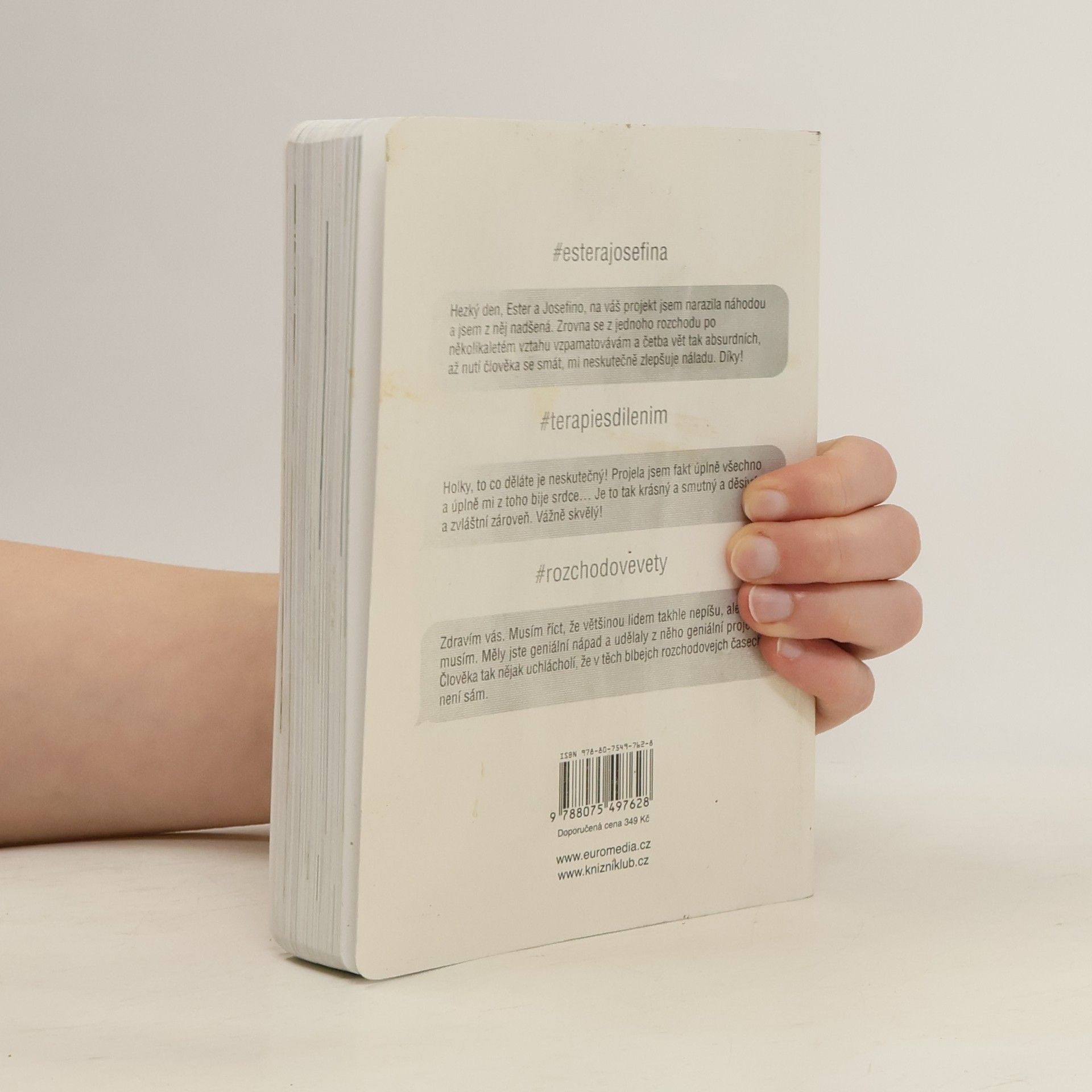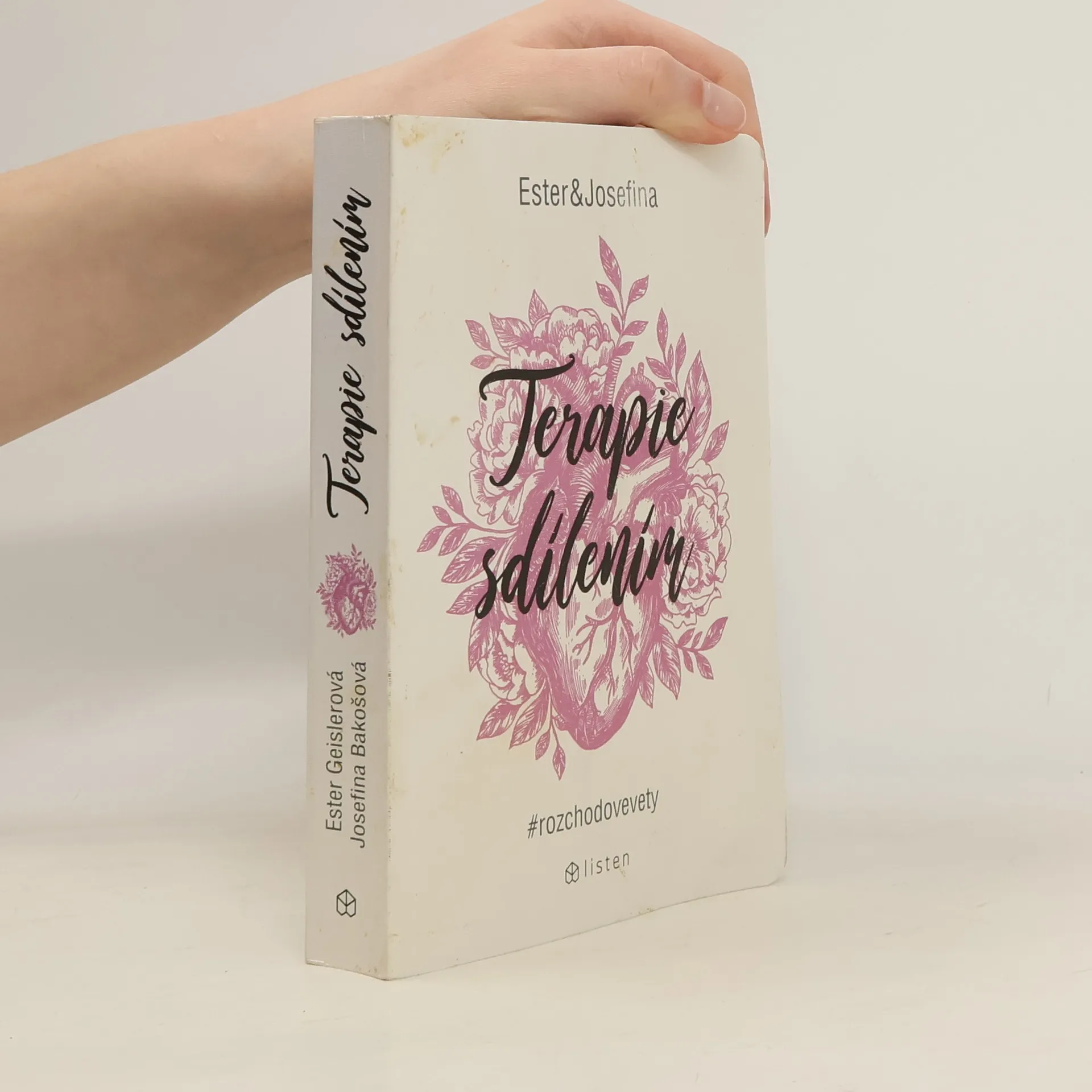 Za projektem Terapie sdílením, aktuální internetovou senzací, stojí kreativní dvojice Ester Geislerová a Josefina Bakošová. Před několika měsíci vystavily na svých sociálních sítích několik mrazivých, a zároveň cynický úsměv vzbuzujících vět, kterými se jistý muž rozešel s jejich kamarádkou. Toto malé gesto spustilo lavinu; během následujících týdnů jim čtenáři začali posílat své rozchodové věty a hashtag „terapie sdilenim“ se stal doslova kultovním. Kniha je věrným obrazem autentického prostředí internetových chatů a messengerů, kde se dnes tak často odehrávají trpké konce vztahů. Sebrané věty fungují opravdu jako svébytná terapie; při četbě a úlevném smíchu si člověk rád připomene, že tak zle na tom přece jen ještě není. Kniha je doplněna texty obou autorek, esejí mediálního teoretika Tomáše Dvořáka, osobními fotkami, vzkazy a dalšími materiály Ester a Josefiny.
