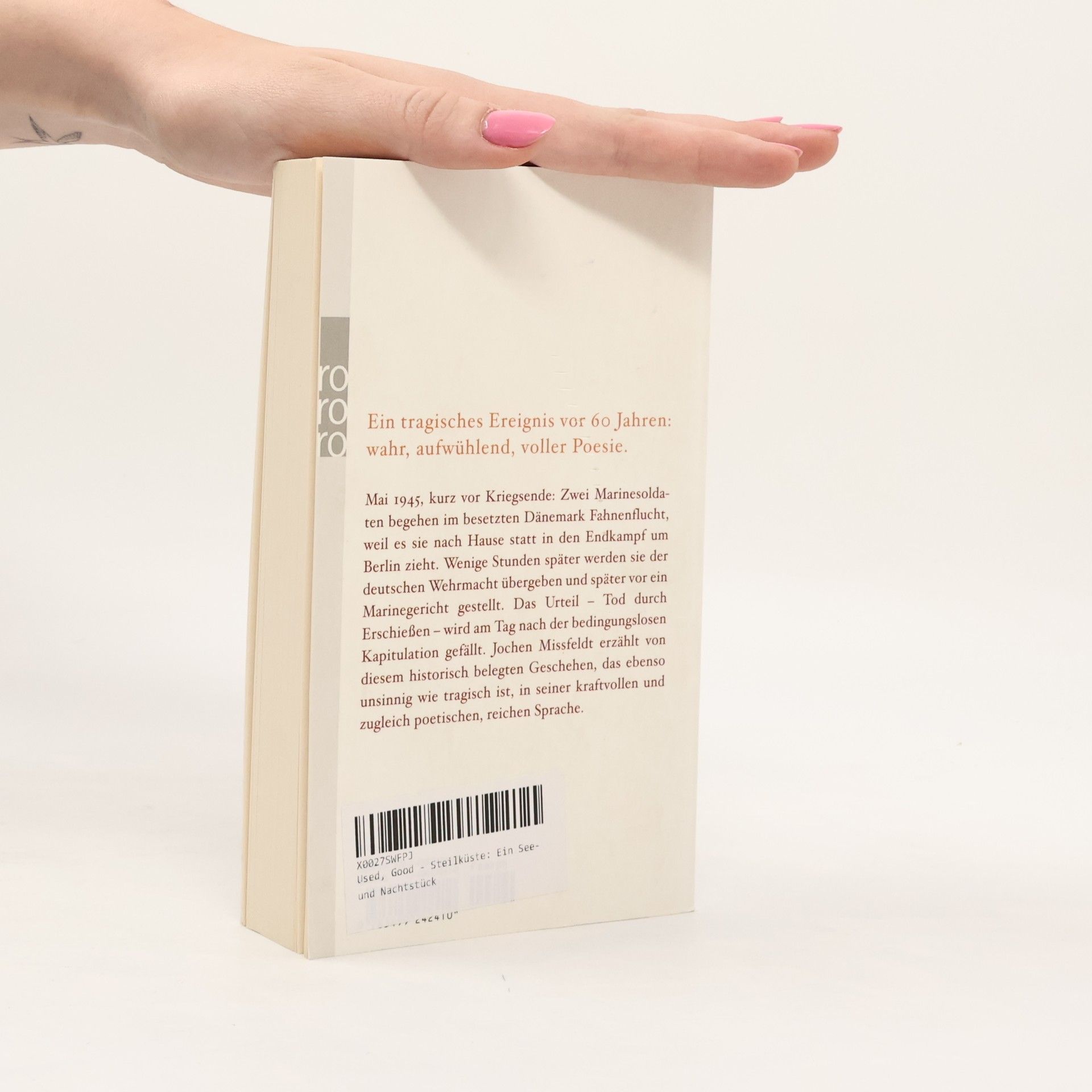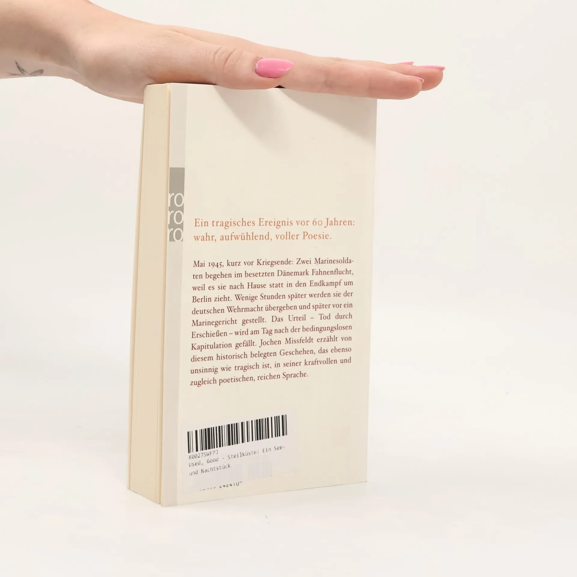 Mai 1945, kurz vor Kriegsende: Zwei Marinesoldaten begehen im besetzten Dänemark Fahnenflucht, weil es sie nach Hause statt in den Endkampf um Berlin zieht. Wenige Stunden später werden sie der deutschen Wehrmacht übergeben und später vor ein Marinegericht gestellt. Das Urteil – Tod durch Erschießen – wird am Tag nach der bedingungslosen Kapitulation gefällt.Jochen Missfeldt erzählt von diesem historisch belegten Geschehen, das ebenso unsinnig wie tragisch ist, in seiner kraftvollen und zugleich poetischen, reichen Sprache.