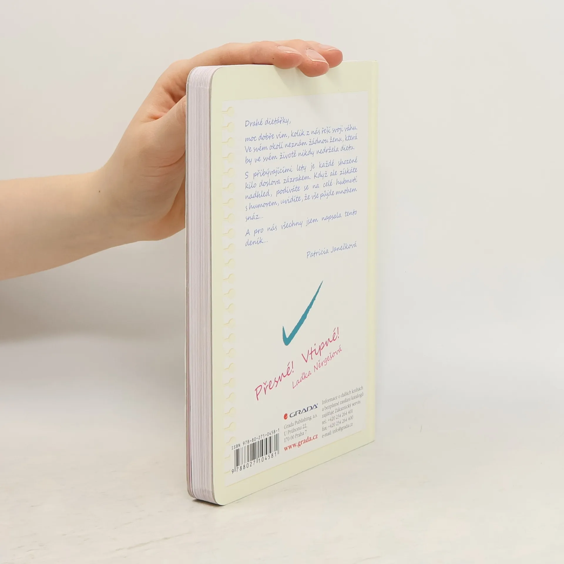 Držet redukční dietu se alespoň jednou ve svém životě rozhodla, nebo byla dohnaná, snad každá žena. Pokud to s hubnutím myslíte opravdu vážně, bude zapotřebí zapisovat si vše, co sníte a vypijete, a také vykazovat nějakou pohybovou aktivitu. Pro tento účel byl sestaven přehledný deník s tabulkami a místem pro všechny poznámky spojené s redukcí. Aby hubnutí nebylo jen nekonečným utrpením, provede vás spolutrpící žena svými krátkými příběhy, v nichž s humorem a upřímností vylíčí svoje prohry i vítězství a předá nabyté zkušenosti s odtučňováním. Cizí zápas s nadbytečným tukem jistě povzbudí a cesta k vysněné hmotnosti pak jistě bude snazší a zábavnější. Úvod napsala Laďka Něrgešová.