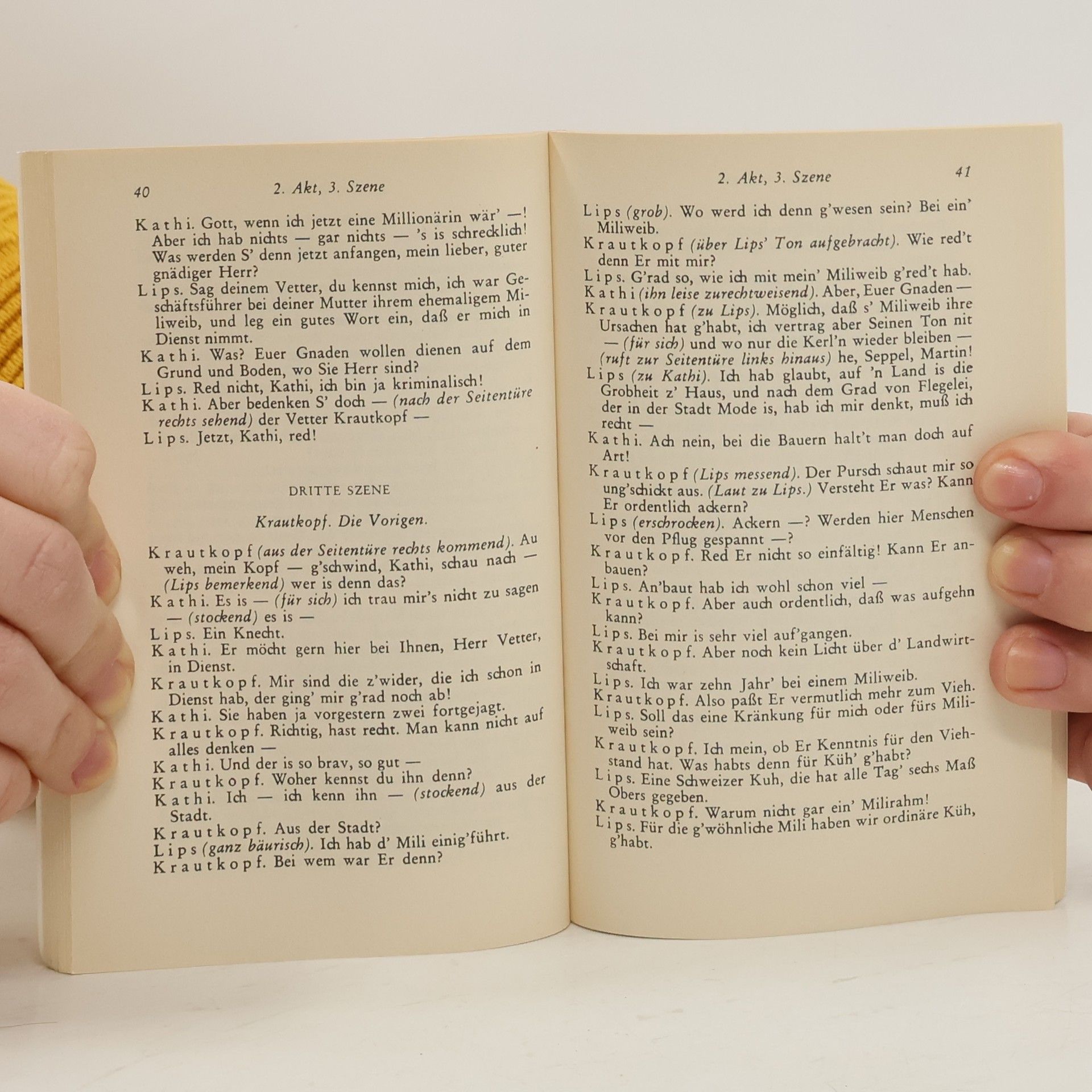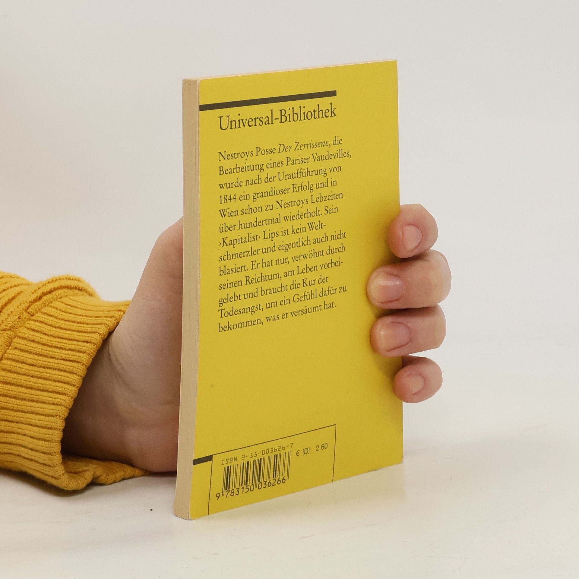 Nestroys Posse Der Zerrissene , die Bearbeitung eines Pariser Vaudevilles, wurde nach der Uraufführung von 1844 ein grandioser Erfolg und in Wien schon zu Nestroys Lebzeiten über hundertmal wiederholt. Sein ›Kapitalist‹ Lips ist kein Weltschmerzler und eigentlich auch nicht blasiert. Er hat nur, verwöhnt durch seinen Reichtum, am Leben vorbeigelebt und braucht die Kur der Todesangst, um ein Gefühl dafür zu bekommen, was er versäumt hat.