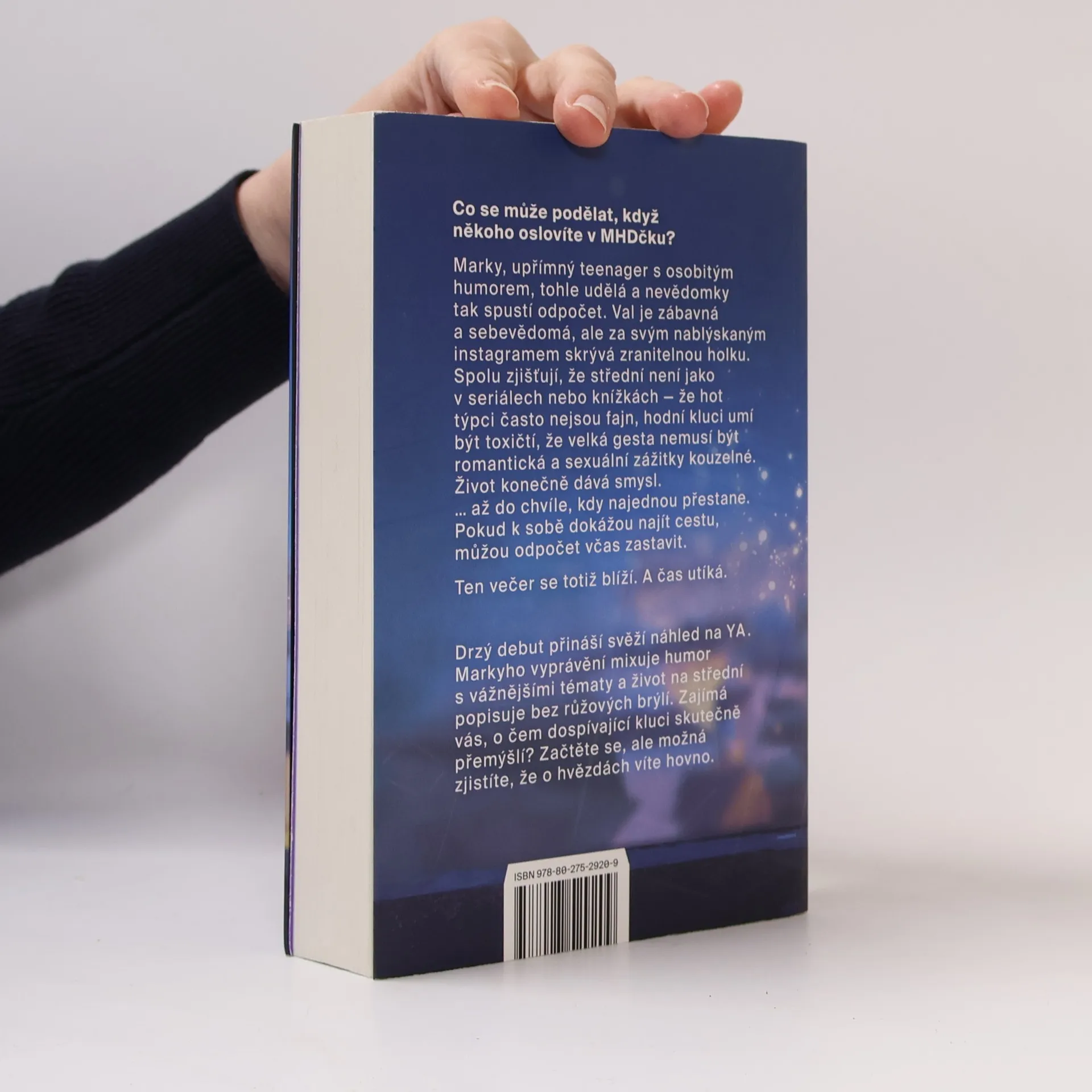 Co se může podělat, když někoho oslovíte v autobuse? Marky, upřímný teenager s osobitým humorem, tohle udělá a nevědomky tak spustí odpočet. Val je zábavná a sebevědomá, ale za svým nablýskaným instagramem skrývá zranitelnou holku. Spolu zjišťují, že střední není jako v seriálech nebo knížkách — že hot týpci často nejsou fajn, hodní kluci umí být toxičtí, že velká gesta nemusí být romantická a sexuální zážitky kouzelné. Život konečně dává smysl. … až do chvíle, kdy najednou přestane. Pokud k sobě dokážou najít cestu, můžou odpočet včas zastavit. Ten večer se totiž blíží. A čas utíká. Drzý debut přináší svěží náhled na YA. Markyho vyprávění mixuje humor s vážnějšími tématy a život na střední popisuje bez růžových brýlí. Zajímá vás, o čem kluci skutečně přemýšlí? Začtěte se, ale možná zjistíte, že o hvězdách víte hovno.