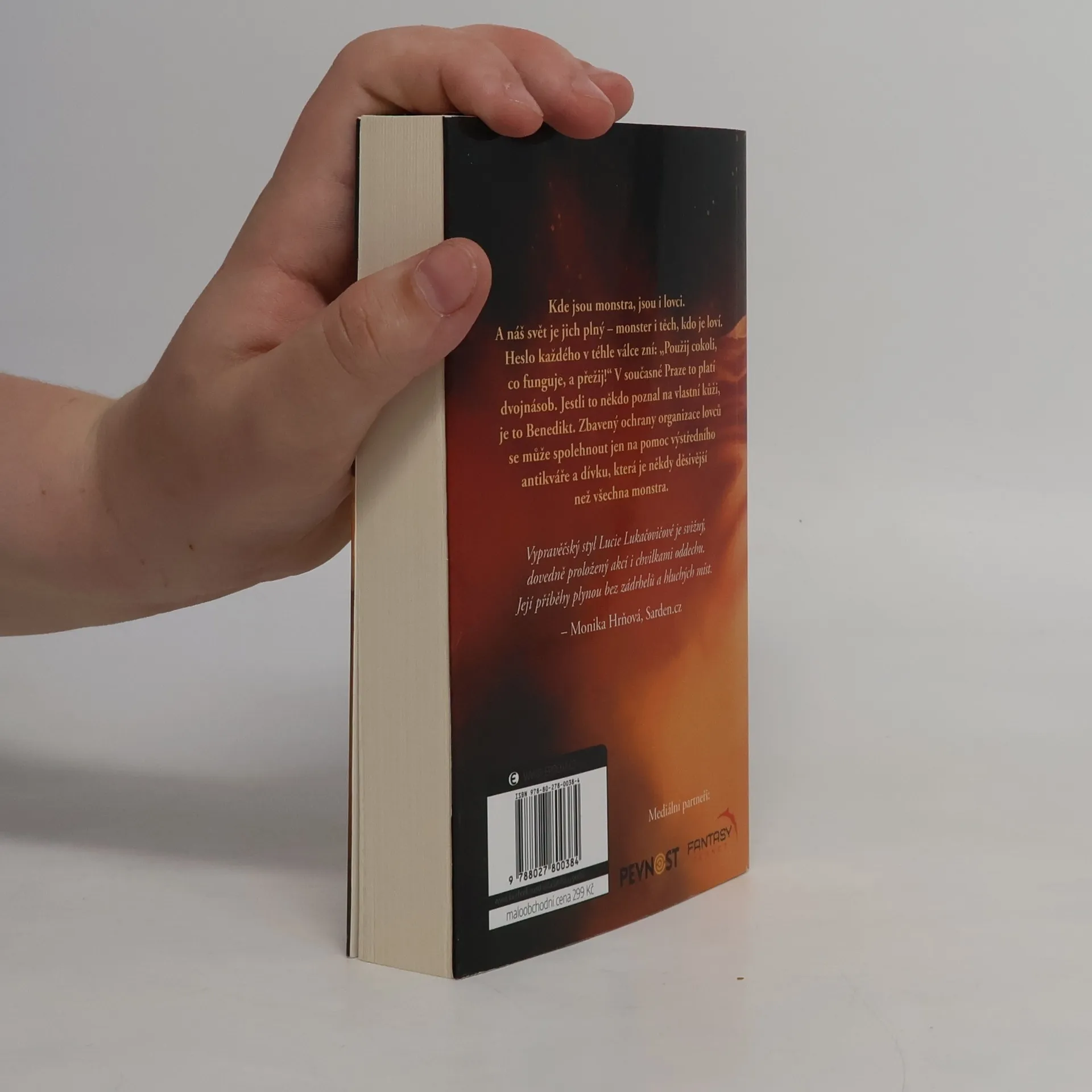 Kde jsou monstra, jsou i lovci. A náš svět je jich plný – monster i těch, kdo je loví. Heslo každého v téhle válce zní: „Použij cokoli, co funguje, a přežij!“ V současné Praze to platí dvojnásob. Jestli to někdo poznal na vlastní kůži, je to Benedikt. Zbavený ochrany organizace lovců se může spolehnout jen na pomoc výstředního antikváře a dívku, která je někdy děsivější než všechna monstra. Vypravěčský styl Lucie Lukačovičové je svižný, dovedně proložený akcí i chvilkami oddechu. Její příběhy plynou bez zádrhelů a hluchých míst. – Monika Hrňová, Sarden.cz