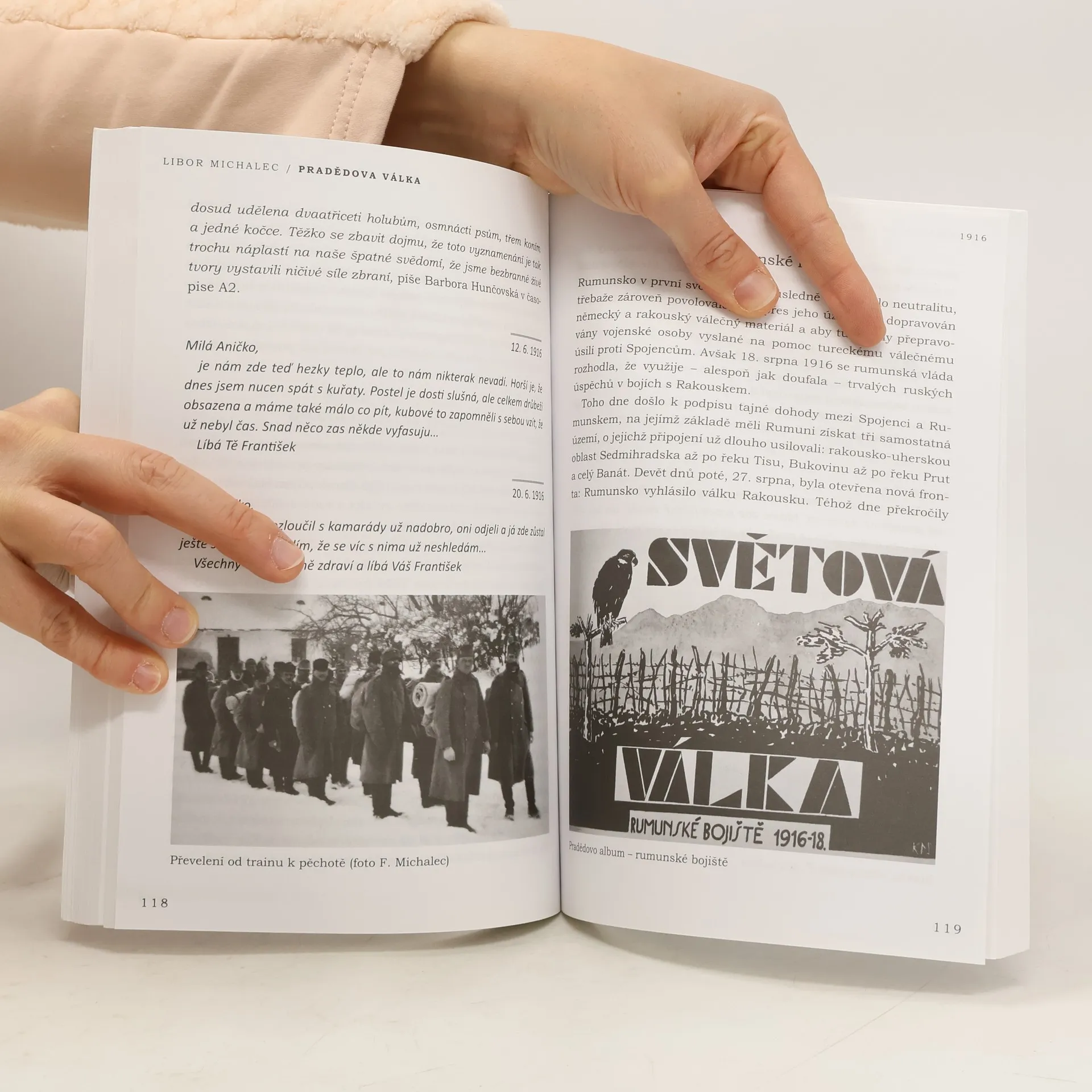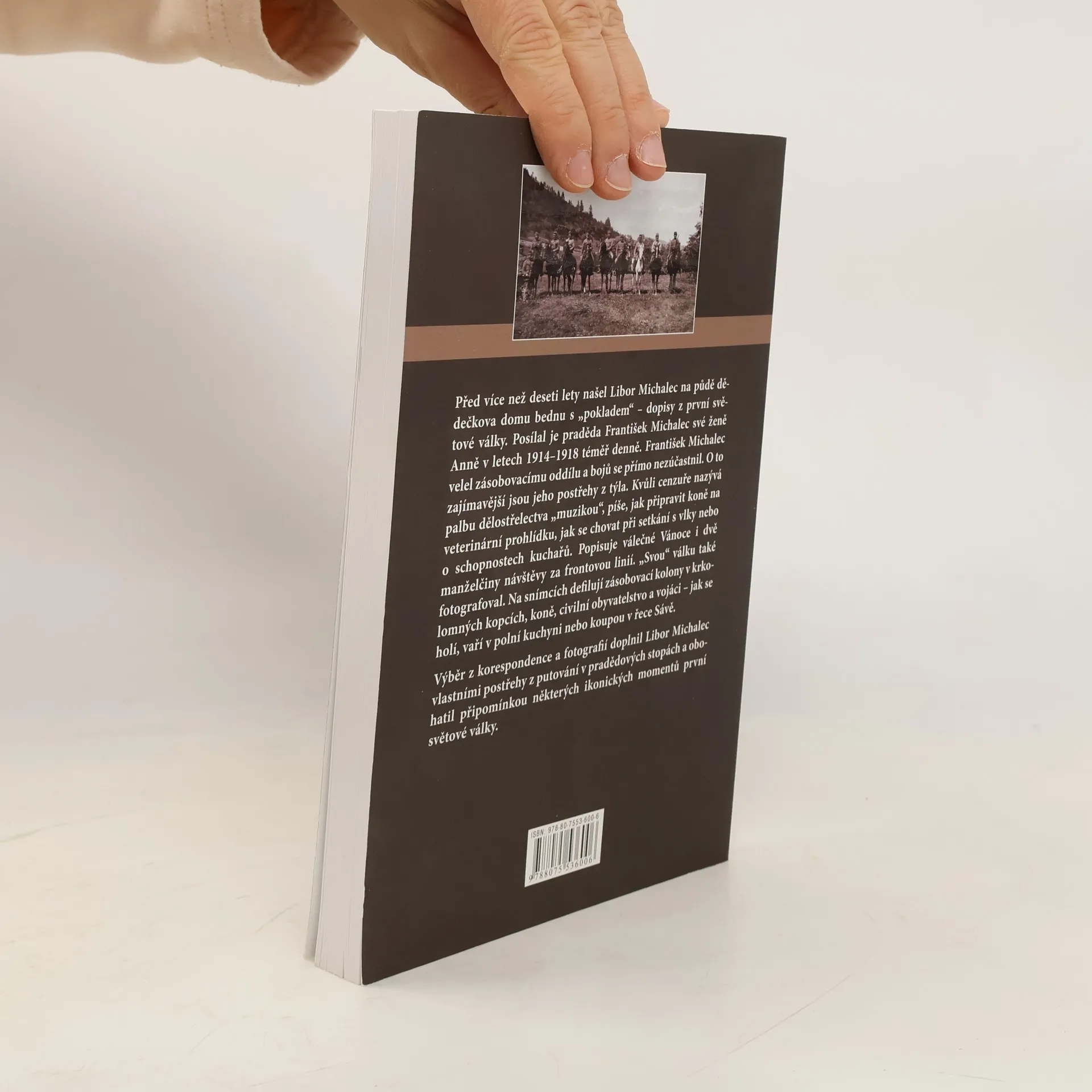 Před více než deseti lety našel Libor Michalec na půdě dědečkova domu bednu s „pokladem“ – dopisy z první světové války. Posílal je praděda František Michalec své ženě Anně v letech 1914–1918 téměř denně. František Michalec velel zásobovacímu oddílu a bojů se přímo nezúčastnil. O to zajímavější jsou jeho postřehy z týla. Kvůli cenzuře nazývá palbu dělostřelectva „muzikou“, píše, jak připravit koně na veterinární prohlídku, jak se chovat při setkání s vlky nebo o schopnostech kuchařů. Popisuje válečné Vánoce i dvě manželčiny návštěvy za frontovou linií. „Svou“ válku také fotografoval. Na snímcích defilují zásobovací kolony v krkolomných kopcích, koně, civilní obyvatelstvo a vojáci – jak se holí, vaří v polní kuchyni nebo koupou v řece Sávě. Výběr z korespondence a fotografií doplnil Libor Michalec vlastními postřehy z putování v pradědových stopách a obohatil připomínkou některých ikonických momentů první světové války.