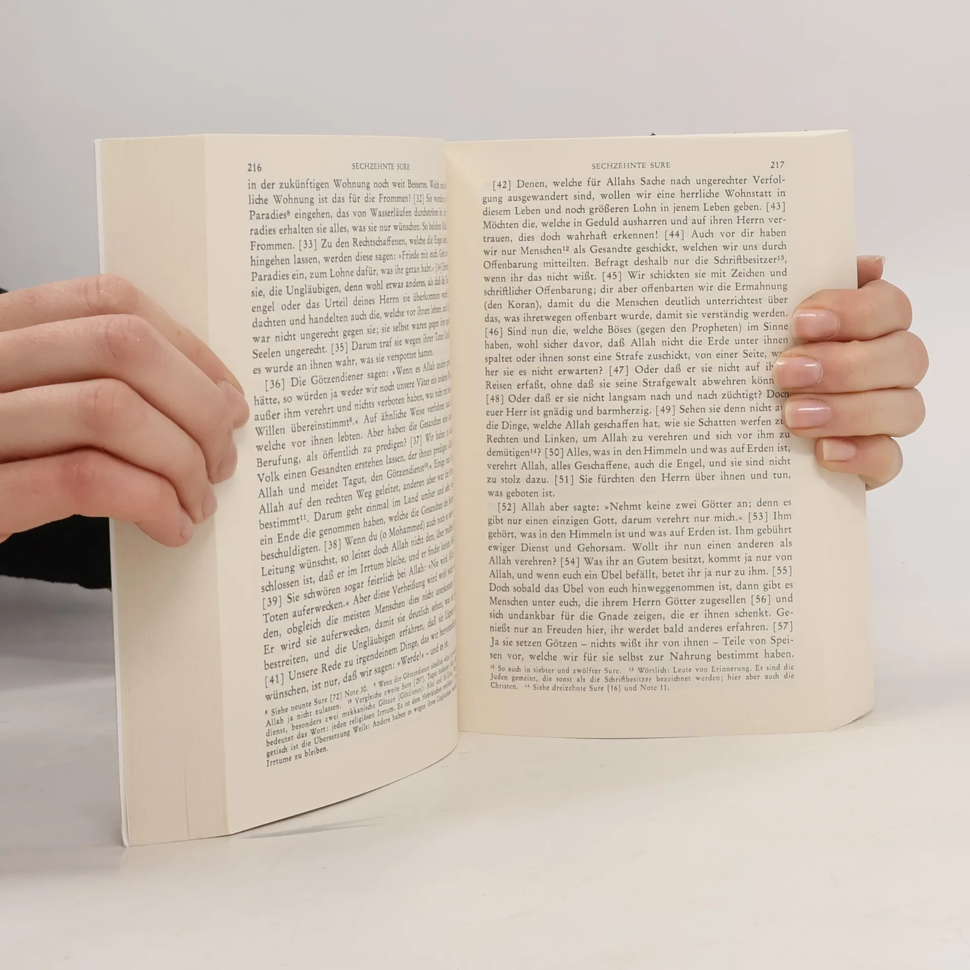 Der Koran (das 'oft zu lesende' Buch) ist die Heilige Schrift der Mohammedaner und bedeutet für die islamische Welt so viel wie das Alte Testament für die Juden oder das Neue für die Christen.§§Die einzelnen Teile des Korans wurden von Mohammed (570 - 632 n. Chr.) in den Jahren 610 - 632 in arabischer Sprache verkündigt: nicht als sein Wort, sondern als die ihm von Fall zu Fall zuteil gewordenen Offenbarungen Allahs, des 'alleinigen, einzigen Gottes seit Ewigkeit, des Welterschaffers und Herrn aller Weltenbewohner, der keinen Sohn und Helfer besitzt und benötigt'. Der Inhalt dieser religiösen Reden des Propheten ist vielfältig: Neben Gebeten und Predigten stehen allgemeine Rechtsvorschriften und Grundsätze der Glaubens- und Sittenlehre. Unverkennbar ist der jüdische und christliche Einfluß auf Sprache und Inhalt des Korans. Seine endgültige Gestalt erhielt er unter dem dritten Kalifen, Othman, um 653: Damals wurden die Verkündigungen Mohammeds in 114 Suren (Kapiteln) gesammelt.§§Die im Koran gepredigte Lehre heißt Islam ('Friede', 'Gottergebenheit'); sie verbreitete sich nach Mohammeds Tod bis zum heutigen Tag über weite Teile der Erde, früher in Kriegen, heute in friedlicher Mission. So hat der Koran das religiöse Antlitz der Welt entscheidend mitgeprägt.§§