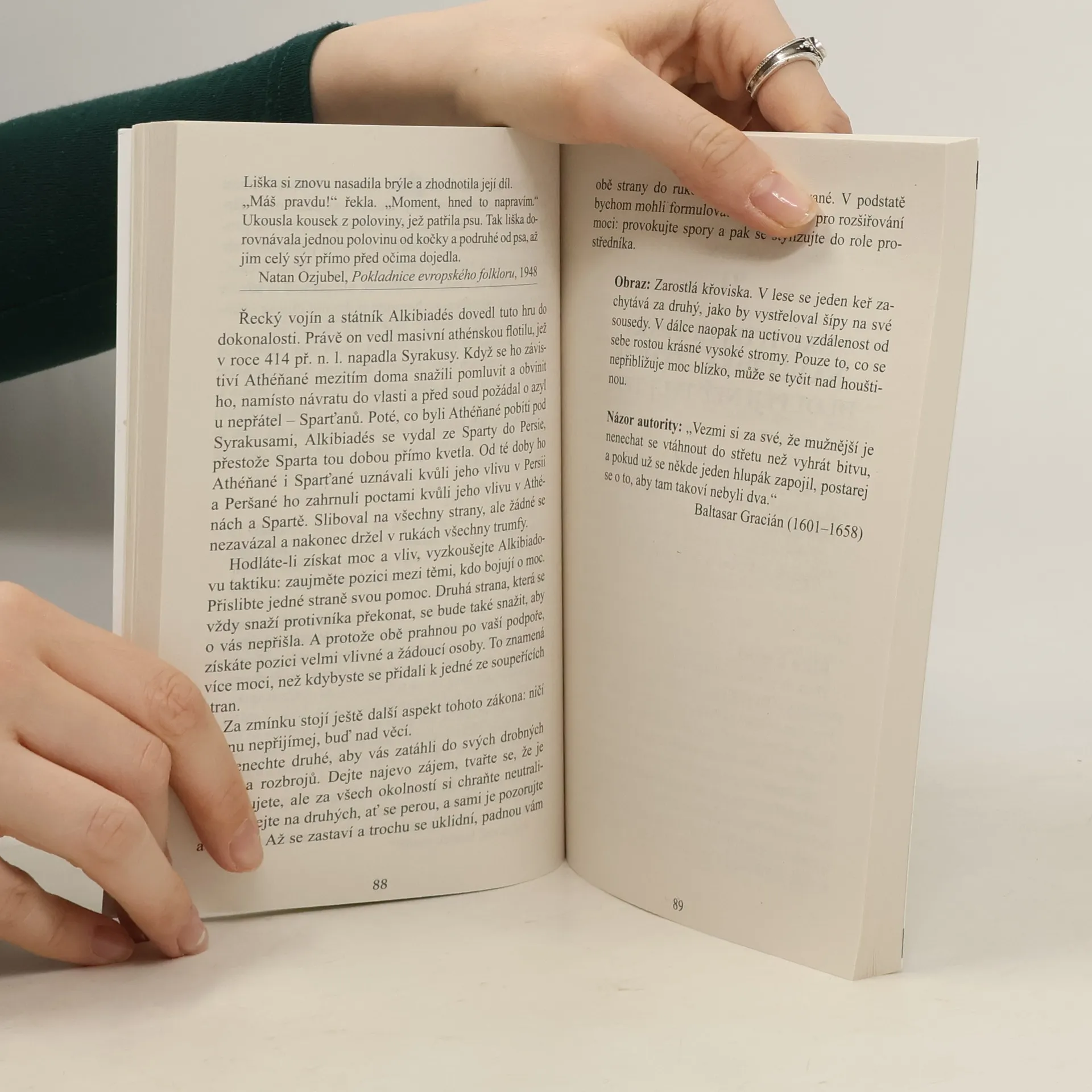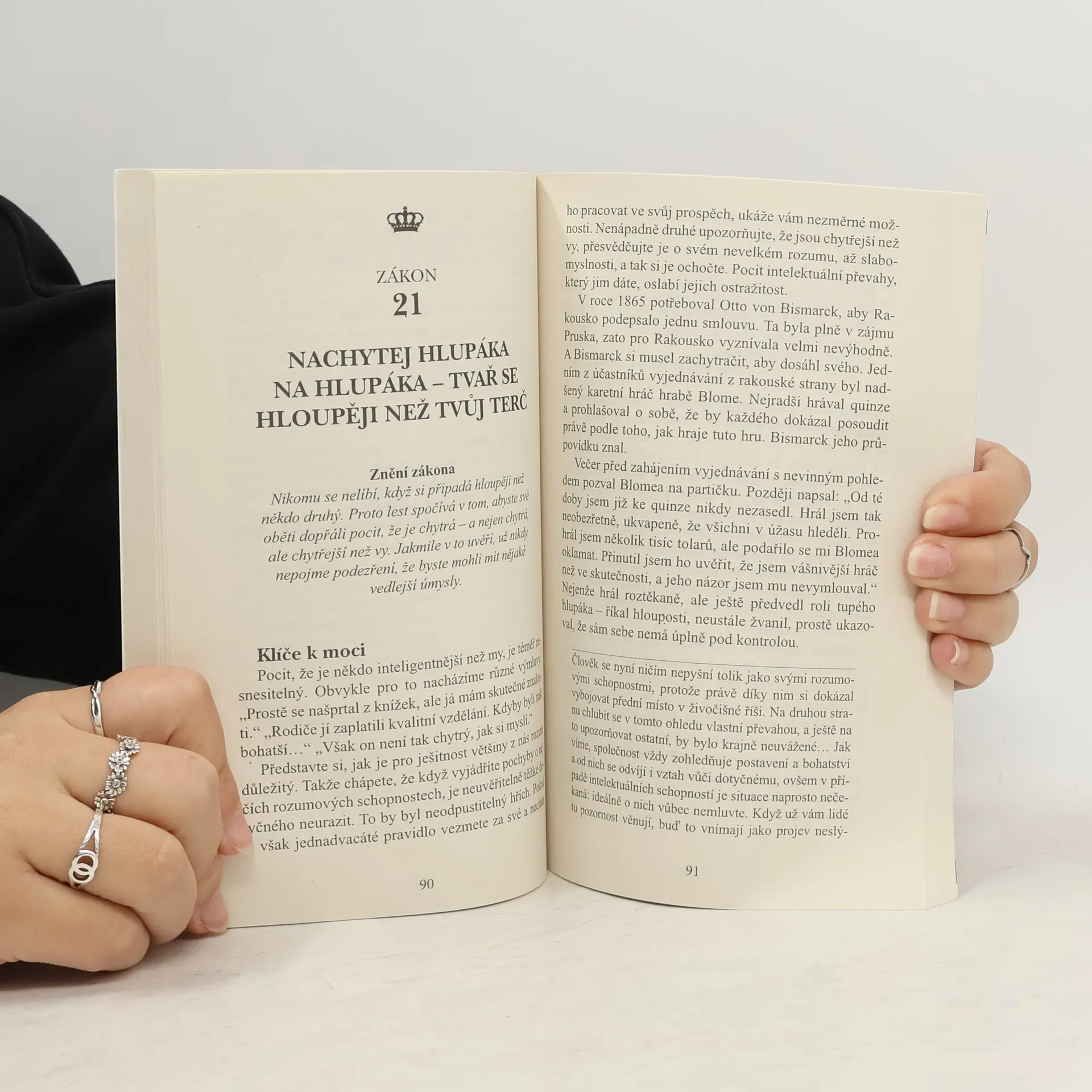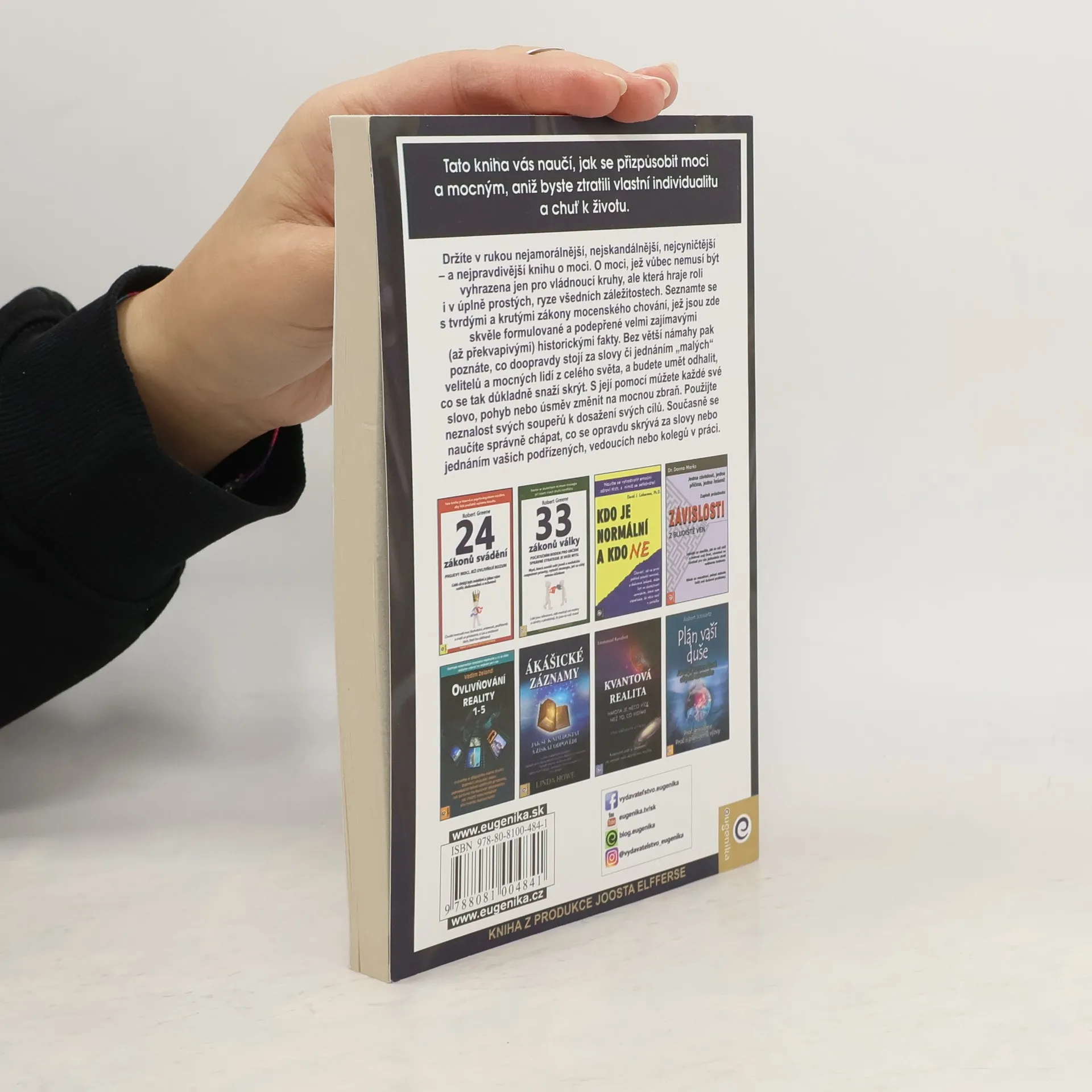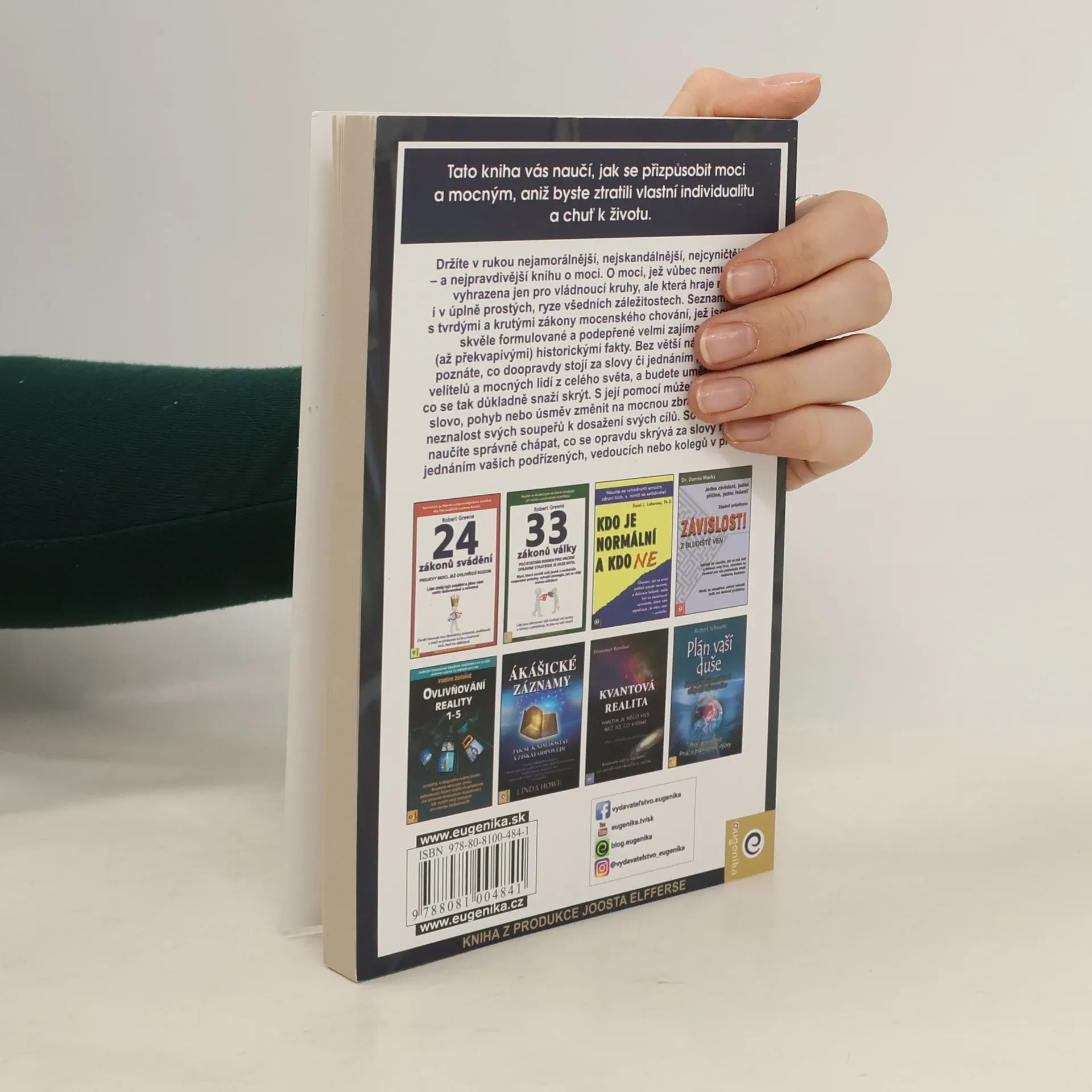 Kniha Roberta Greena z roku 1998 tematicky navazuje na Vladaře Niccola Machiavelliho a prezentuje zákony moci prostřednictvím reálných historických příběhů (např. Ludvík XIV., Talleyrand, Otto von Bismarck, Kateřina Veliká, Mao Ce-tung, Haile Selassie). Greene nechává čtenáře posoudit etiku používání těchto pravidel. Někteří ji považují za nástroj pro dosažení moci a úspěchu, jiní za praktickou příručku. Již dvě desetiletí je bestsellerem o moci a zůstává jednou z nejčtenějších knih na toto téma. Pokud se považujete za ambiciózní, kniha vás naučí rozpoznávat a ovládat myšlenky a přání druhých, což usnadní váš kariérní postup. Autor, expert na lidskou psychologii, poskytuje desítky příkladů správného jednání v konkrétních situacích a ukazuje, jak i z prohrané pozice lze směřovat k vítězství. Čtenář se seznámí s nestandardními metodami vyjednávání a řízení, přičemž každé tvrzení je podloženo konkrétními příklady. Kniha přehledně formuluje základní pravidla chování, která mají vědecký základ a doporučené postupy. S pomocí jejích rad můžete proměnit svá slova, pohyby či úsměvy na mocné nástroje. Naučíte se také správně chápat skryté úmysly za slovy a jednáním vašich kolegů či nadřízených.