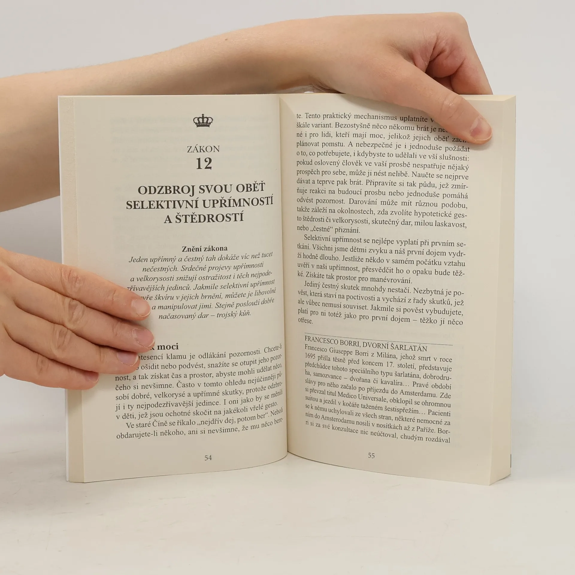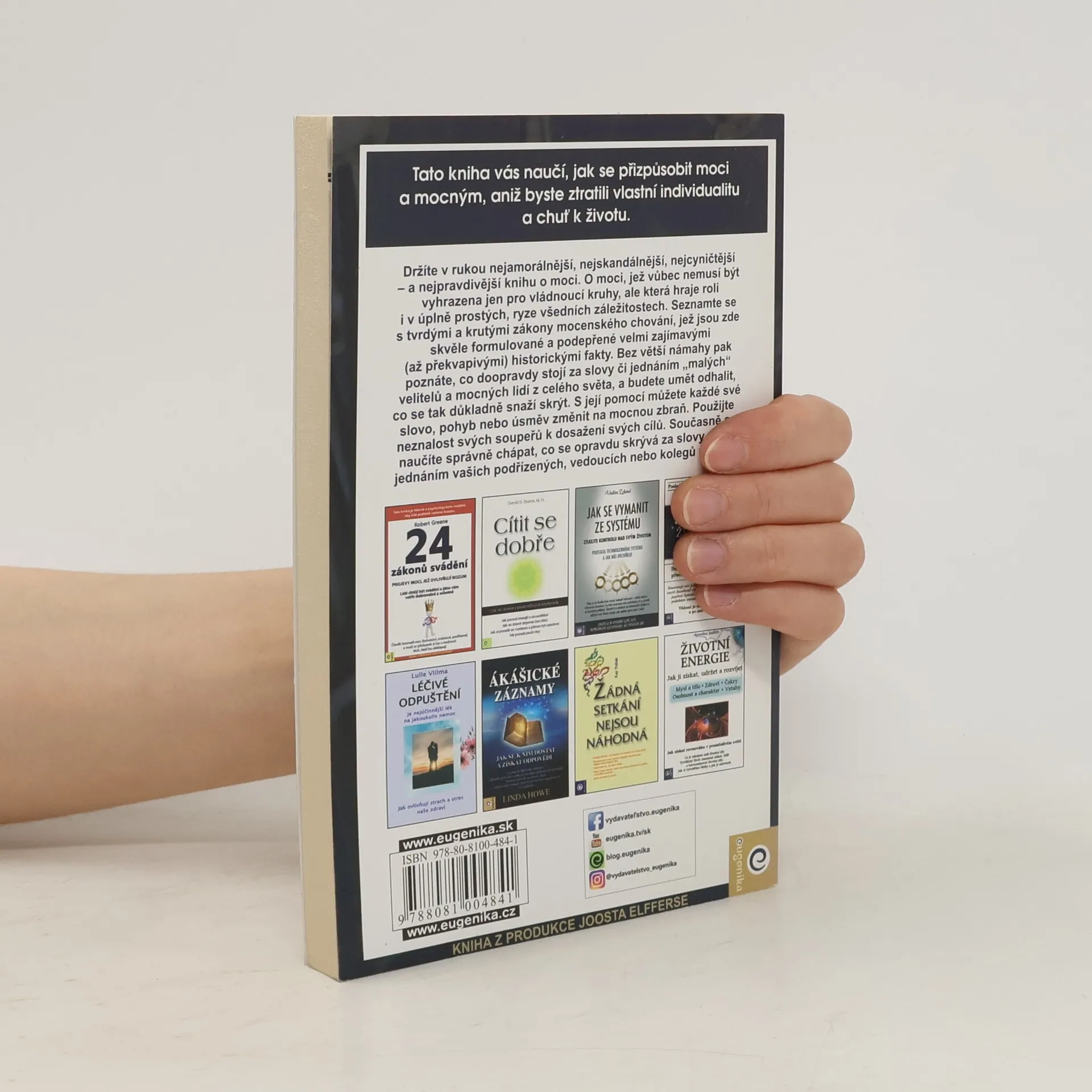 Kniha Roberta Greena z roku 1998 tematicky navazuje na Vladaře Niccola Machiavelliho a prezentuje zákony moci prostřednictvím reálných historických příběhů (např. Ludvík XIV., Talleyrand, Otto von Bismarck, Kateřina Veliká, Mao Ce-tung, Haile Selassie). Greene nechává čtenáře posoudit etiku používání těchto pravidel. Někteří ji považují za nástroj pro dosažení moci a úspěchu, jiní za praktickou příručku. Již dvě desetiletí je bestsellerem o moci a zůstává jednou z nejčtenějších knih na toto téma. Pokud se považujete za ambiciózní, kniha vás naučí rozpoznávat a ovládat myšlenky a přání druhých, což usnadní váš kariérní postup. Autor, expert na lidskou psychologii, poskytuje desítky příkladů správného jednání v konkrétních situacích a ukazuje, jak i z prohrané pozice lze směřovat k vítězství. Čtenář se seznámí s nestandardními metodami vyjednávání a řízení, přičemž každé tvrzení je podloženo konkrétními příklady. Kniha přehledně formuluje základní pravidla chování, která mají vědecký základ a doporučené postupy. S pomocí jejích rad můžete proměnit svá slova, pohyby či úsměvy na mocné nástroje. Naučíte se také správně chápat skryté úmysly za slovy a jednáním vašich kolegů či nadřízených.
