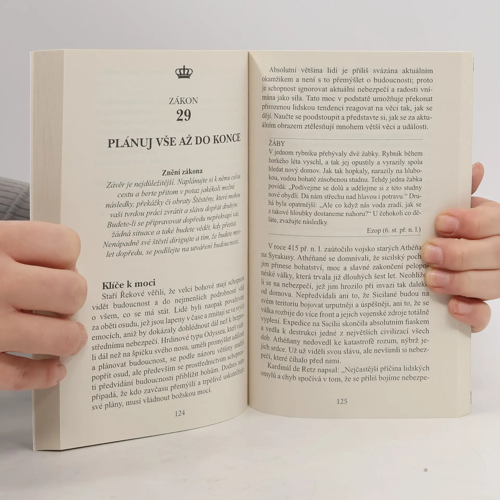 Kniha Roberta Greena z roku 1998; tematicky je velmi blízká Vladaři Niccolo Machiavelliho. Jednotlivé zákony moci jsou postupně demonstrovány pomocí reálných příběhů ze světové historie (Ludvík XIV., Talleyrand, Otto von Bismarck, Kateřina Veliká, Mao Ce-tung, Haile Selassie a řada jiných). Greene ponechává na čtenáři, aby si sám udělal úsudek, nakolik je používání těchto pravidel etické. Někdo nazývá tuto knihu nástroj pro ty, kteří chtějí dosáhnout moc a úspěch. Jiný si myslí, že je to hlavně praktická příručka pro každou příležitost. Pravdou však je, že již dvě desetiletí je to nejprodávanější kniha o fungování moci a zůstane ještě dlouho jednou z nejčtenějších knih na světě na toto téma. Pokud si o sobě myslíte, že jste ambiciózní, pak je tato kniha pro vás. Naučí vás poznat a ovládnout myšlenky i přání druhých. V návaznosti na rady autora pro vás bude mnohem snazší postupovat po kariérním žebříčku směrem nahoru. Naučíte se chápat, na jaké pozici se nacházejí vaši vůdci, a správně to využít ve svůj prospěch. A to není fikce! Autor je velký znalec lidské psychologie a ví, co říká. Jeho kniha pomohla tisícům lidí, aby realizovali své plány. Autor popisuje desítky příkladů správného konání v konkrétních situacích. Na skutečných příbězích ukazuje, jak i z prohrané pozice můžete směřovat k vítězství. Čtenář se setká s nestandardními metodami vyjednávání a řízení. Každé své tvrzení autor dokumentuje na konkrétních příkladech. Bestseller 48 Zákonů moci seznámí čtenáře se základními pravidly chování. Každý postulát v knize je jasně a srozumitelně formulovaný. Všechny zde uvedené zákony mají vědecký základ a doporučené konkrétní způsoby řízení. S pomocí jeho rad můžete každé své slovo, pohyb nebo úsměv změnit na mocnou zbraň. Použijte neznalost svých soupeřů k dosažení svých cílů. Současně se naučíte správně chápat, co se opravdu skrývá za slovy nebo jednáním vašich podřízených, vedoucích nebo kolegy v práci.