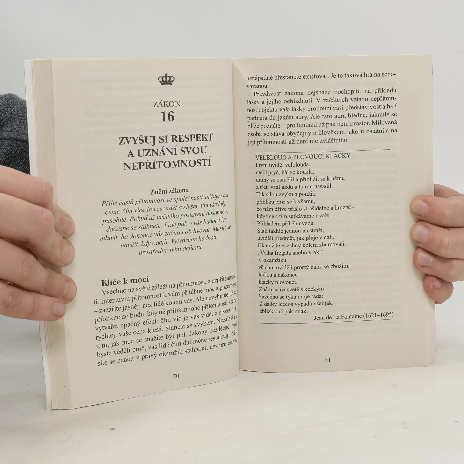 Kniha Roberta Greena z roku 1998 tematicky navazuje na Vladaře Niccola Machiavelliho a prezentuje zákony moci prostřednictvím reálných historických příběhů (např. Ludvík XIV., Talleyrand, Otto von Bismarck, Kateřina Veliká, Mao Ce-tung, Haile Selassie). Greene nechává čtenáře posoudit etiku používání těchto pravidel. Někteří ji považují za nástroj pro dosažení moci a úspěchu, jiní za praktickou příručku. Již dvě desetiletí je bestsellerem o moci a zůstává jednou z nejčtenějších knih na toto téma. Pokud se považujete za ambiciózní, kniha vás naučí rozpoznávat a ovládat myšlenky a přání druhých, což usnadní váš kariérní postup. Autor, expert na lidskou psychologii, poskytuje desítky příkladů správného jednání v konkrétních situacích a ukazuje, jak i z prohrané pozice lze směřovat k vítězství. Čtenář se seznámí s nestandardními metodami vyjednávání a řízení, přičemž každé tvrzení je podloženo konkrétními příklady. Kniha přehledně formuluje základní pravidla chování, která mají vědecký základ a doporučené postupy. S pomocí jejích rad můžete proměnit svá slova, pohyby či úsměvy na mocné nástroje. Naučíte se také správně chápat skryté úmysly za slovy a jednáním vašich kolegů či nadřízených.