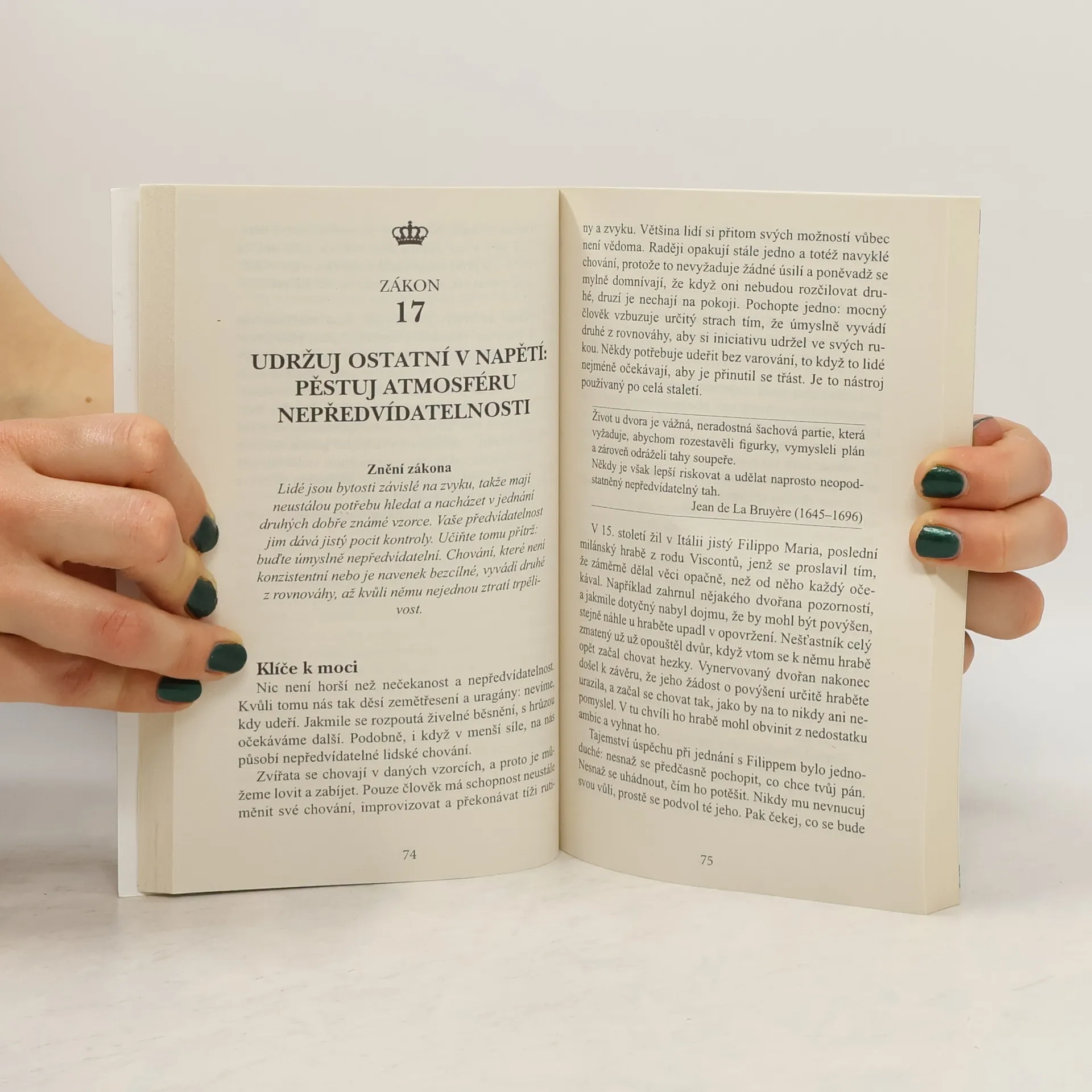 Kniha Roberta Greena z roku 1998 tematicky navazuje na Vladaře Niccola Machiavelliho a prezentuje zákony moci prostřednictvím reálných historických příběhů (např. Ludvík XIV., Talleyrand, Otto von Bismarck, Kateřina Veliká, Mao Ce-tung, Haile Selassie). Greene nechává čtenáře posoudit etiku používání těchto pravidel. Někteří ji považují za nástroj pro dosažení moci a úspěchu, jiní za praktickou příručku. Již dvě desetiletí je bestsellerem o moci a zůstává jednou z nejčtenějších knih na toto téma. Pokud se považujete za ambiciózní, kniha vás naučí rozpoznávat a ovládat myšlenky a přání druhých, což usnadní váš kariérní postup. Autor, expert na lidskou psychologii, poskytuje desítky příkladů správného jednání v konkrétních situacích a ukazuje, jak i z prohrané pozice lze směřovat k vítězství. Čtenář se seznámí s nestandardními metodami vyjednávání a řízení, přičemž každé tvrzení je podloženo konkrétními příklady. Kniha přehledně formuluje základní pravidla chování, která mají vědecký základ a doporučené postupy. S pomocí jejích rad můžete proměnit svá slova, pohyby či úsměvy na mocné nástroje. Naučíte se také správně chápat skryté úmysly za slovy a jednáním vašich kolegů či nadřízených.