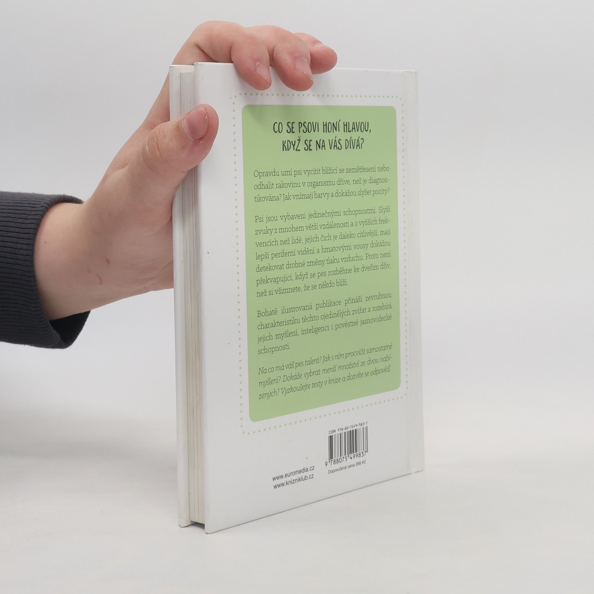 Pokud patříte k obvyklým majitelům psů, máte ke svému čtyřnohému příteli zhruba stejně blízký vztah jako ke kterémukoli jinému členu rodiny. Sdílíte s ním obvyklé každodenní činnosti, hrajete si i společně odpočíváte Kolik toho ale vlastně víte o tom, co se odehrává v jeho chlupaté hlavě? Předpokládáte, že jeho smysly jsou víceméně stejné jako lidské? Vědecké studie týkající se psů bývaly ještě nedávno vzácné, ale v současnosti už je naštěstí všechno jinak. Během posledních dvou dekád se dříve opomíjené výzkumné projekty na téma inteligence a vědomí psů vyšvihly na výsluní popularity. Rozličné univerzity po celém světě zakládají laboratoře pro výzkum chování psů a zabývají se nejrůznějšími aspekty psího vnímání a chování. Výsledky jejich práce přehledně shrnuje tato publikace.