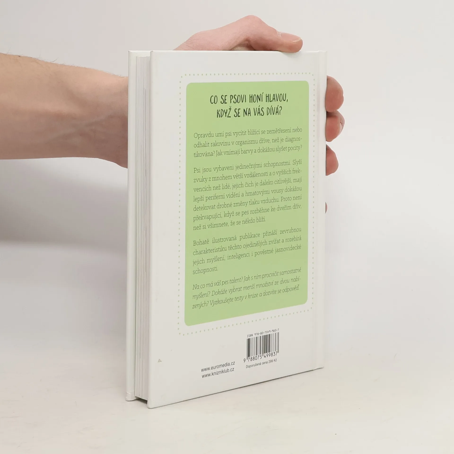 Pokud patříte k obvyklým majitelům psů, máte ke svému čtyřnohému příteli zhruba stejně blízký vztah jako ke kterémukoli jinému členu rodiny. Sdílíte s ním obvyklé každodenní činnosti, hrajete si i společně odpočíváte Kolik toho ale vlastně víte o tom, co se odehrává v jeho chlupaté hlavě? Předpokládáte, že jeho smysly jsou víceméně stejné jako lidské? Vědecké studie týkající se psů bývaly ještě nedávno vzácné, ale v současnosti už je naštěstí všechno jinak. Během posledních dvou dekád se dříve opomíjené výzkumné projekty na téma inteligence a vědomí psů vyšvihly na výsluní popularity. Rozličné univerzity po celém světě zakládají laboratoře pro výzkum chování psů a zabývají se nejrůznějšími aspekty psího vnímání a chování. Výsledky jejich práce přehledně shrnuje tato publikace.