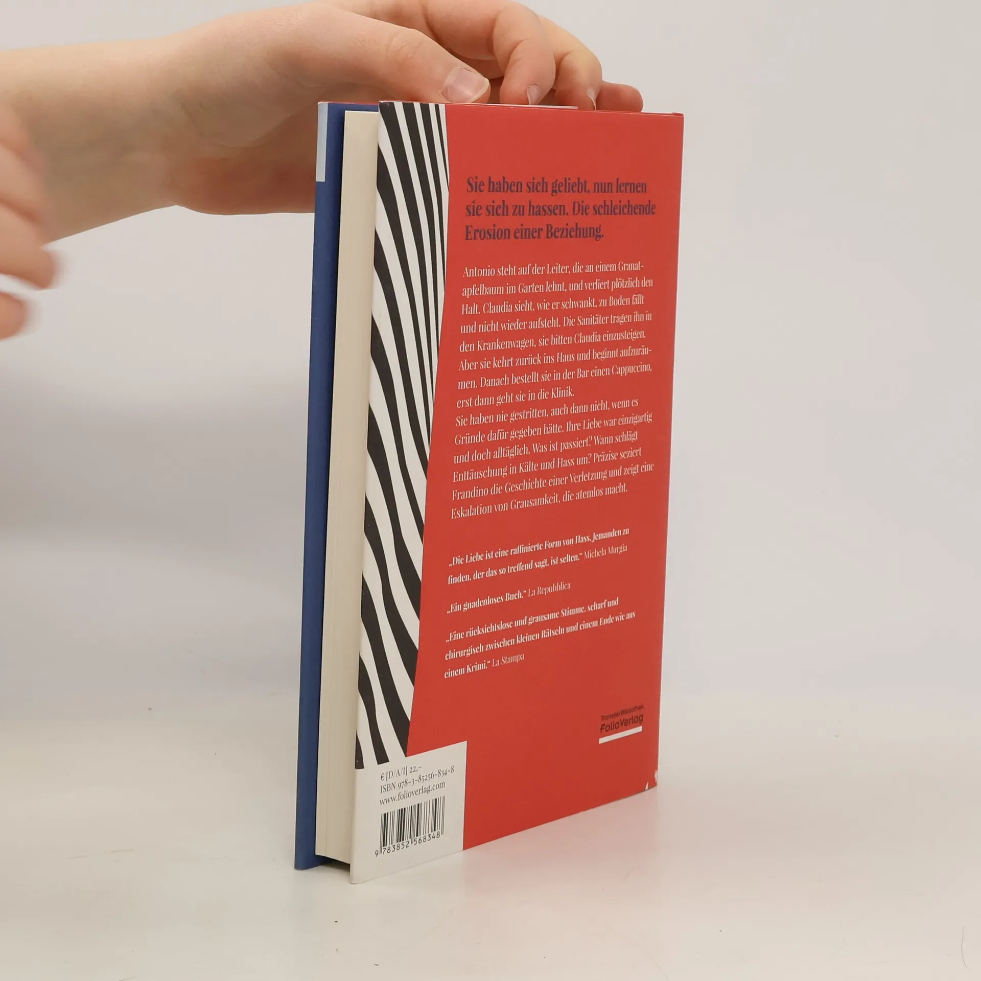 Sie haben sich geliebt, nun lernen sie sich zu hassen. Die schleichende Erosion einer Beziehung. Antonio steht auf der Leiter, die an einem Granatapfelbaum im Garten lehnt, und verliert plötzlich den Halt. Claudia sieht, wie er schwankt, zu Boden fällt und nicht wieder aufsteht. Die Sanitäter tragen ihn in den Krankenwagen, sie bitten Claudia einzusteigen. Aber sie kehrt zurück ins Haus und beginnt aufzuräumen. Danach bestellt sie in der Bar einen Cappuccino, erst dann geht sie in die Klinik. Sie haben nie gestritten, auch dann nicht, wenn es Gründe dafür gegeben hätte. Ihre Liebe war einzigartig und doch alltäglich. Was ist passiert? Wann schlägt Enttäuschung in Kälte und Hass um? Präzise seziert Frandino die Geschichte einer Verletzung und zeigt eine Eskalation von Grausamkeit, die atemlos macht.