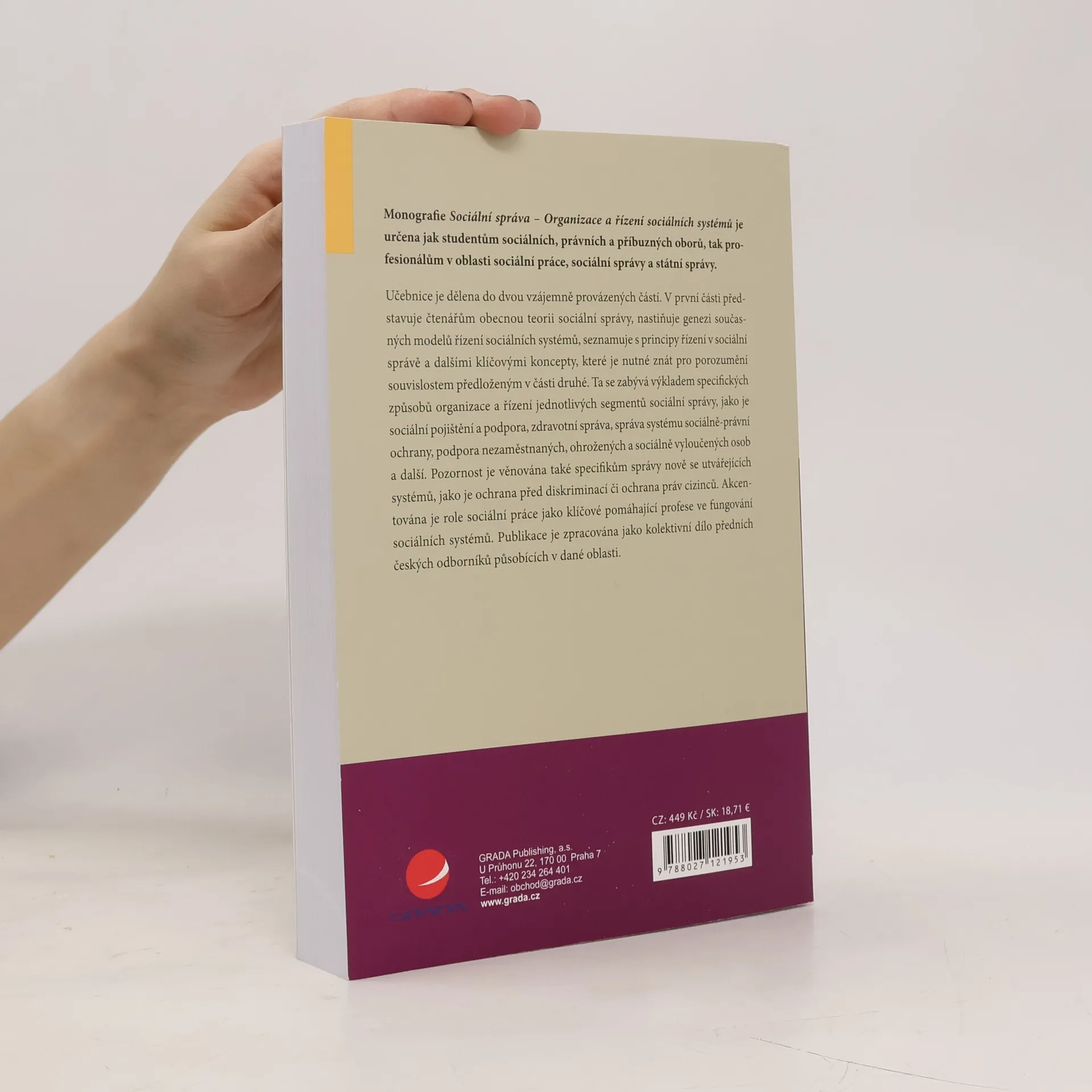 Monografie Sociální správa – Organizace a řízení sociálních systémů je určena jak studentům sociálních, právních a příbuzných oborů, tak profesionálům v oblasti sociální práce, sociální správy a státní správy. Učebnice je dělena do dvou vzájemně provázených částí. V první části představuje čtenářům obecnou teorii sociální správy, nastiňuje genezi současných modelů řízení sociálních systémů, seznamuje s principy řízení v sociální správě a dalšími klíčovými koncepty, které je nutné znát pro porozumění souvislostem předloženým v části druhé. Ta se zabývá výkladem specifických způsobů organizace a řízení jednotlivých segmentů sociální správy, jako je sociální pojištění a podpora, zdravotní správa, správa systému sociálně-právní ochrany, podpora nezaměstnaných, ohrožených a sociálně vyloučených osob a další. Pozornost je věnována také specifikům správy nově se utvářejících systémů, jako je ochrana před diskriminací či ochrana práv cizinců. Akcentována je role sociální práce jako klíčové pomáhající profese ve fungování sociálních systémů. Publikace je zpracována jako kolektivní dílo předních českých odborníků působících v dané oblasti.